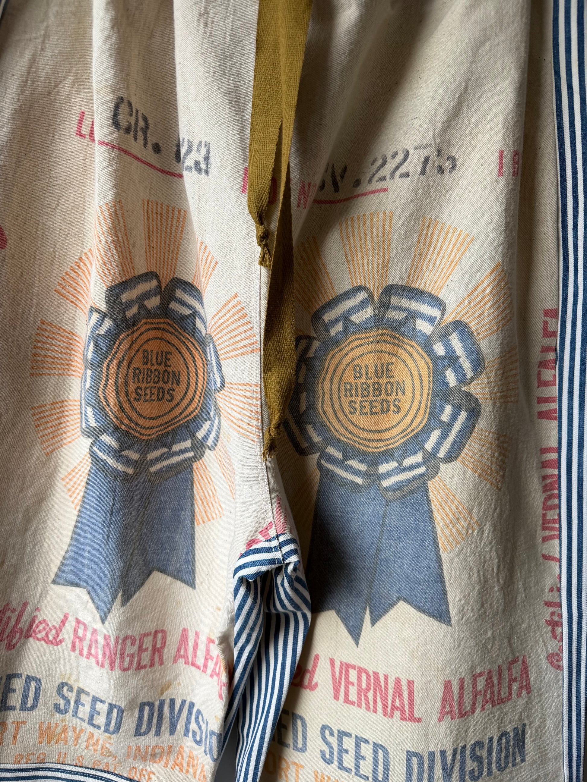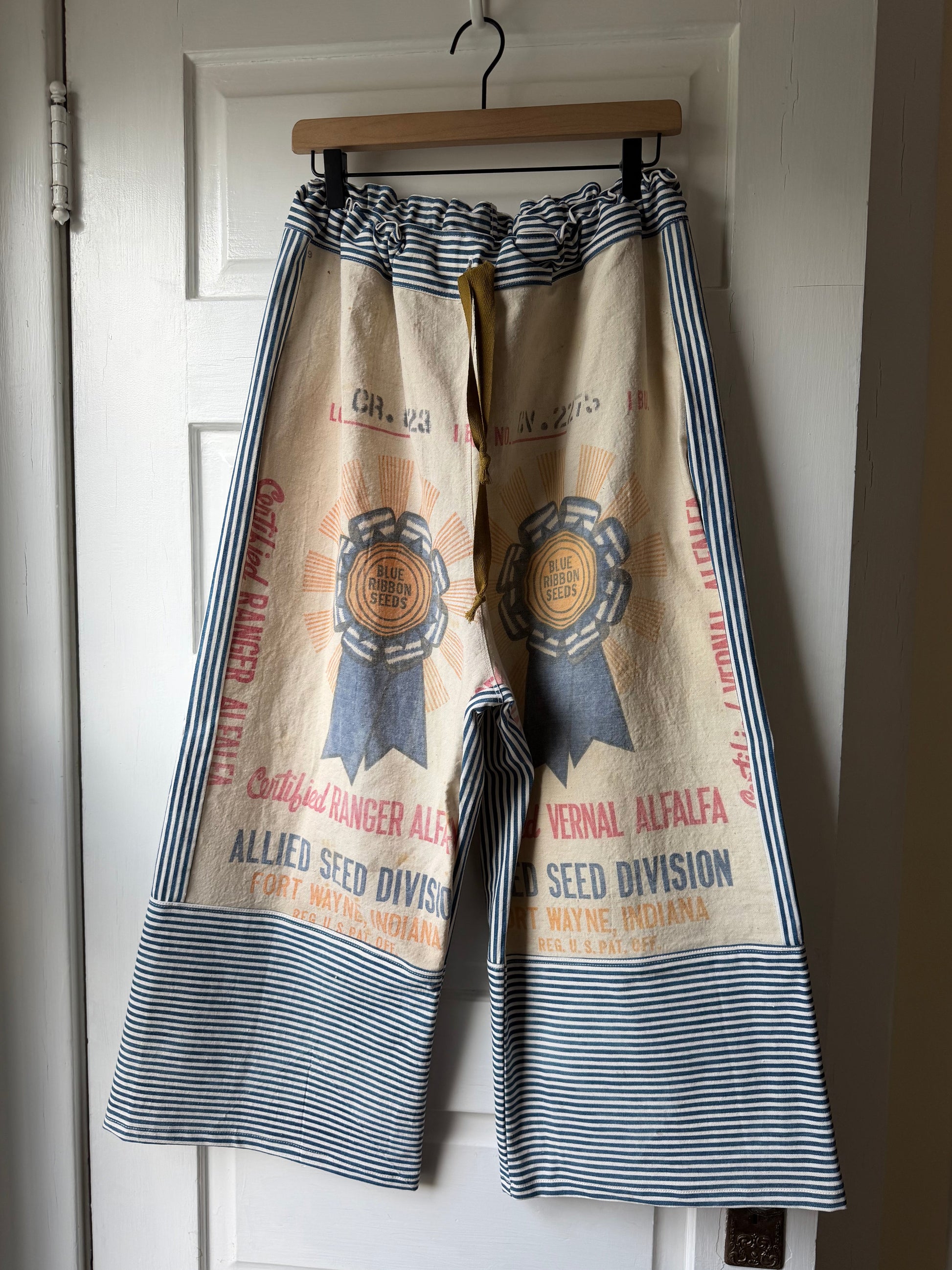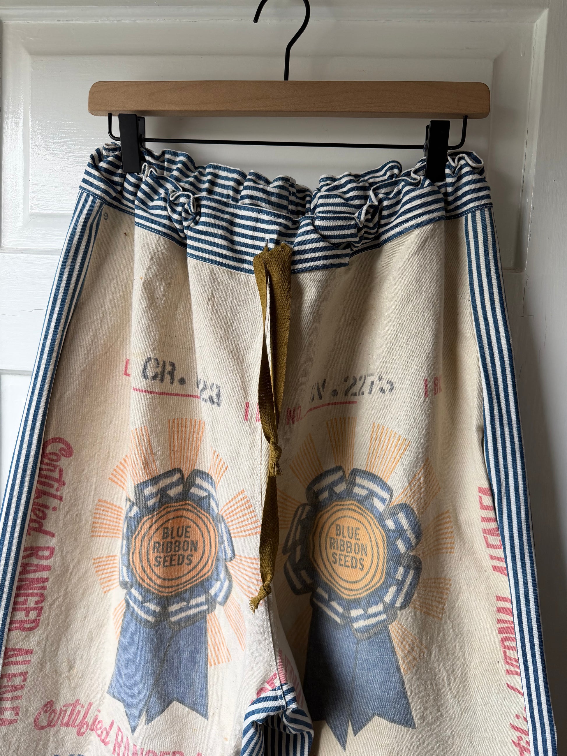 Handmade, one of a kind pull on pants. Made out of two vintage Blue Ribbon feedsacks and vintage blue and white striped ticking fabric.
