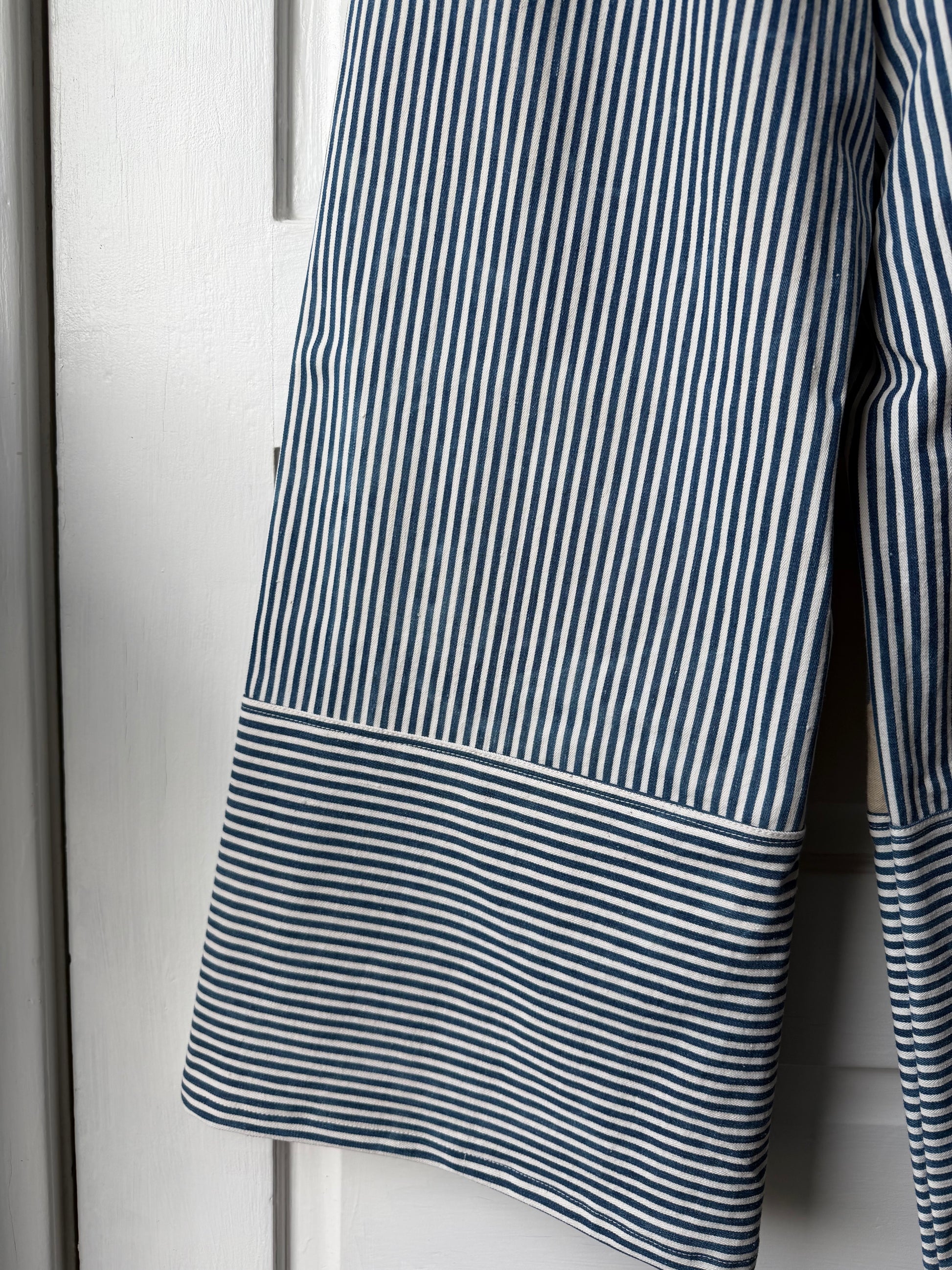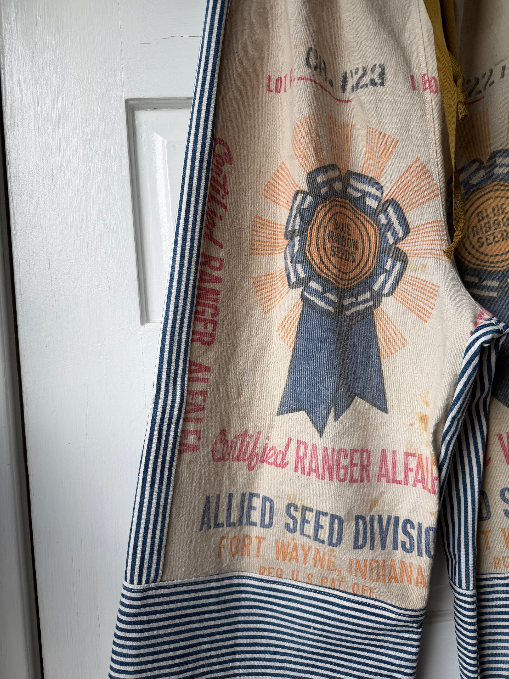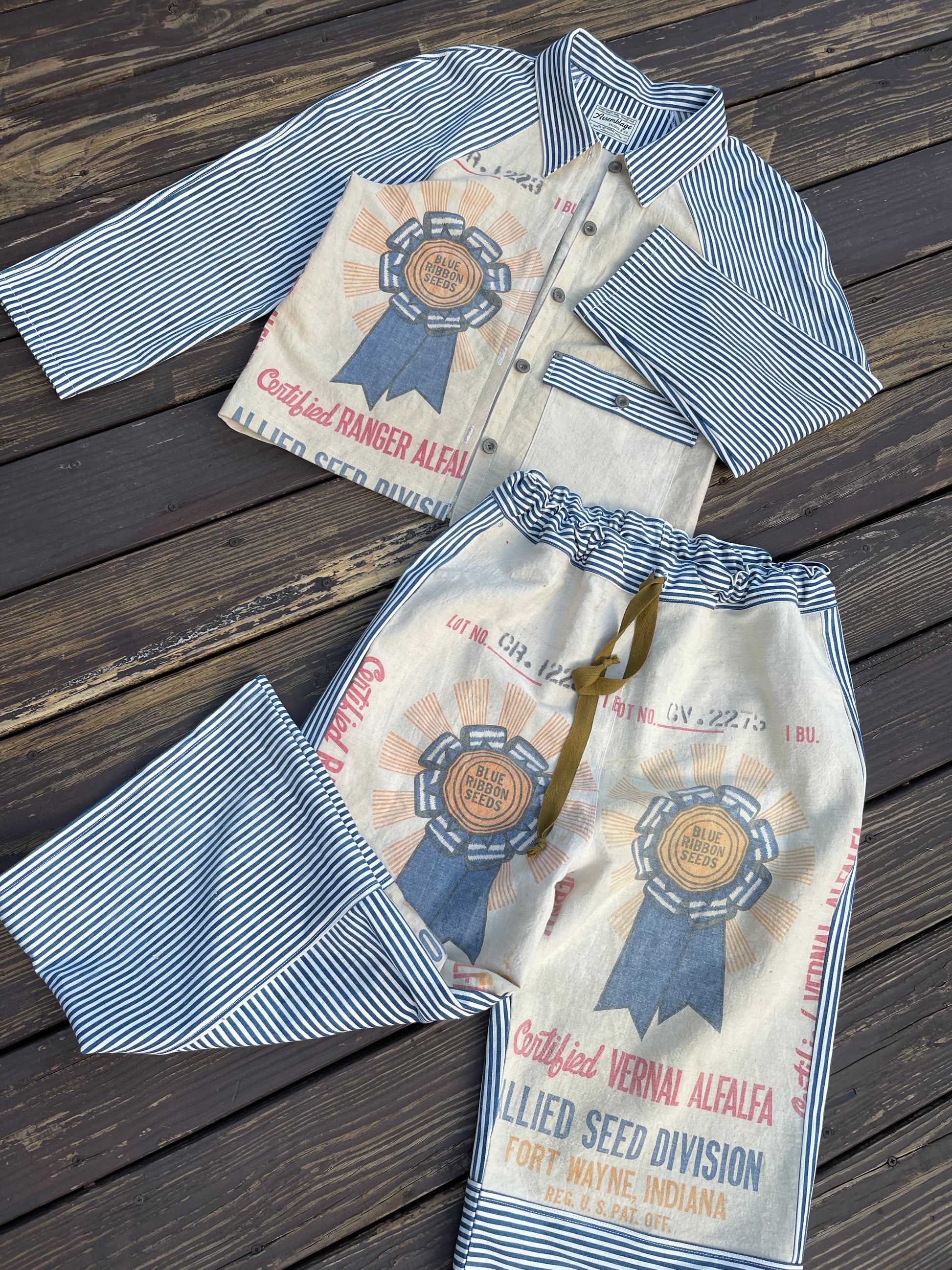 Handmade, one of a kind pull on pants. Made out of two vintage Blue Ribbon feedsacks and vintage blue and white striped ticking fabric.