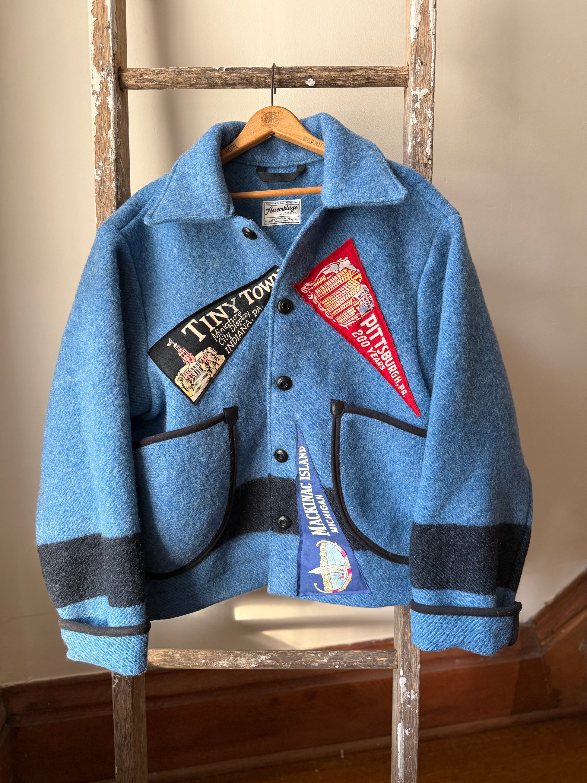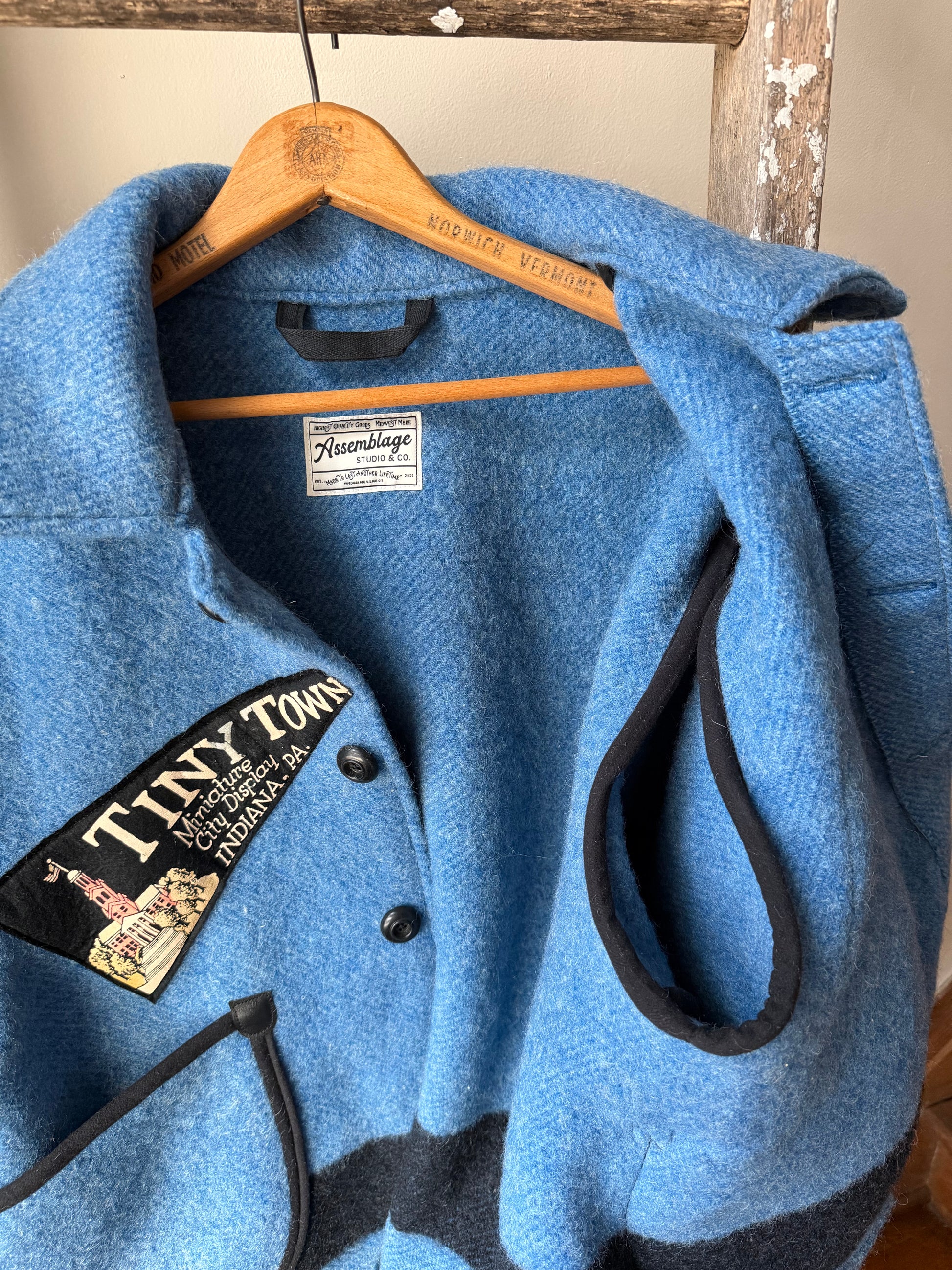 Handmade, one of a kind jacket made out of a vintage 100% wool blanket. Beautiful blue color with a black stripe. This is unlined but is a heavyweight wool.