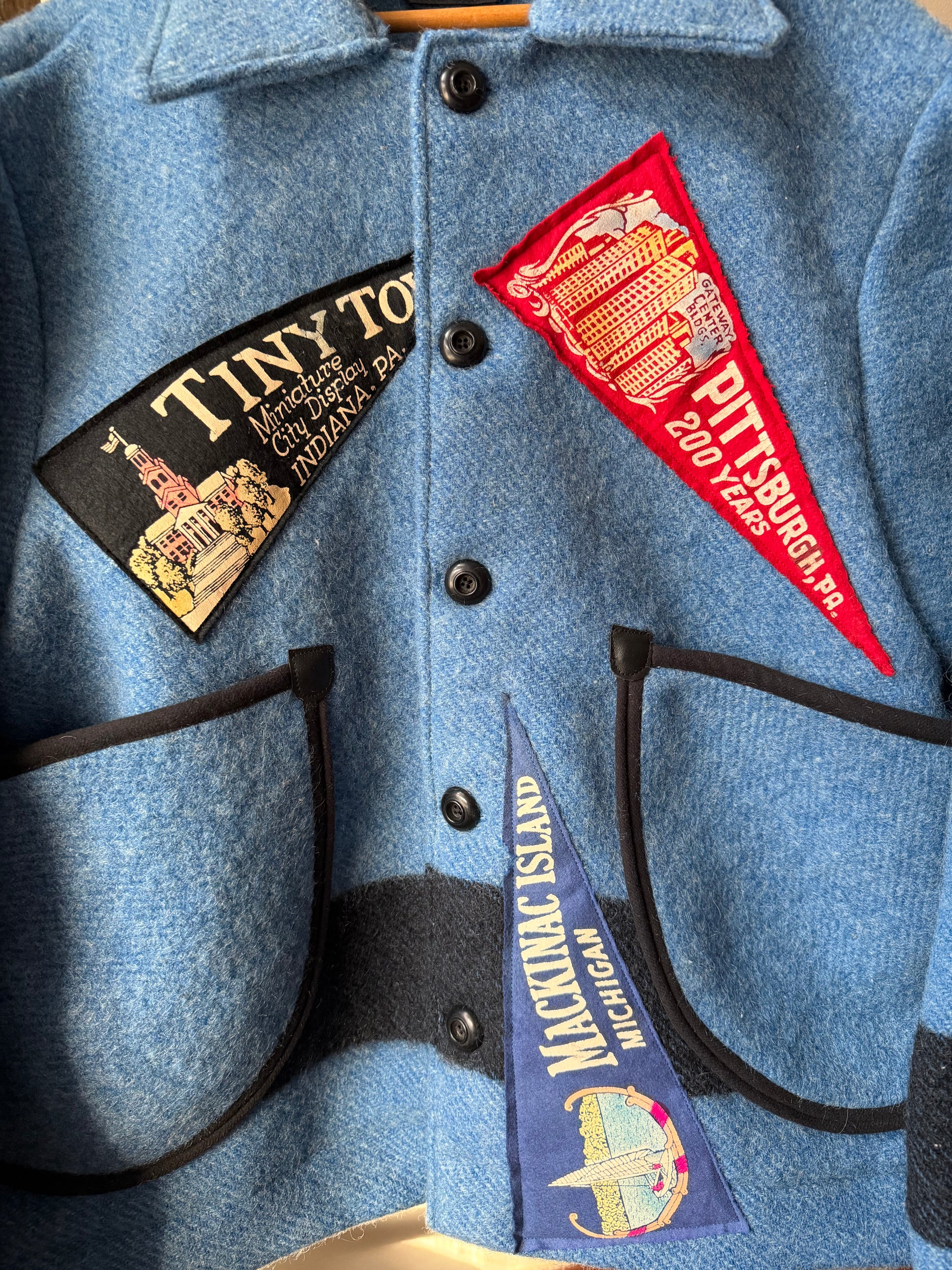Finished with chunky black antique buttons. Vintage felt pennants across front. Two hand warmer pockets. All of the seams are finished with bias tape or the original blanket stitch. I designed the sleeves to have a roll up cuff that can be adjusted to your arm length when worn.