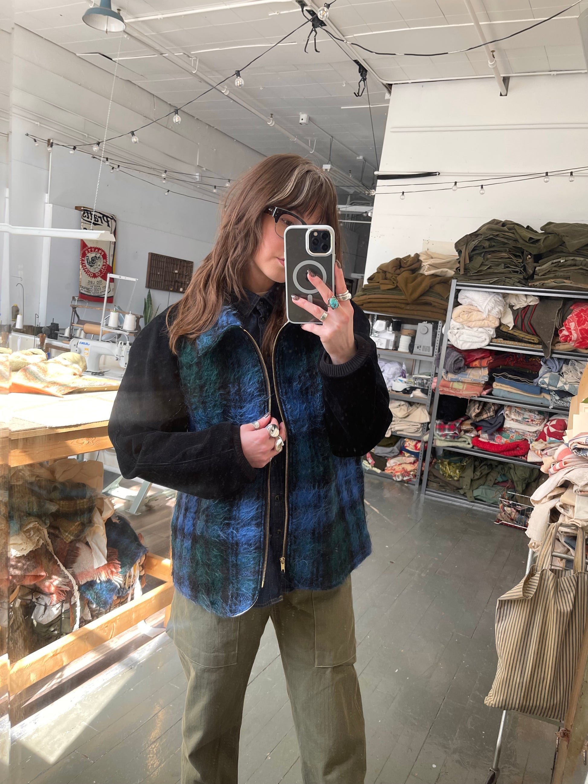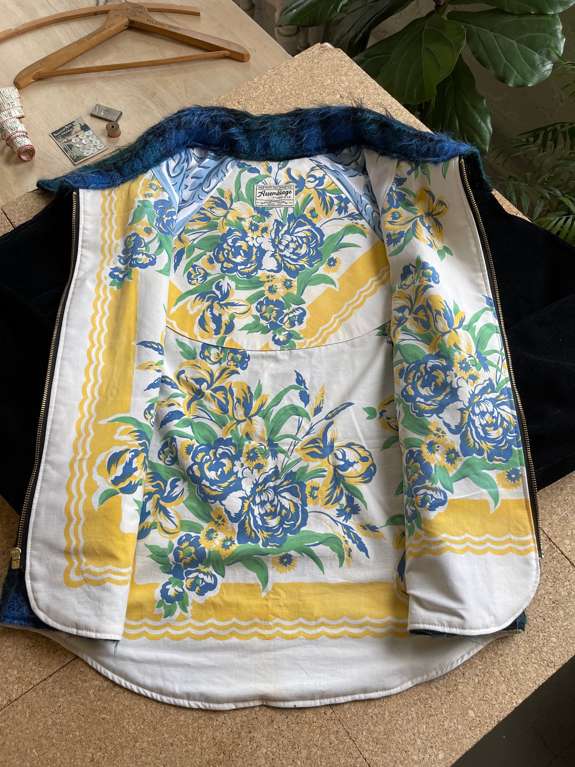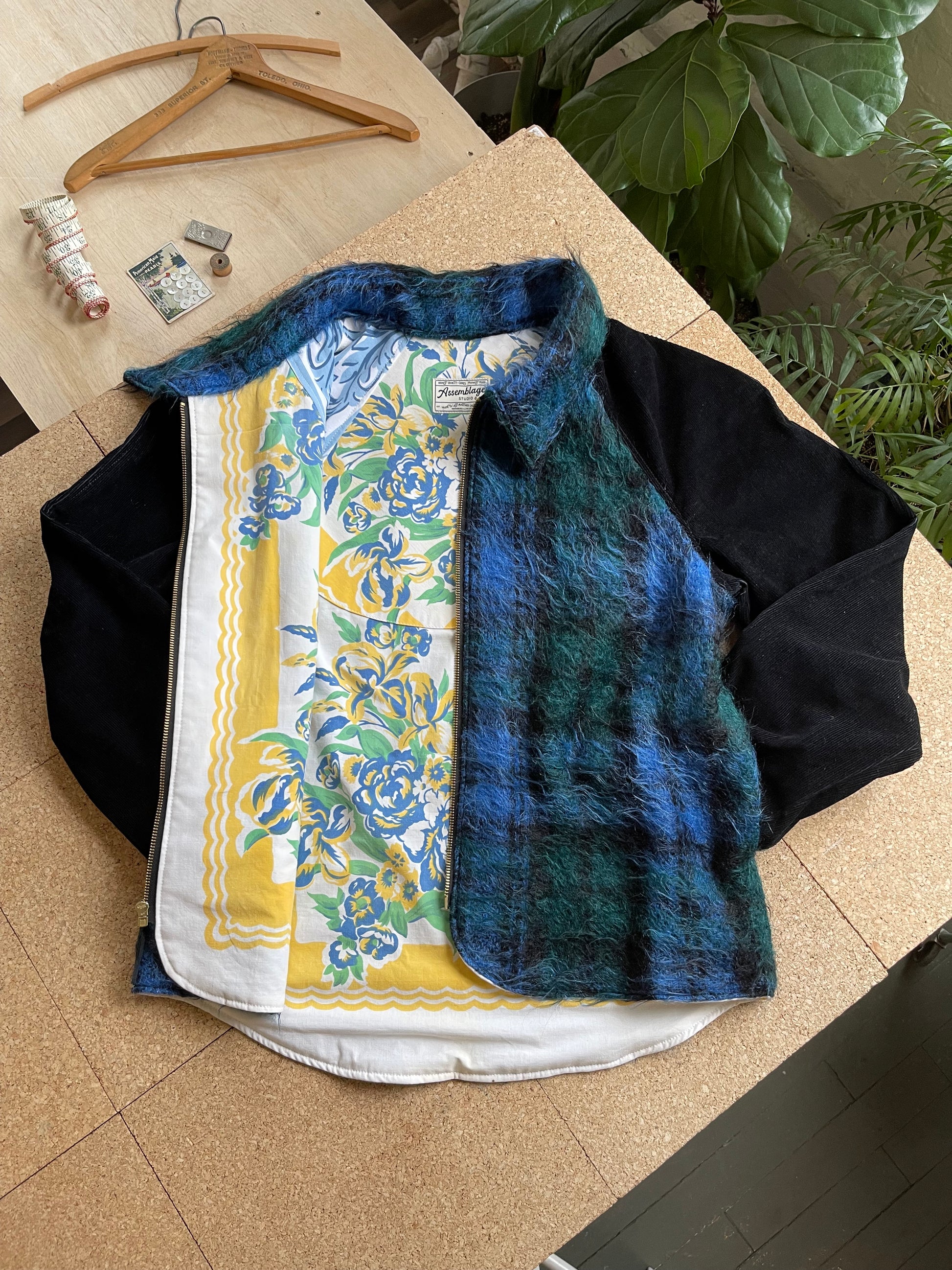 Handmade, one of a kind jacket. Made from a vintage 100% wool mohair pile blanket that has beautiful blue and black colors. The sleeves and collar are made using black corduroy that has very fine wales. Lined with a vintage mid century linen tablecloth with gorgeous floral motifs.