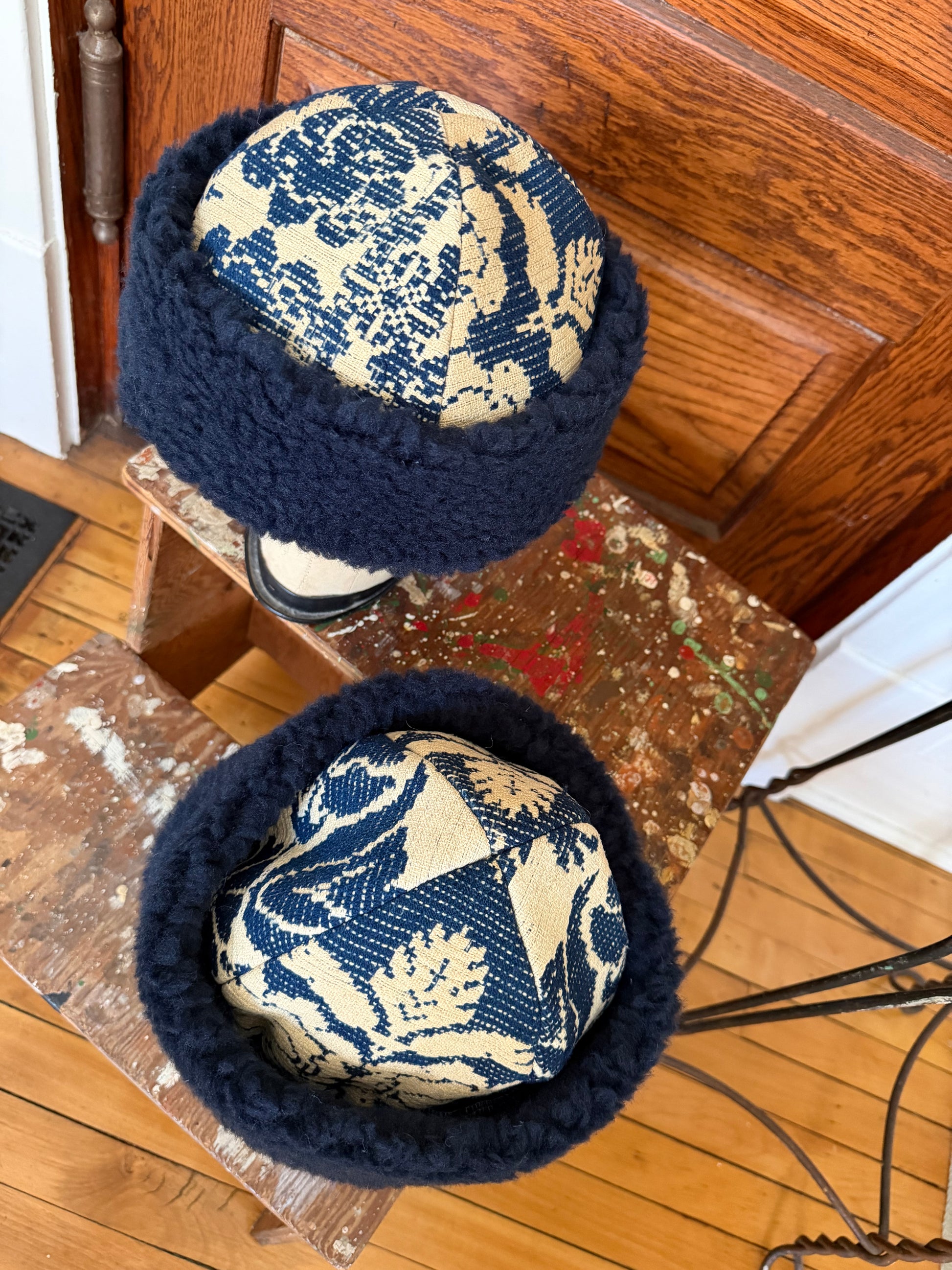 Handmade beanie made from an antique woven coverlet and vegan sherpa fleece. Lined with a cotton flannel. Designed to be worn with a fold up brim.