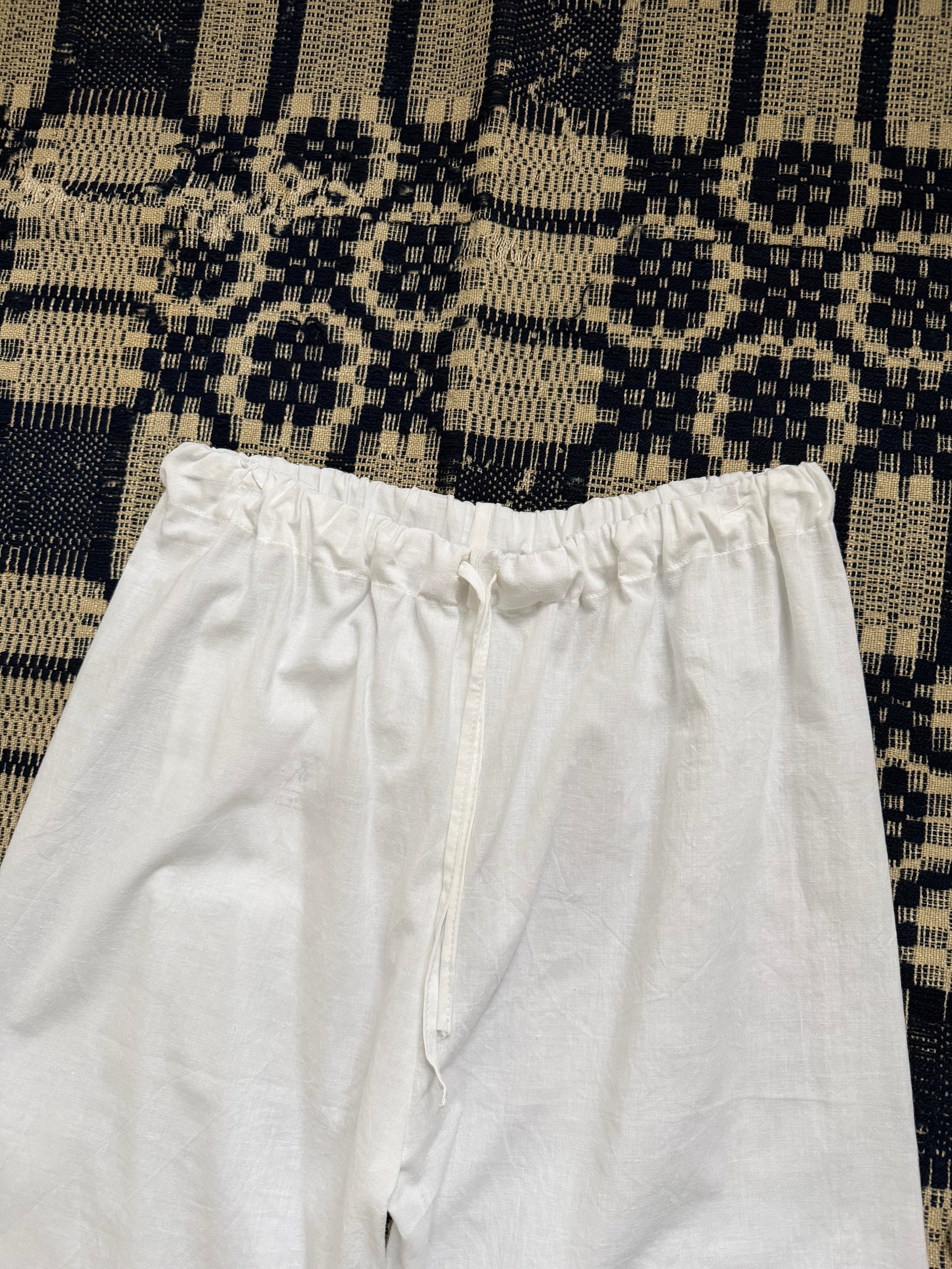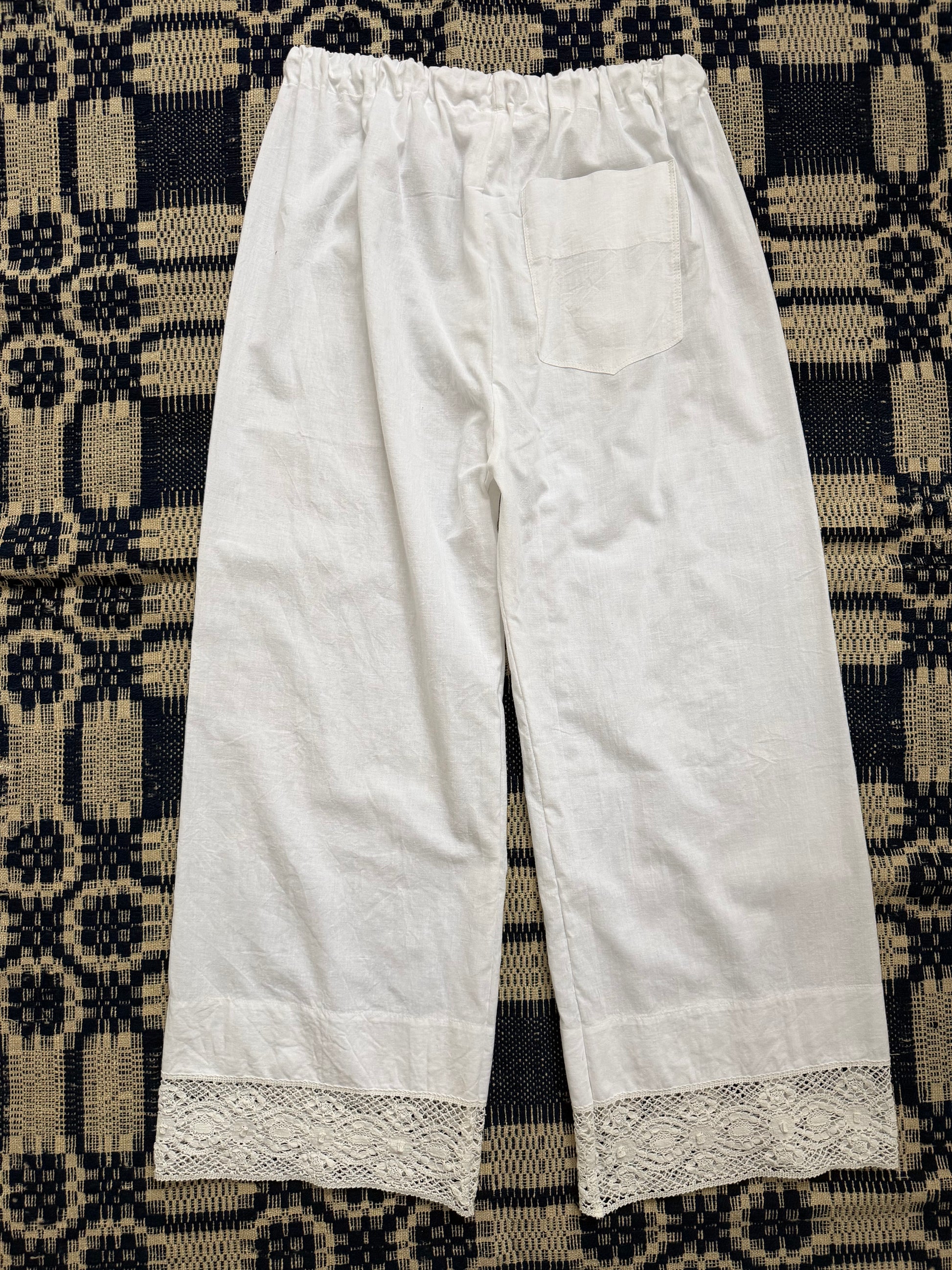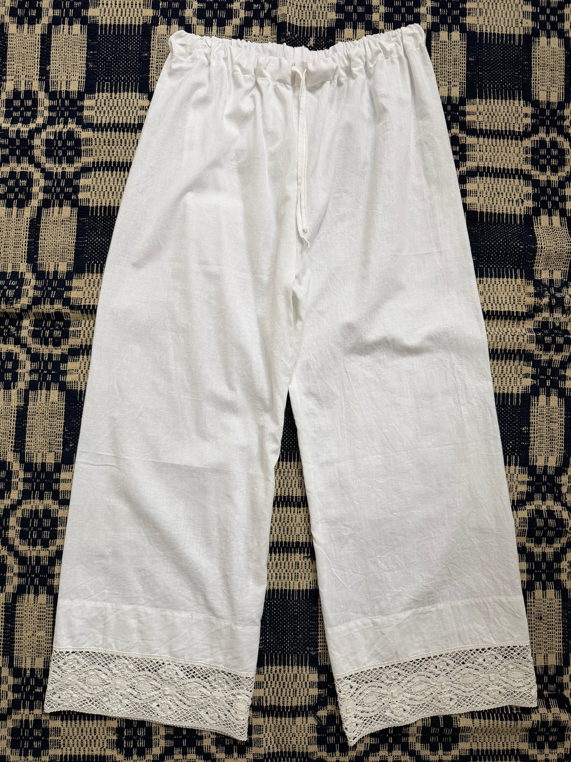 Handmade, one of a kind bloomer style pants made from vintage cotton bed sheet with crochet details. Have an elastic waistband with drawstring, can fit up to a size large.