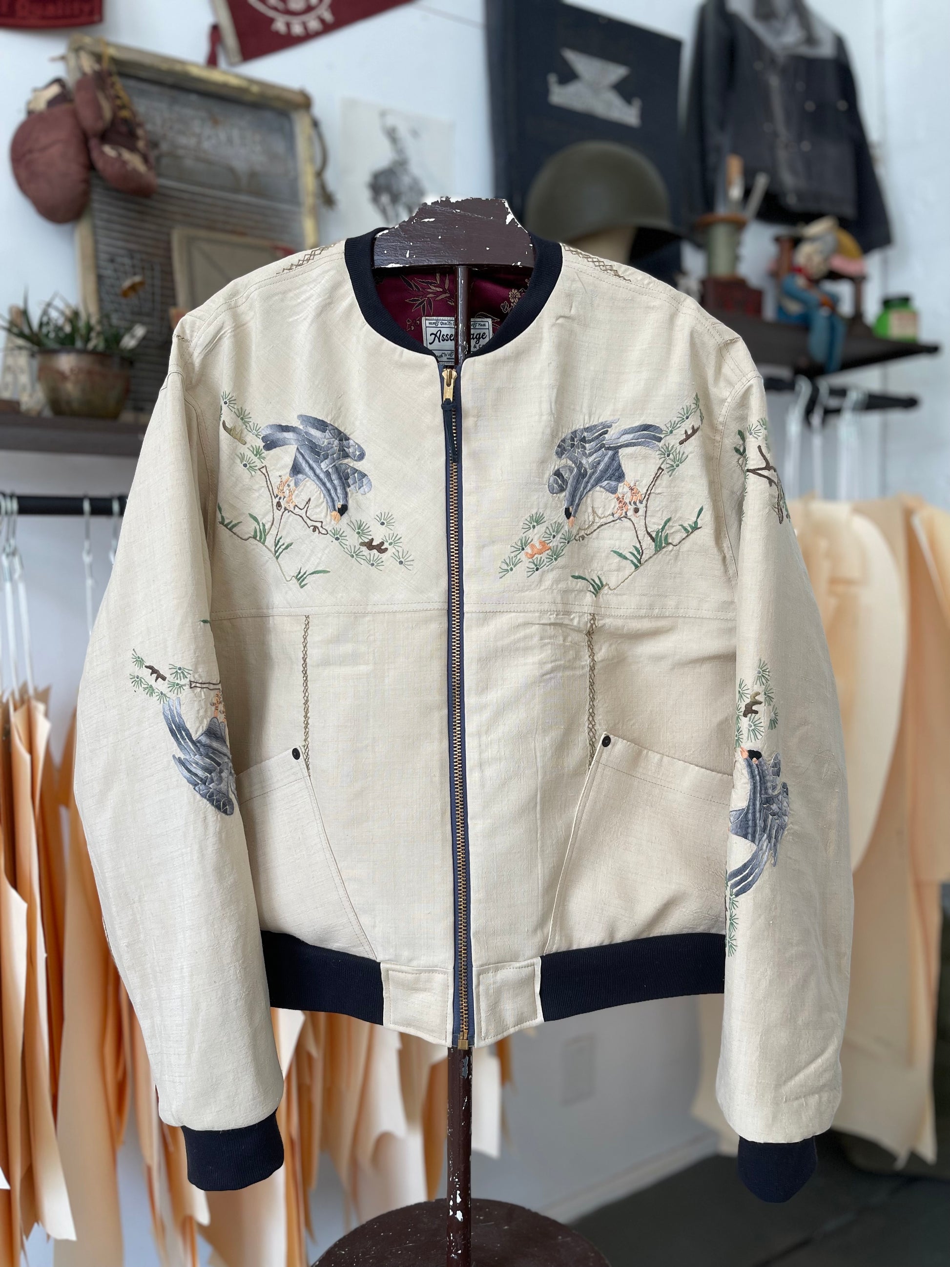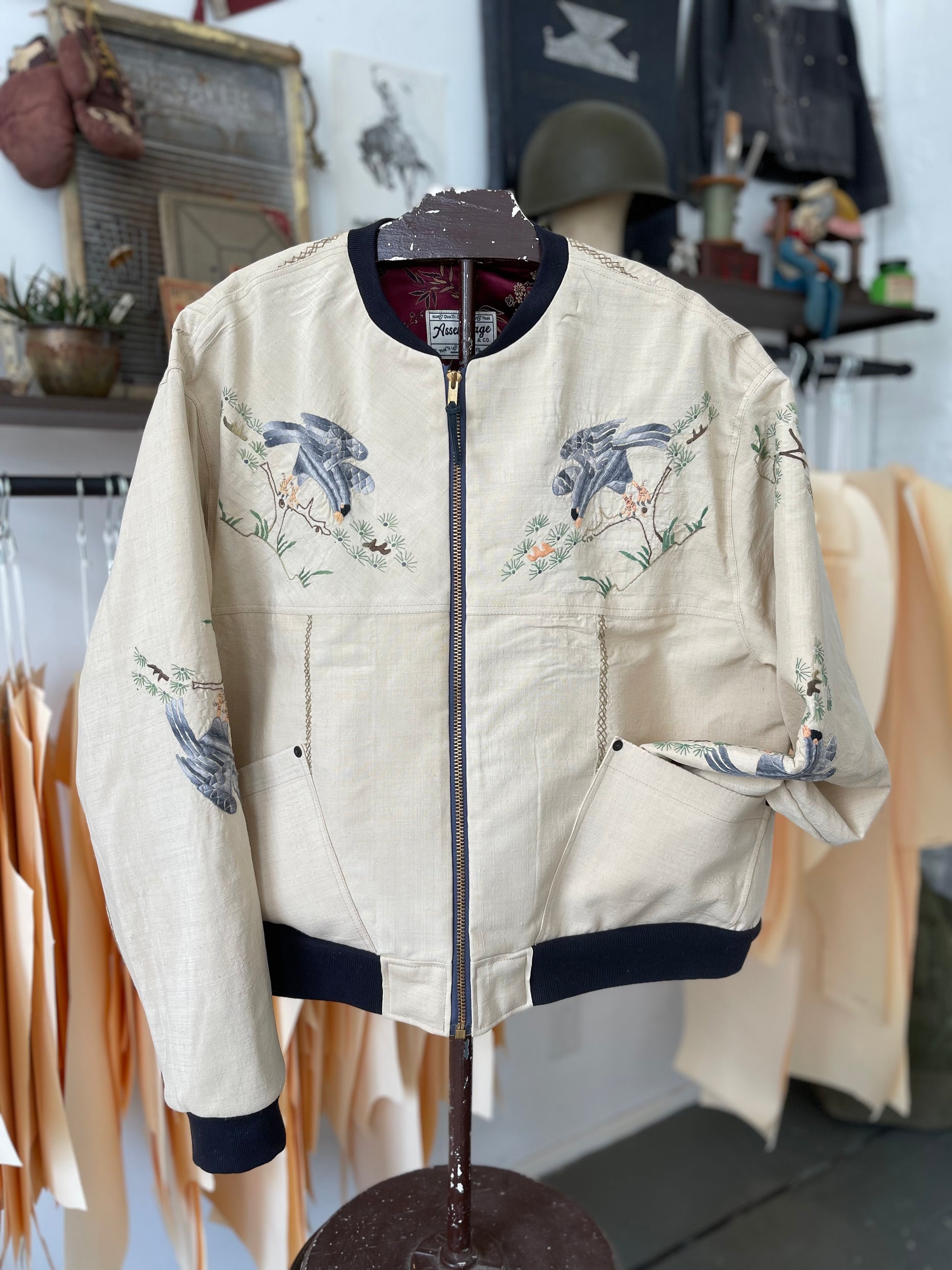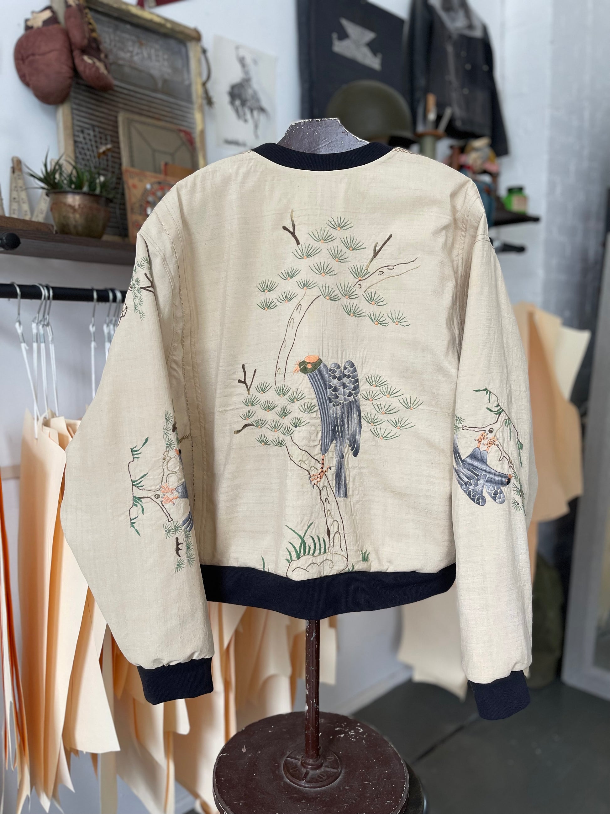Inspired by 1940s souvenir garments from WW2. Many US servicemen that were stationed overseas purchased gifts for their sweethearts, which were sent in the mail or gifted upon their return. These garments often represented the culture and traditions of where they were located during the war and were brought back to the US as souvenirs.