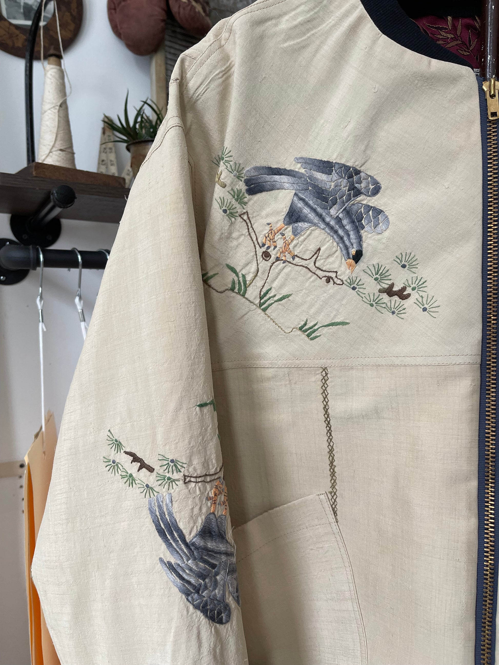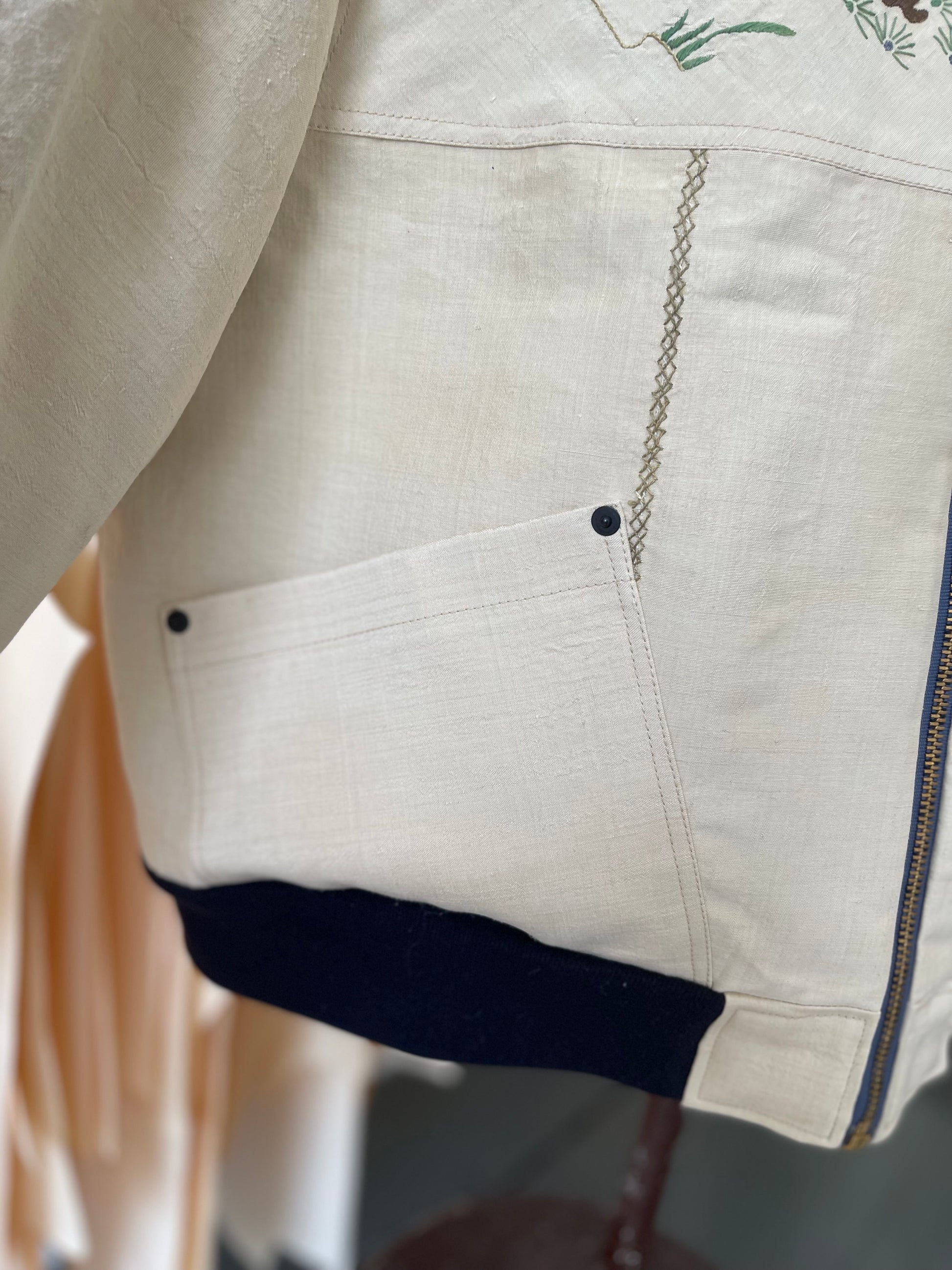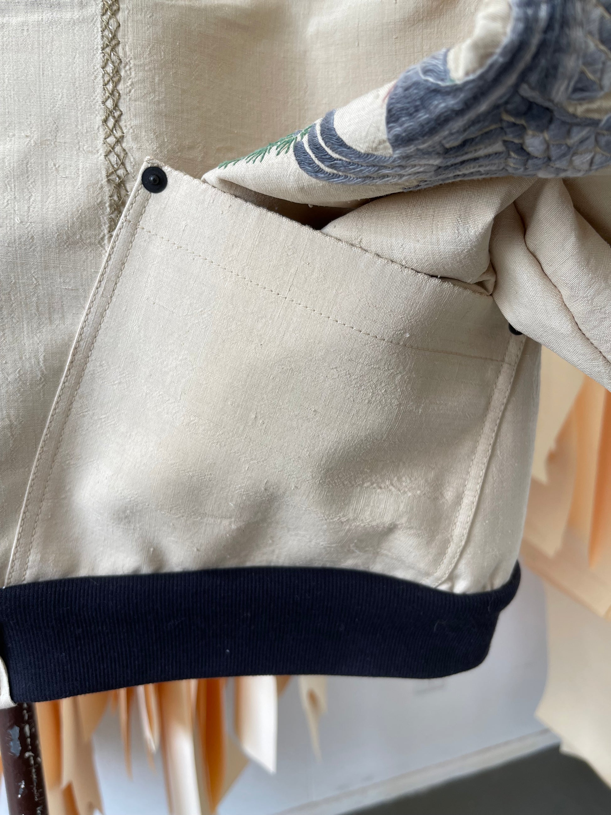 Made from vintage 1950s silk crepe tablecloth with the most stunning embroidery. Has a beautiful subtle sheen that I can’t quite capture in the photos on this gloomy day. Lined with a satin jacquard. Has two front pockets and ribbed cuffs and waistband.