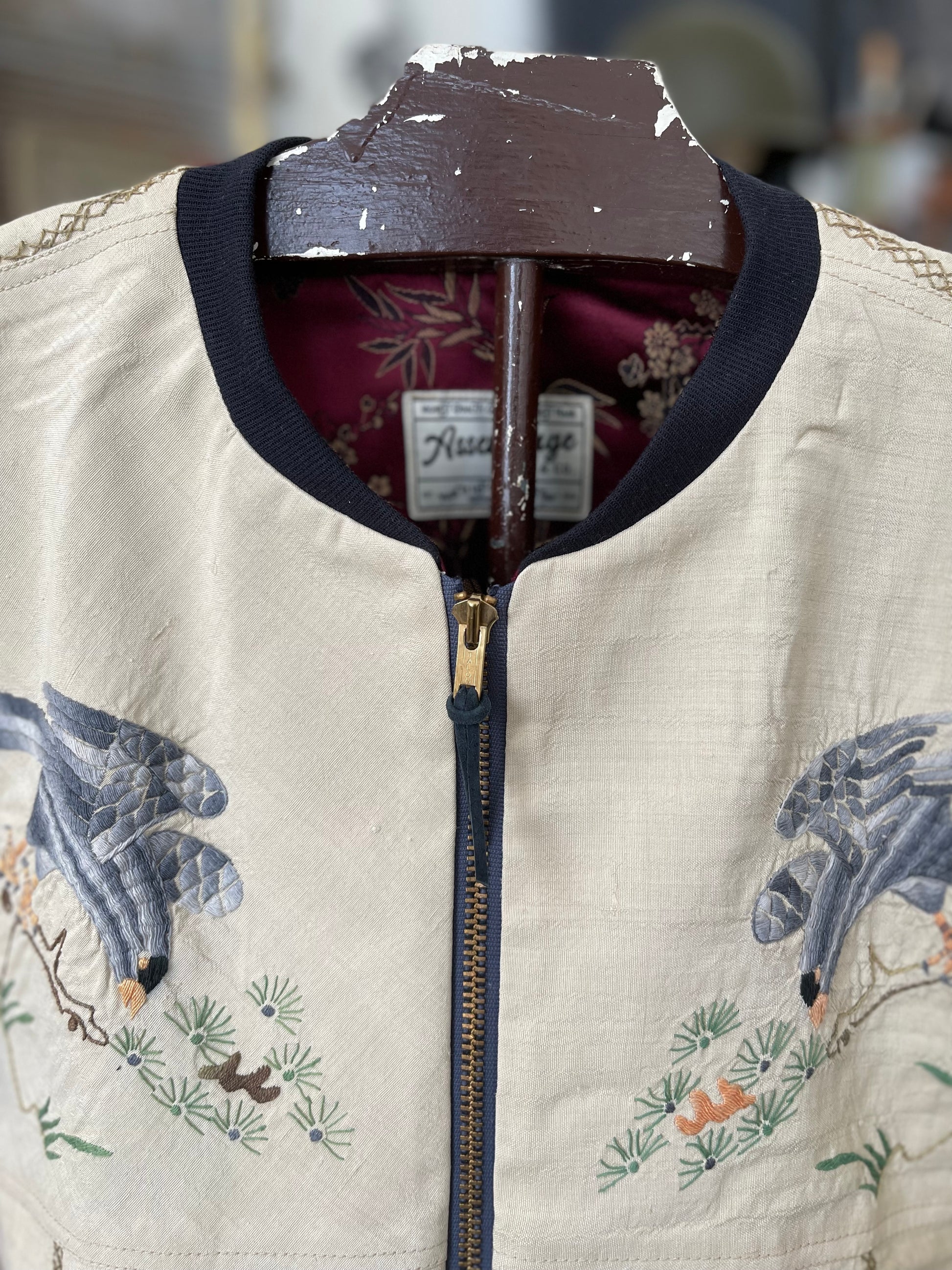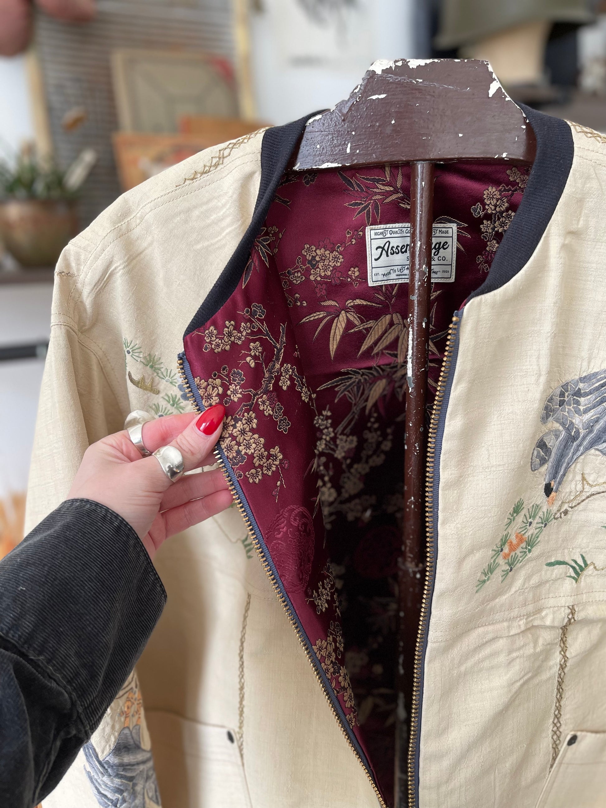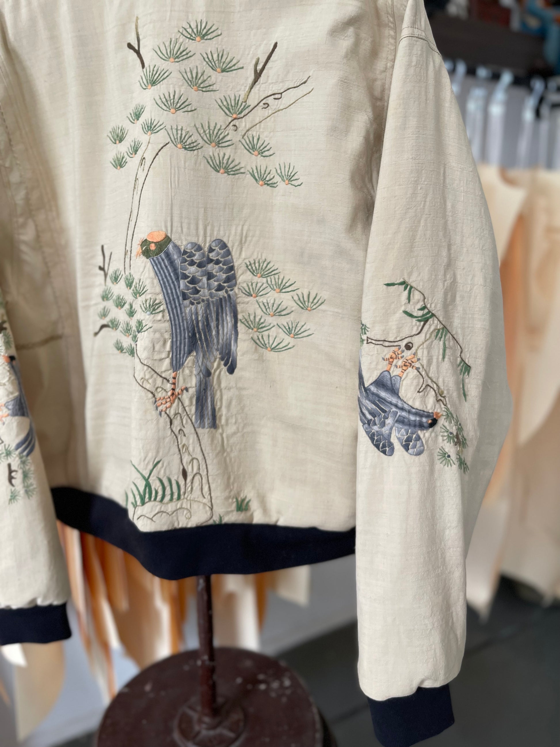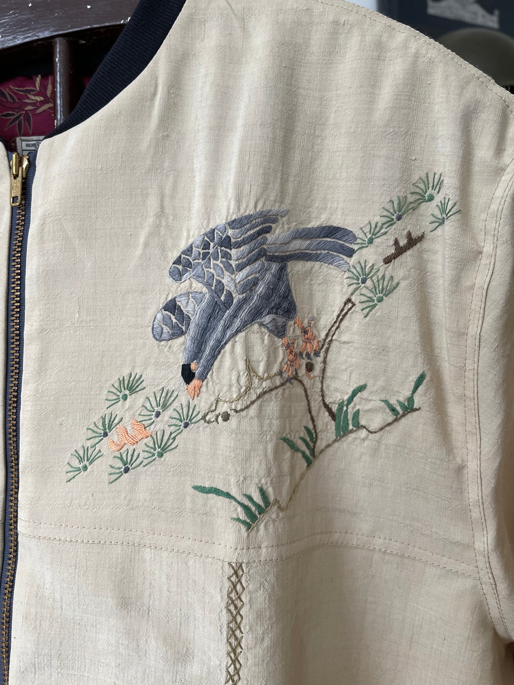 Made from vintage 1950s silk crepe tablecloth with the most stunning embroidery. Has a beautiful subtle sheen that I can’t quite capture in the photos on this gloomy day. Lined with a satin jacquard. Has two front pockets and ribbed cuffs and waistband.