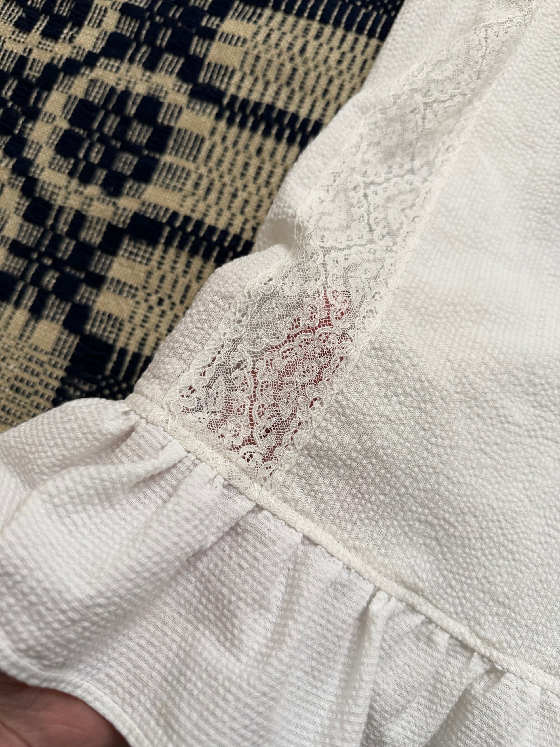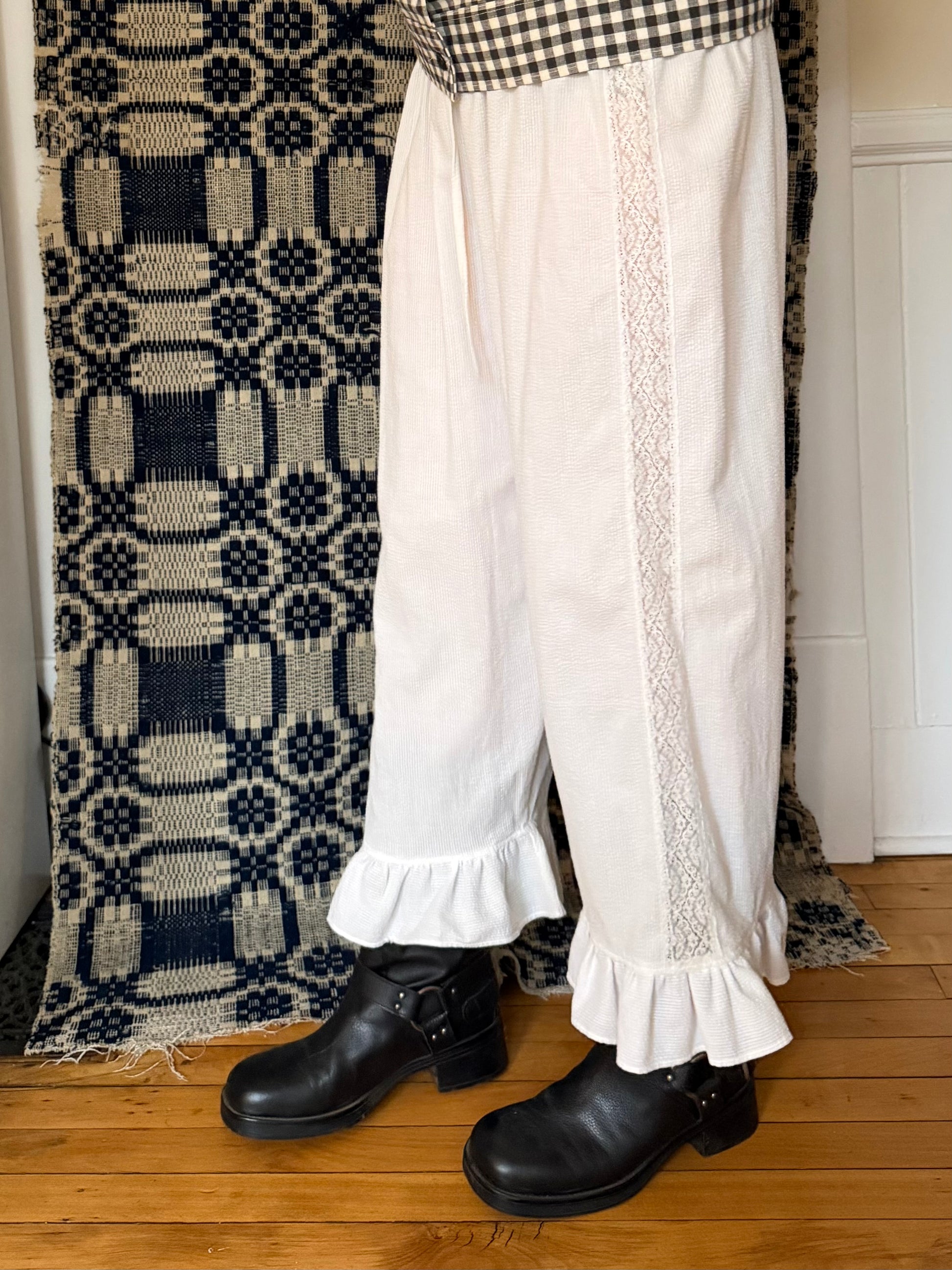 Handmade, one of a kind bloomer style pants made from vintage seersucker cotton and a delicate lace. Feature a lace stripe down the side and a ruffle hem. Have an elastic waistband with drawstring.