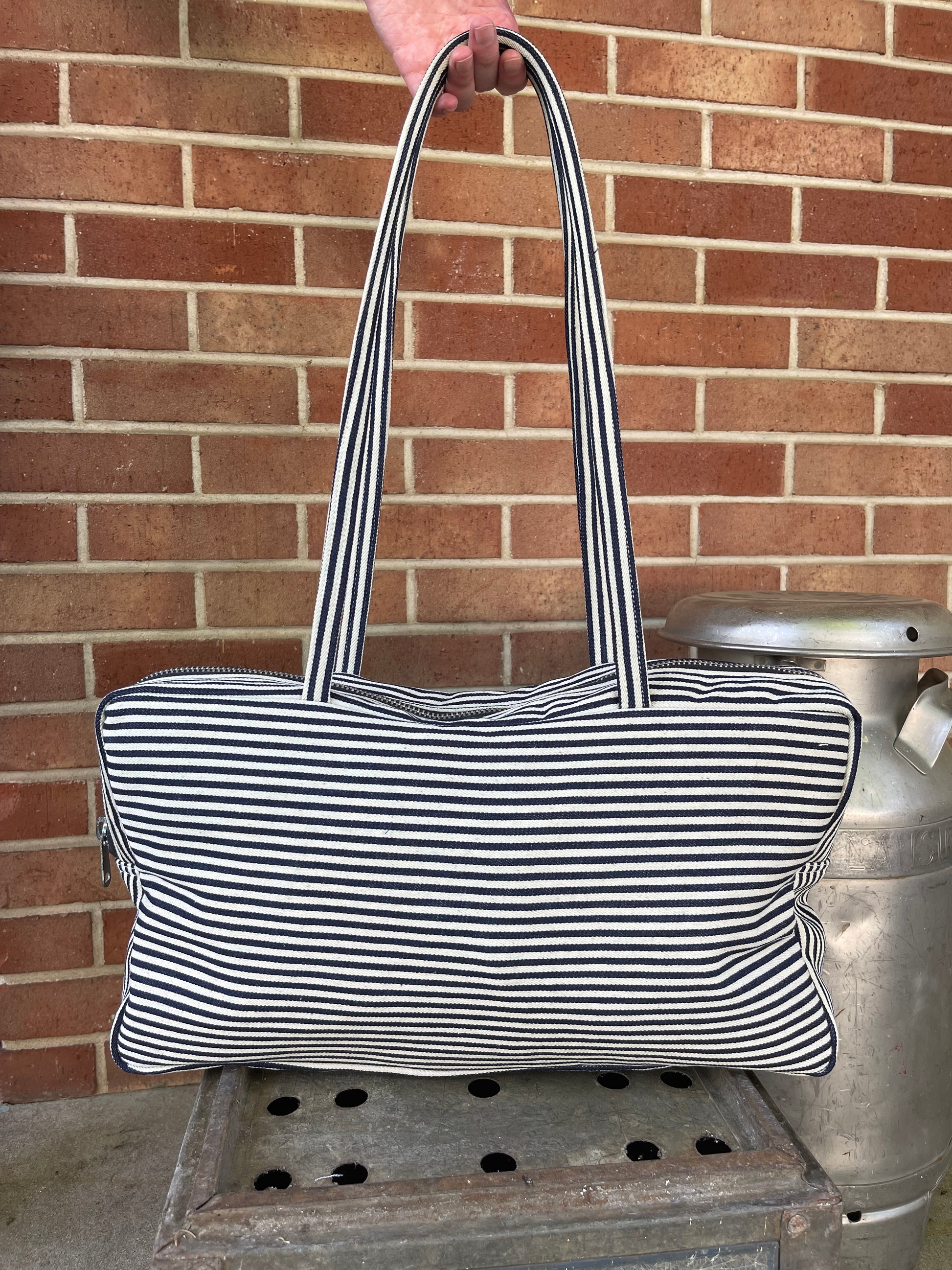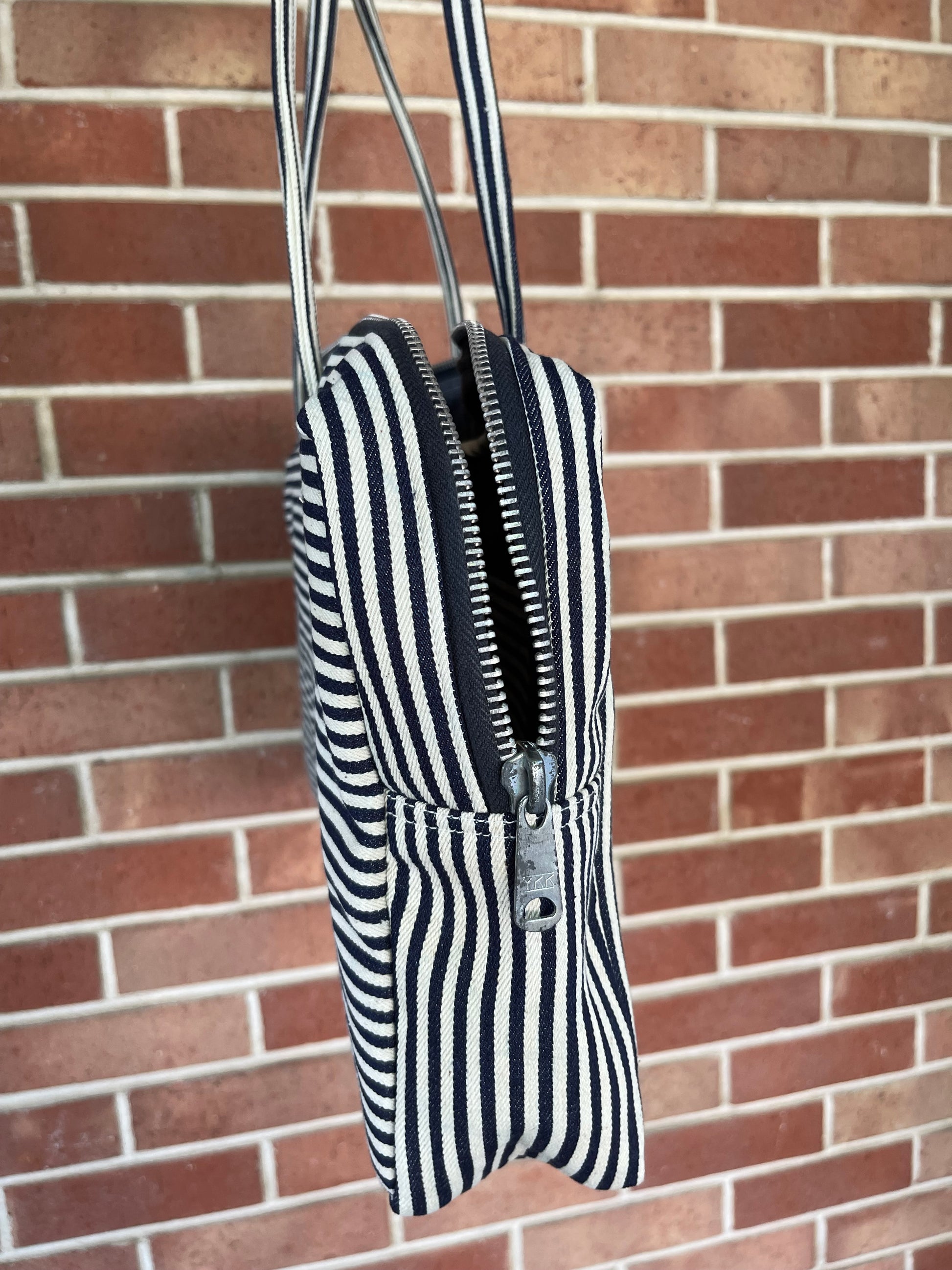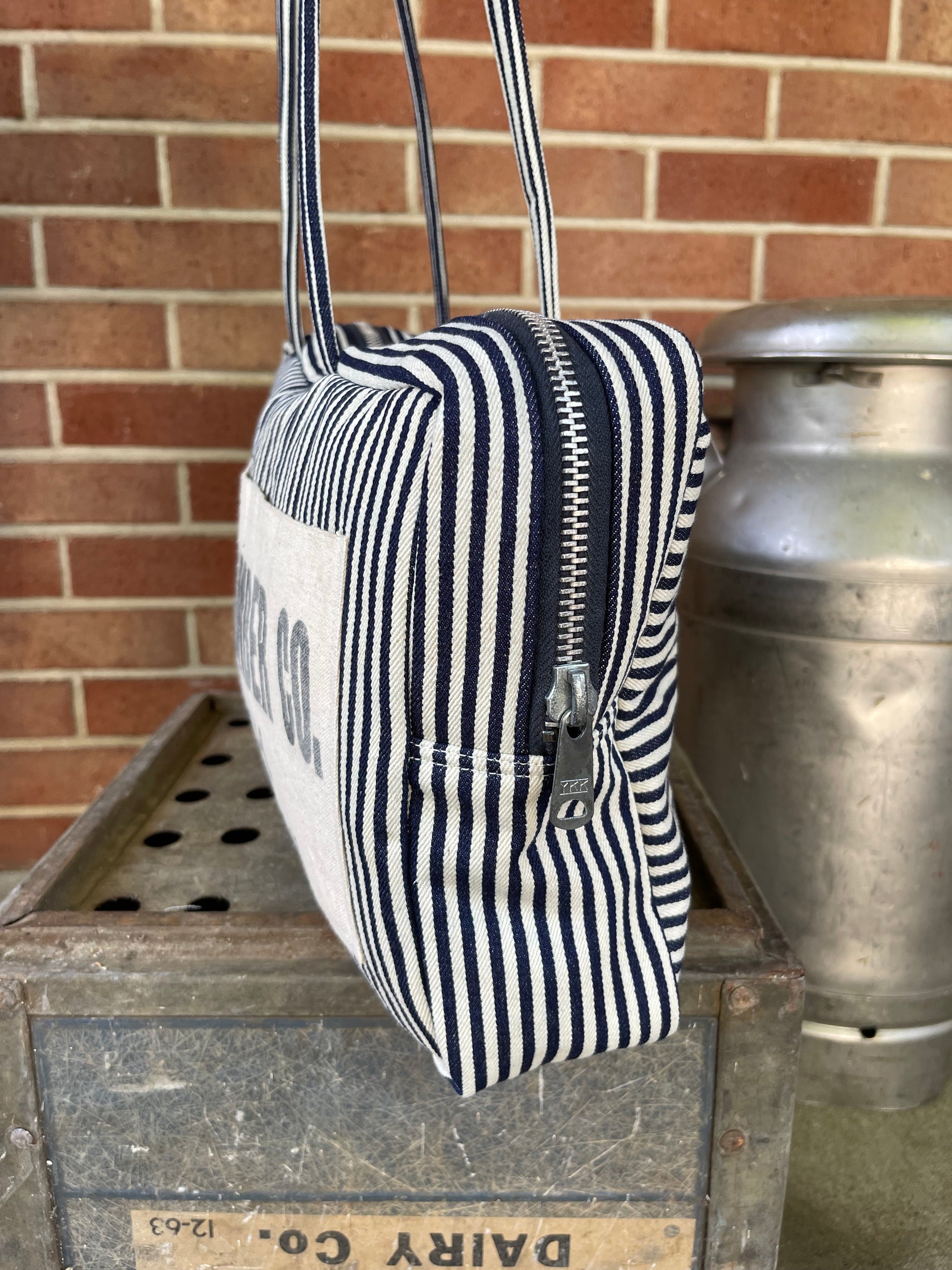 Handmade, one of a kind rectangle shaped bowling bag made out of vintage hickory striped fabric and a lumber store work apron. Navy and off white colored, the materials are in very good condition.