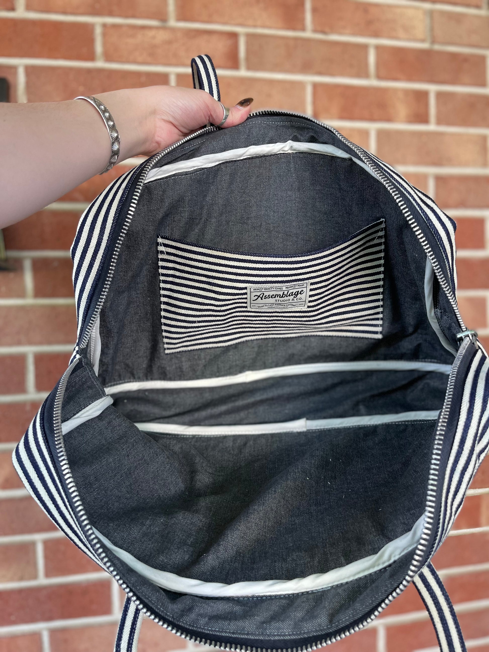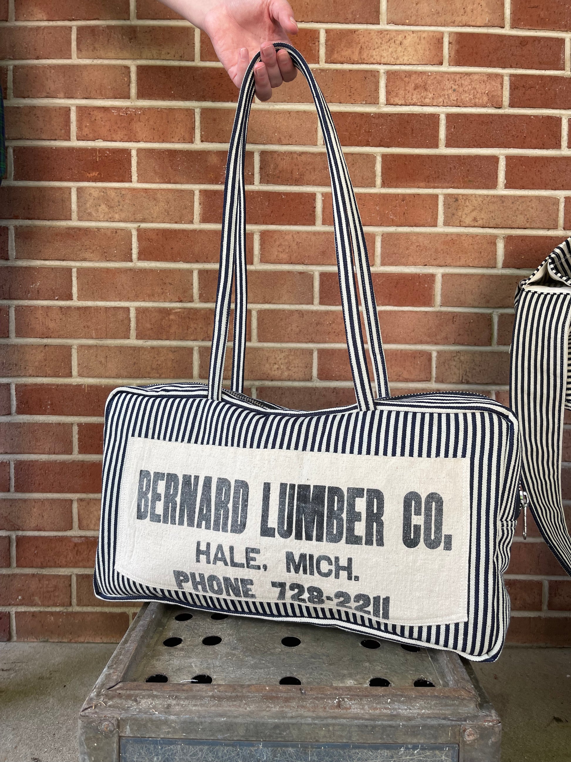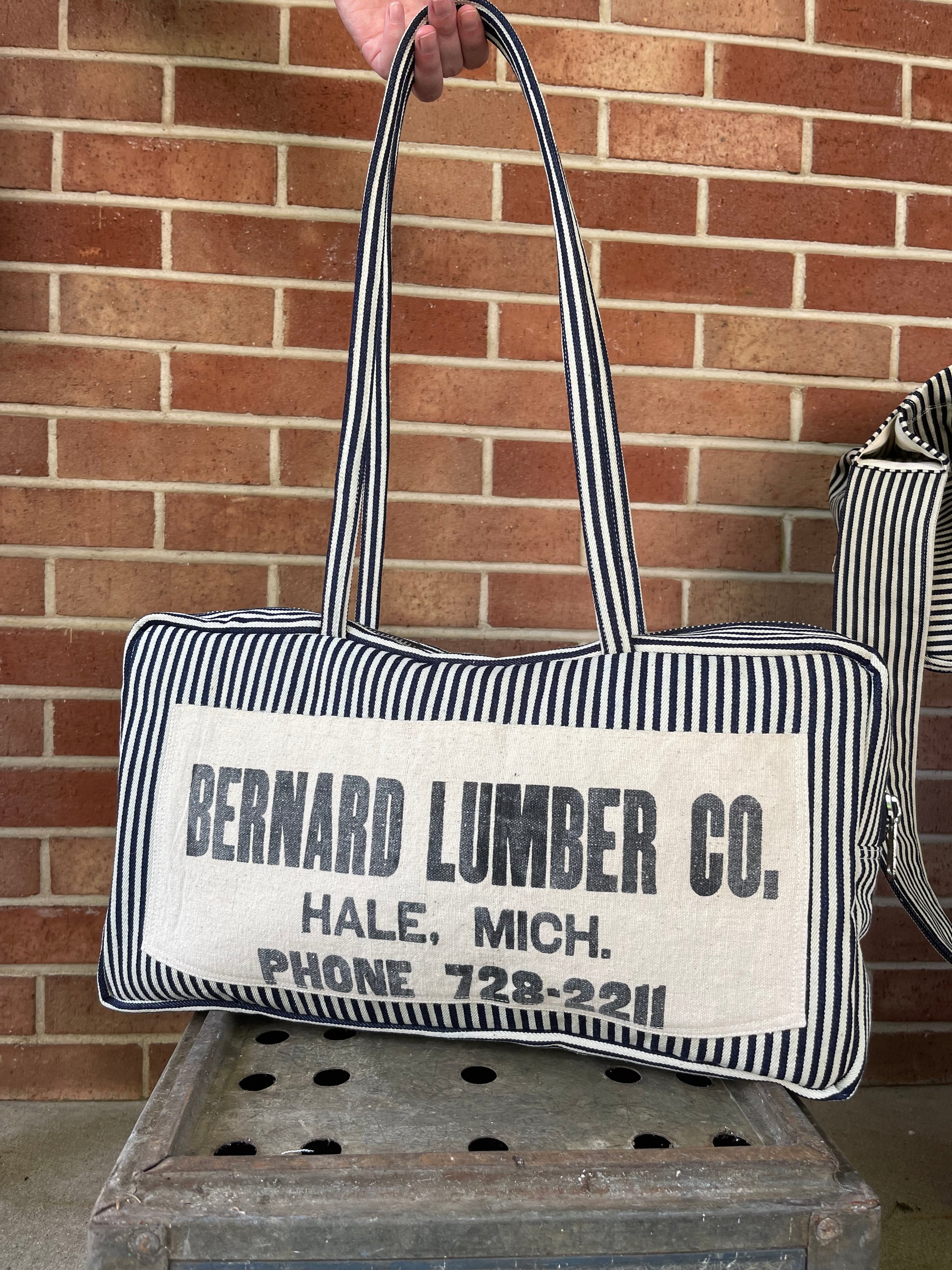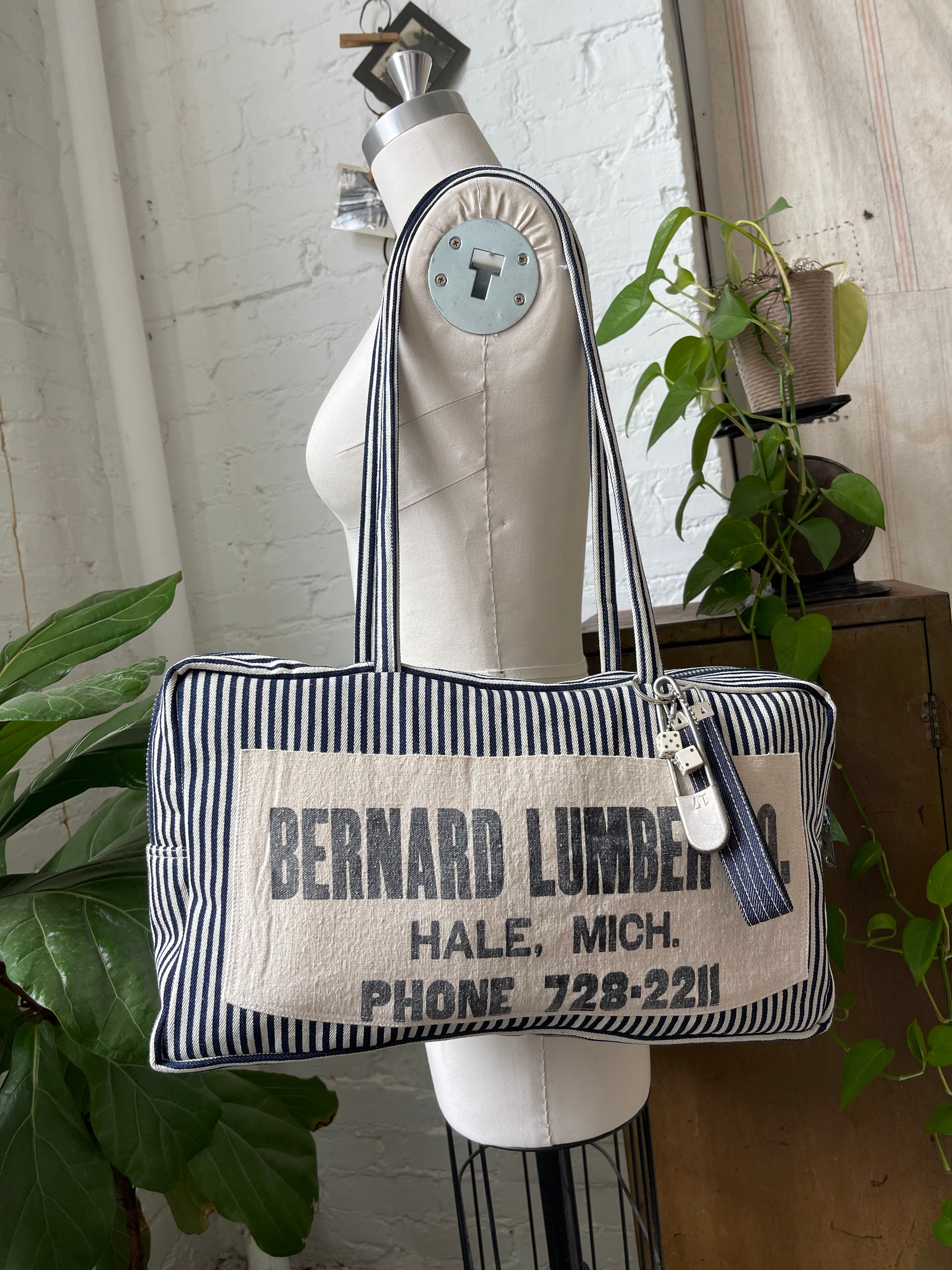 Handmade, one of a kind rectangle shaped bowling bag made out of vintage hickory striped fabric and a lumber store work apron. Navy and off white colored, the materials are in very good condition.