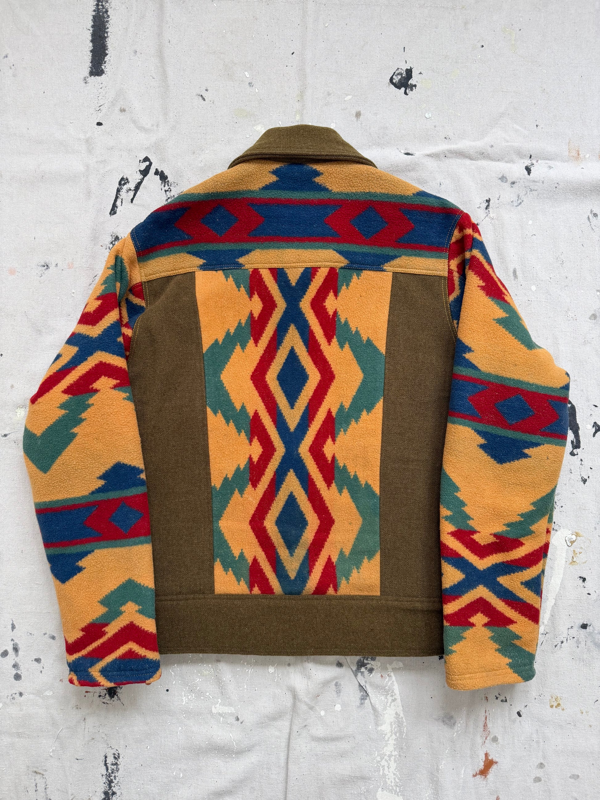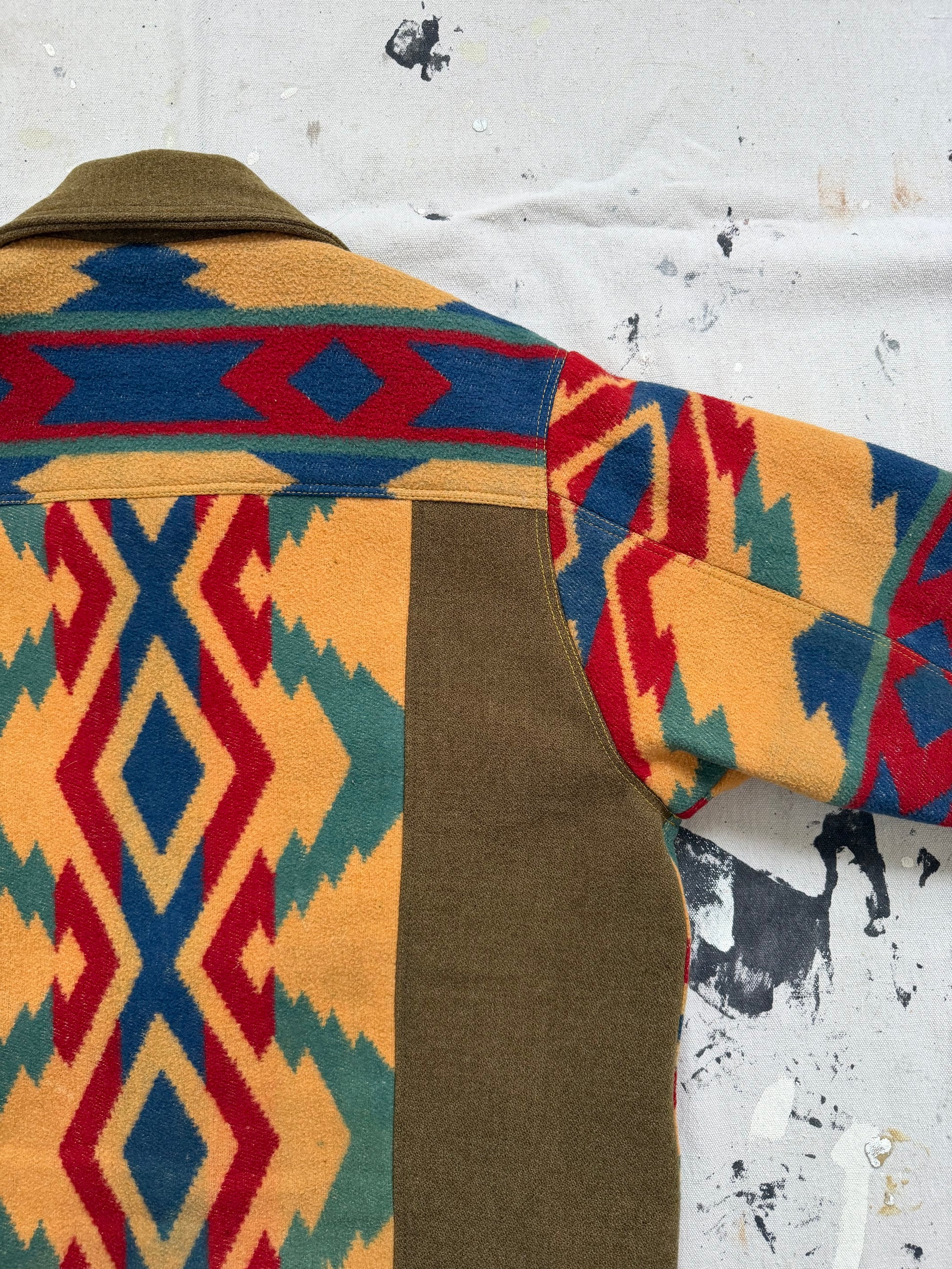 Handmade, one of a kind jacket made out of a vintage wool military blanket and a camp blanket with gorgeous colors and pattern. Lined with a striped woven cotton. This is a mid-heavyweight jacket.