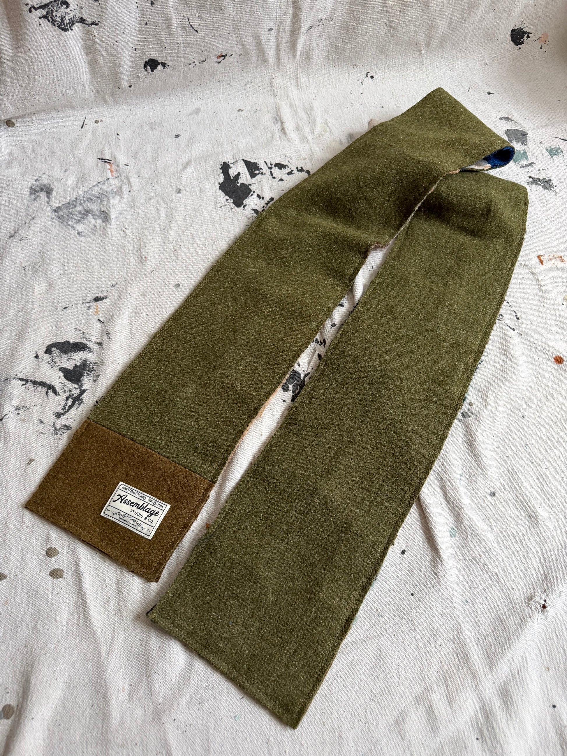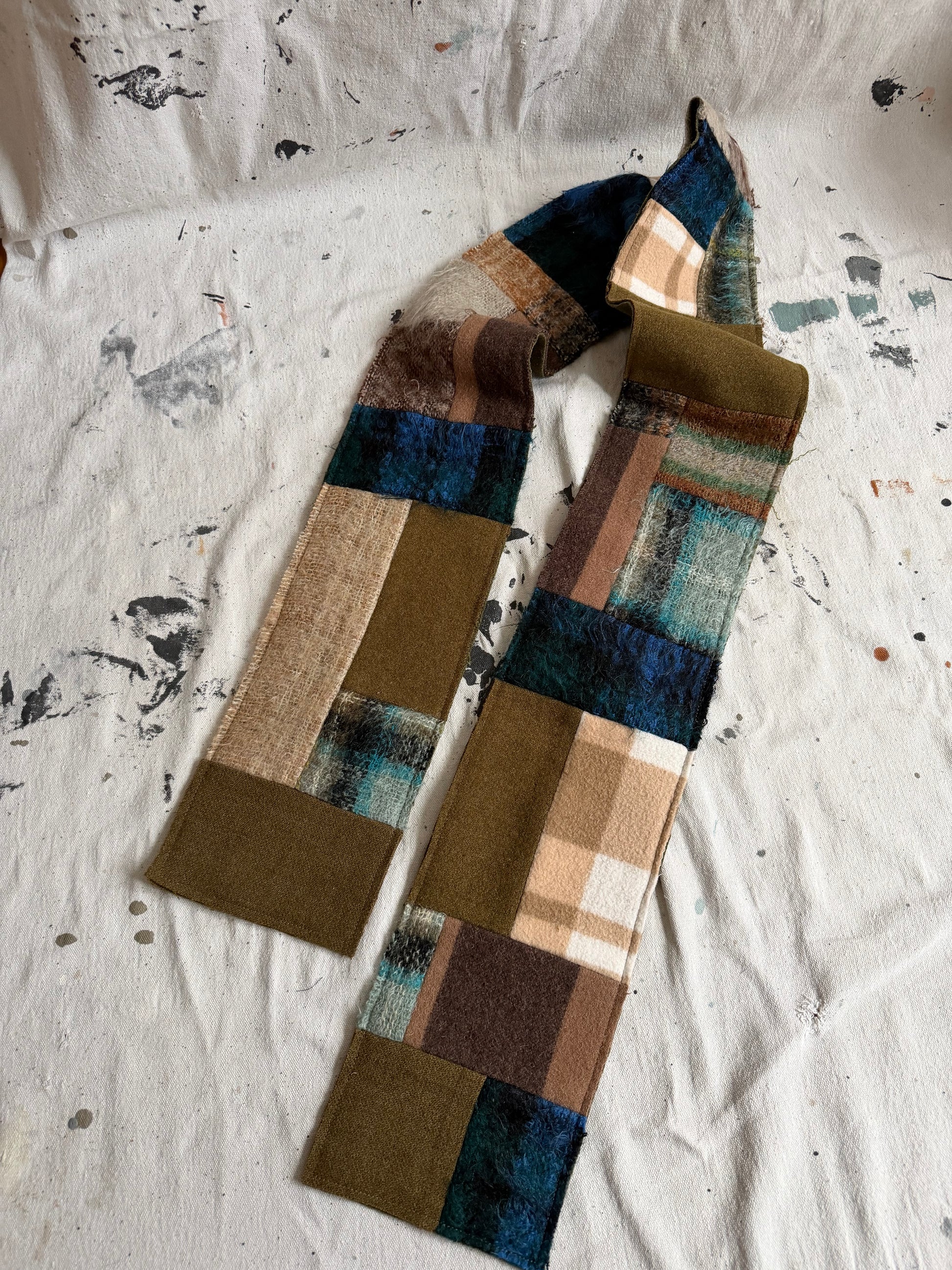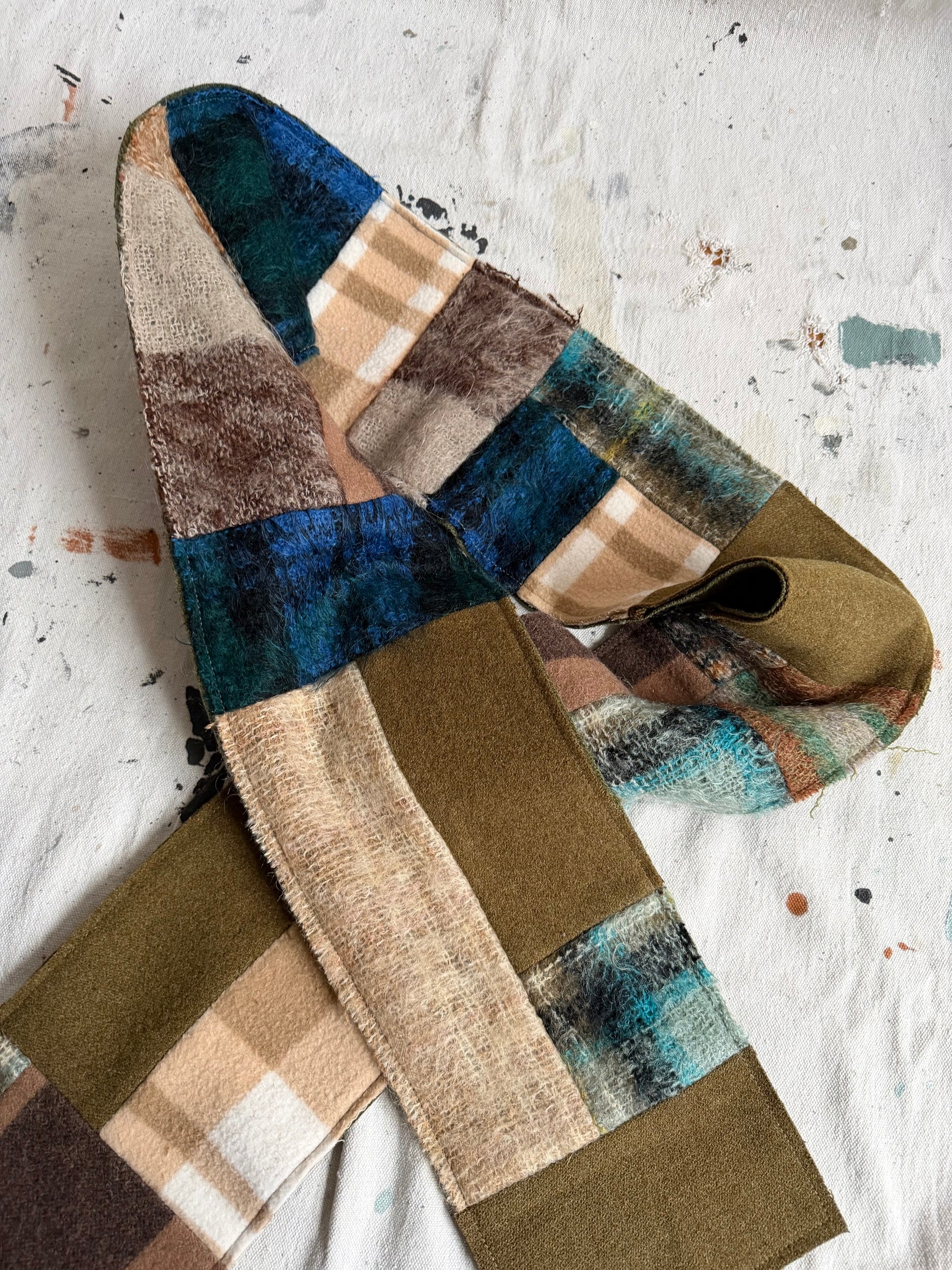 Handmade, one of a kind patchwork scarf made out of vintage wool and mohair. Blue, olive, brown, and tans throughout. Reversible with patchwork on one side and olive green on the other.