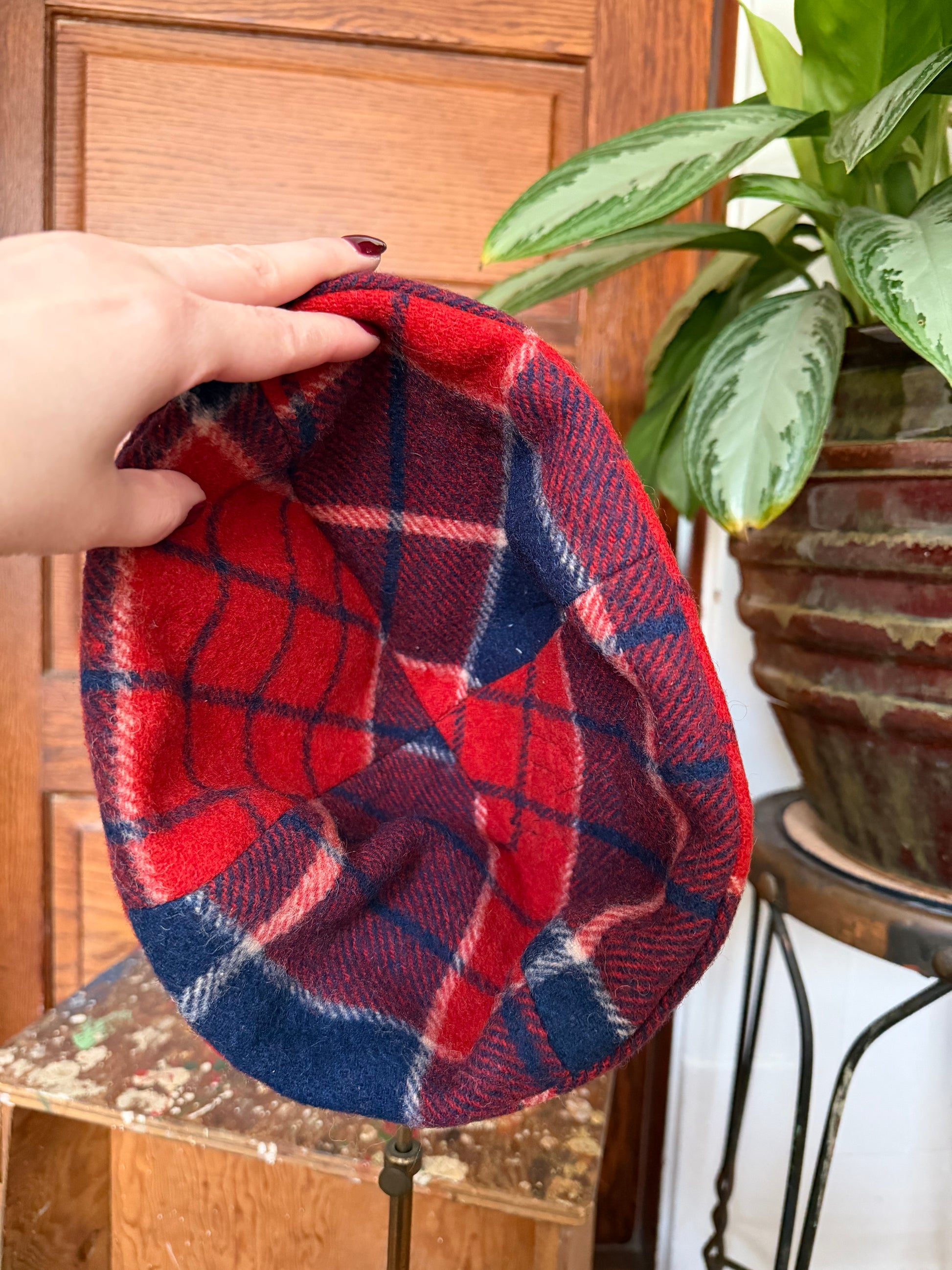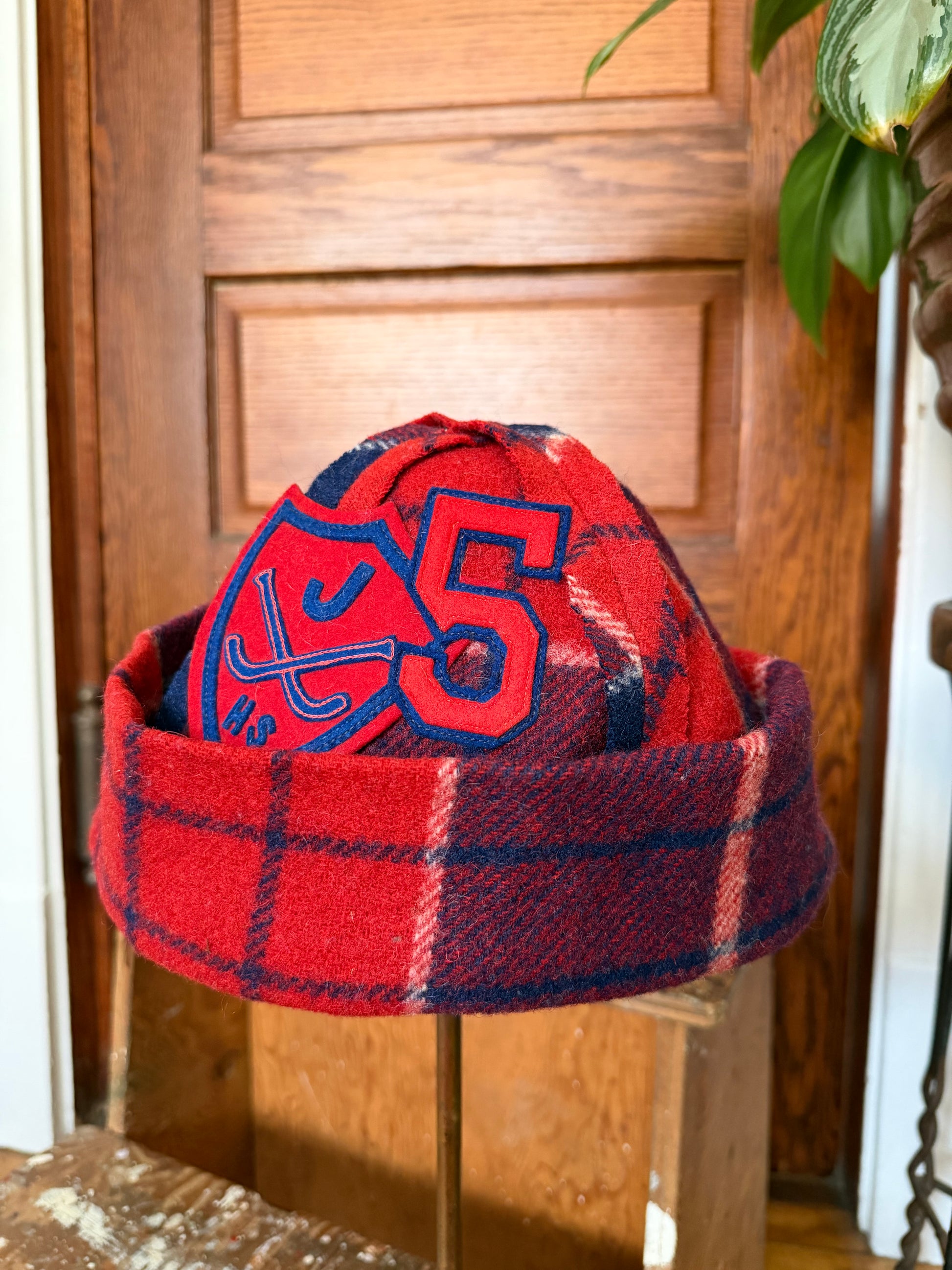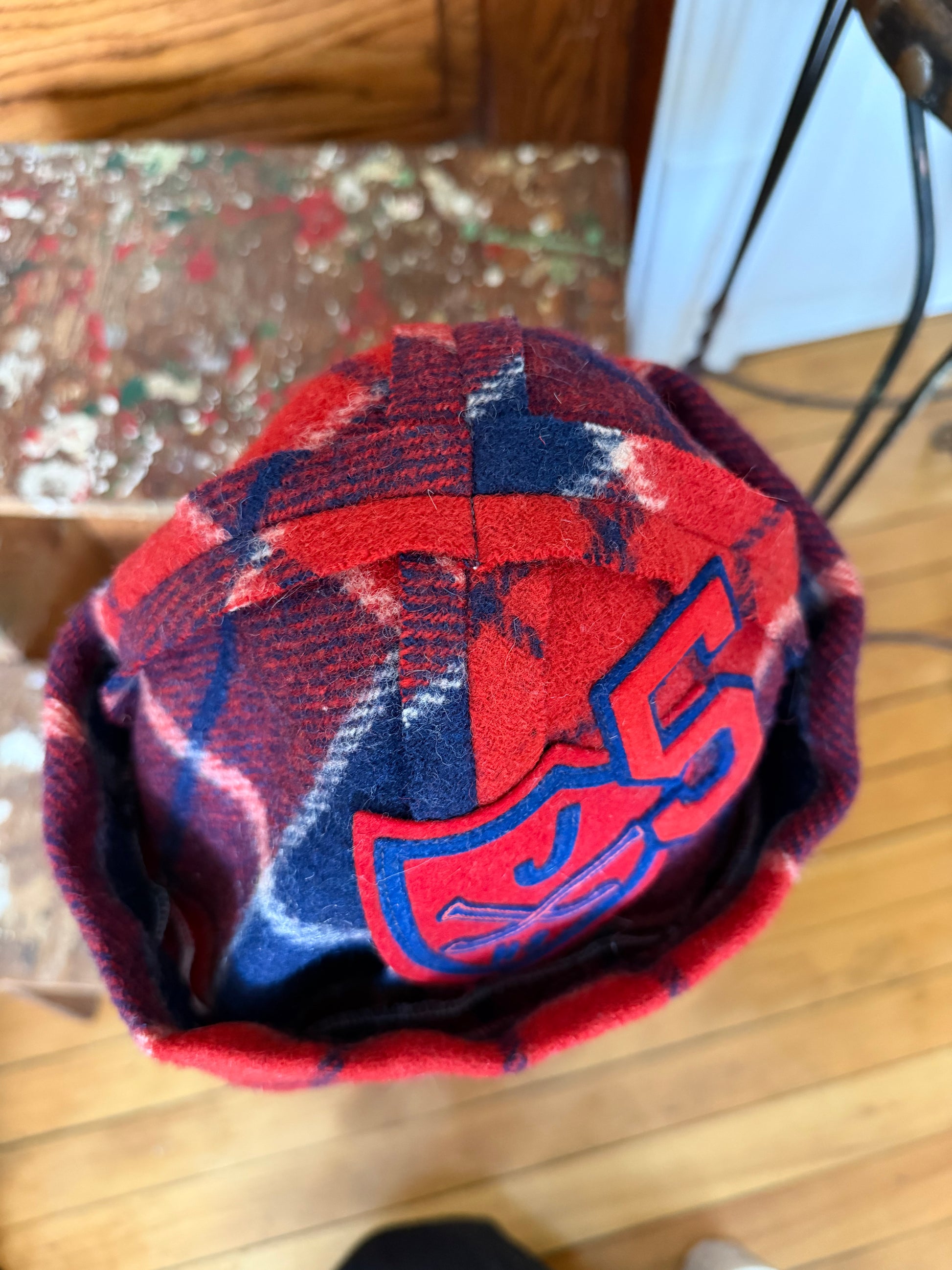 Handmade, one of a kind beanie made from a vintage plaid wool blanket. Designed to be worn with the fold up brim. Vintage wool patches on the front.