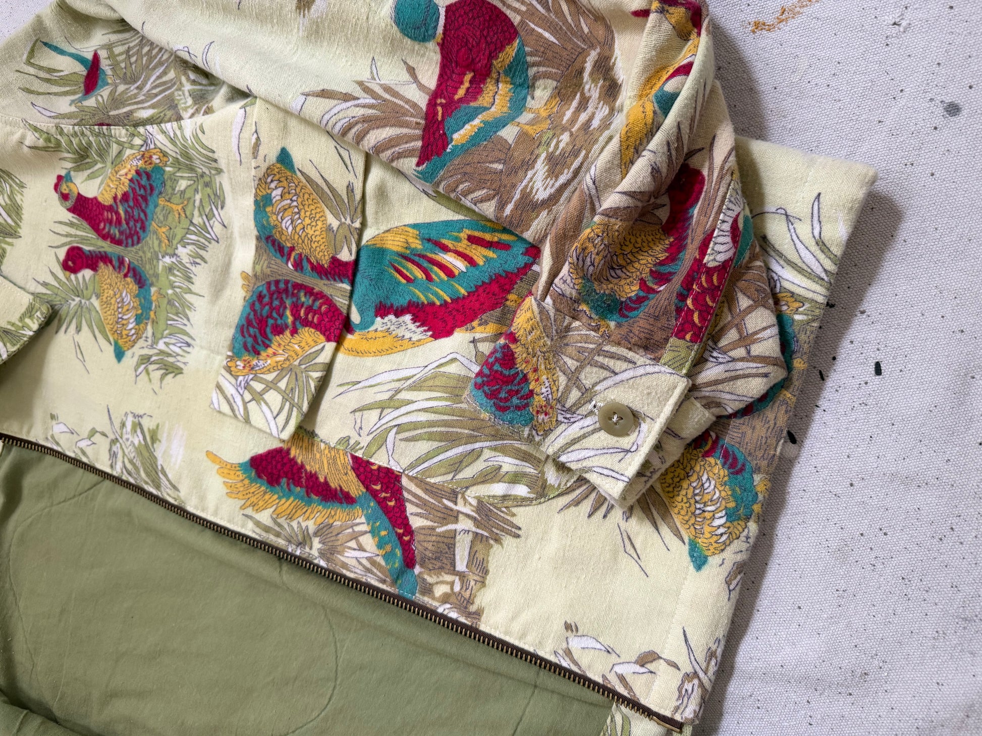 Handmade, one of a kind jacket made out of a 1970s sleeping bag that I deconstructed. Soft, 100% cotton brushed flannel with an incredible quail and heron scene. Lined with a lightweight cotton that was once the outer fabric of the sleeping bag, beautifully sun faded. Unfortunately the photos do not do this fabric justice.