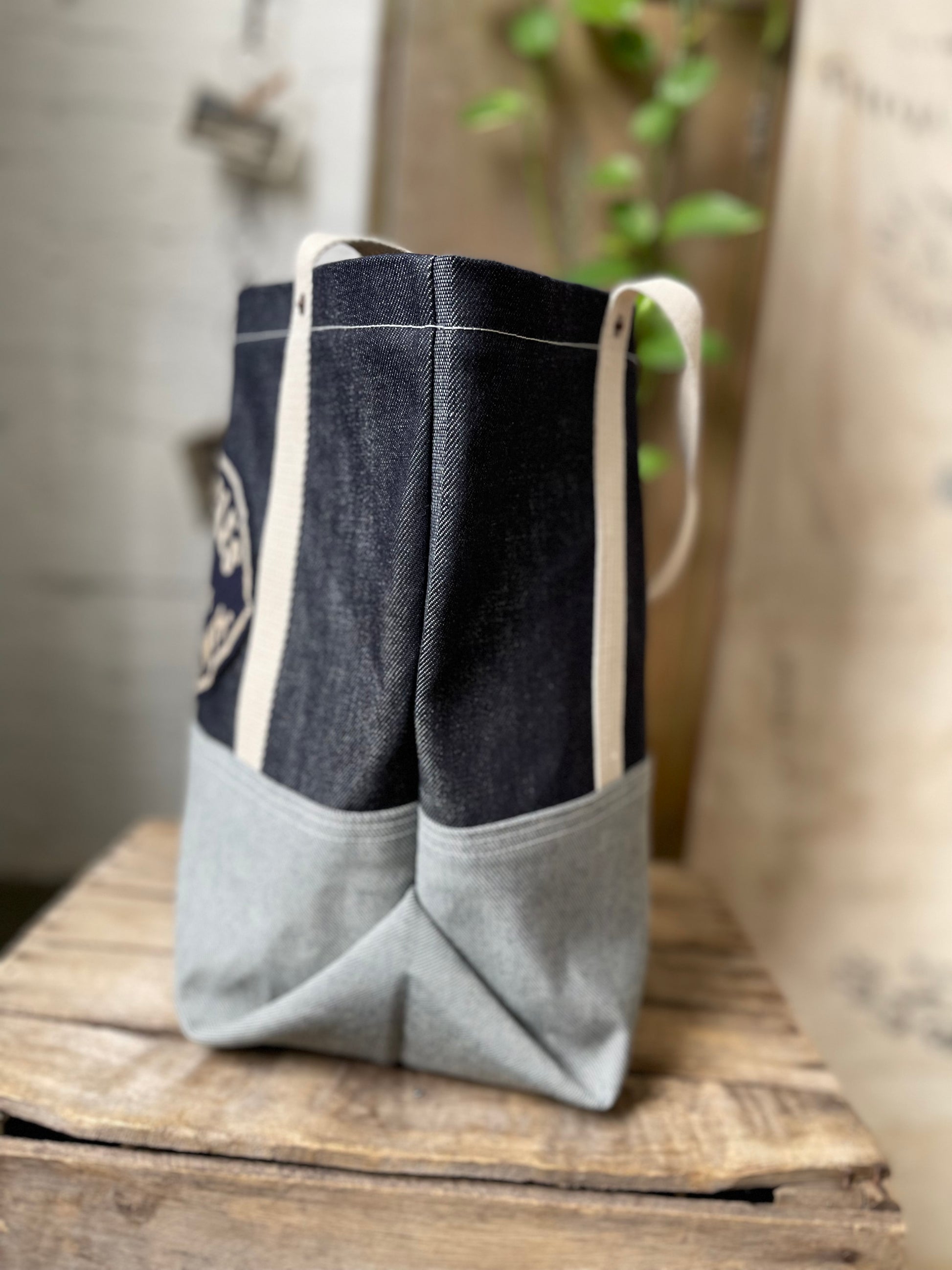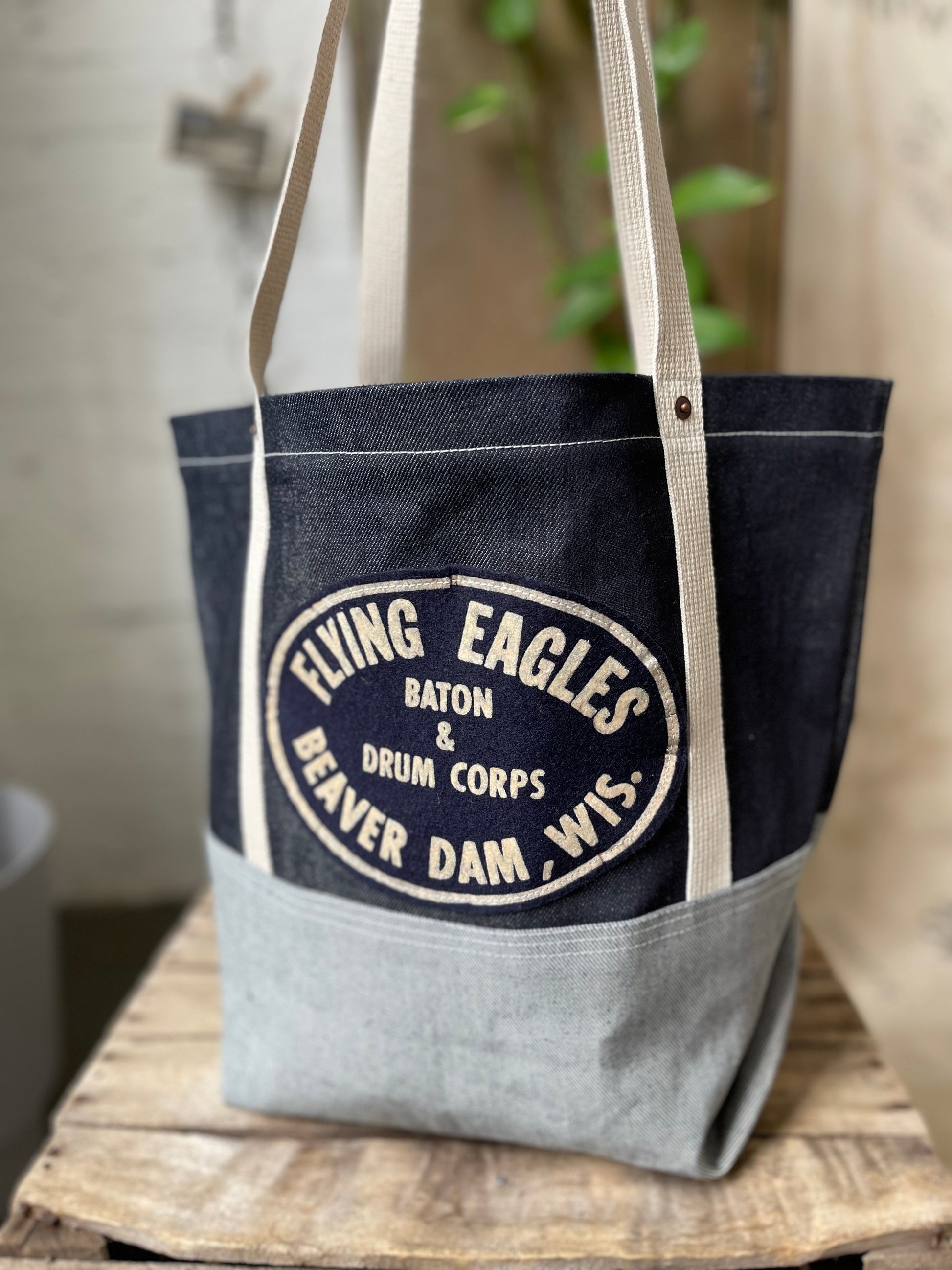 Handmade, one of a kind tote bag made from raw dark denim. Wool flock print "Flying Eagles" patch from the 1940s/50s.