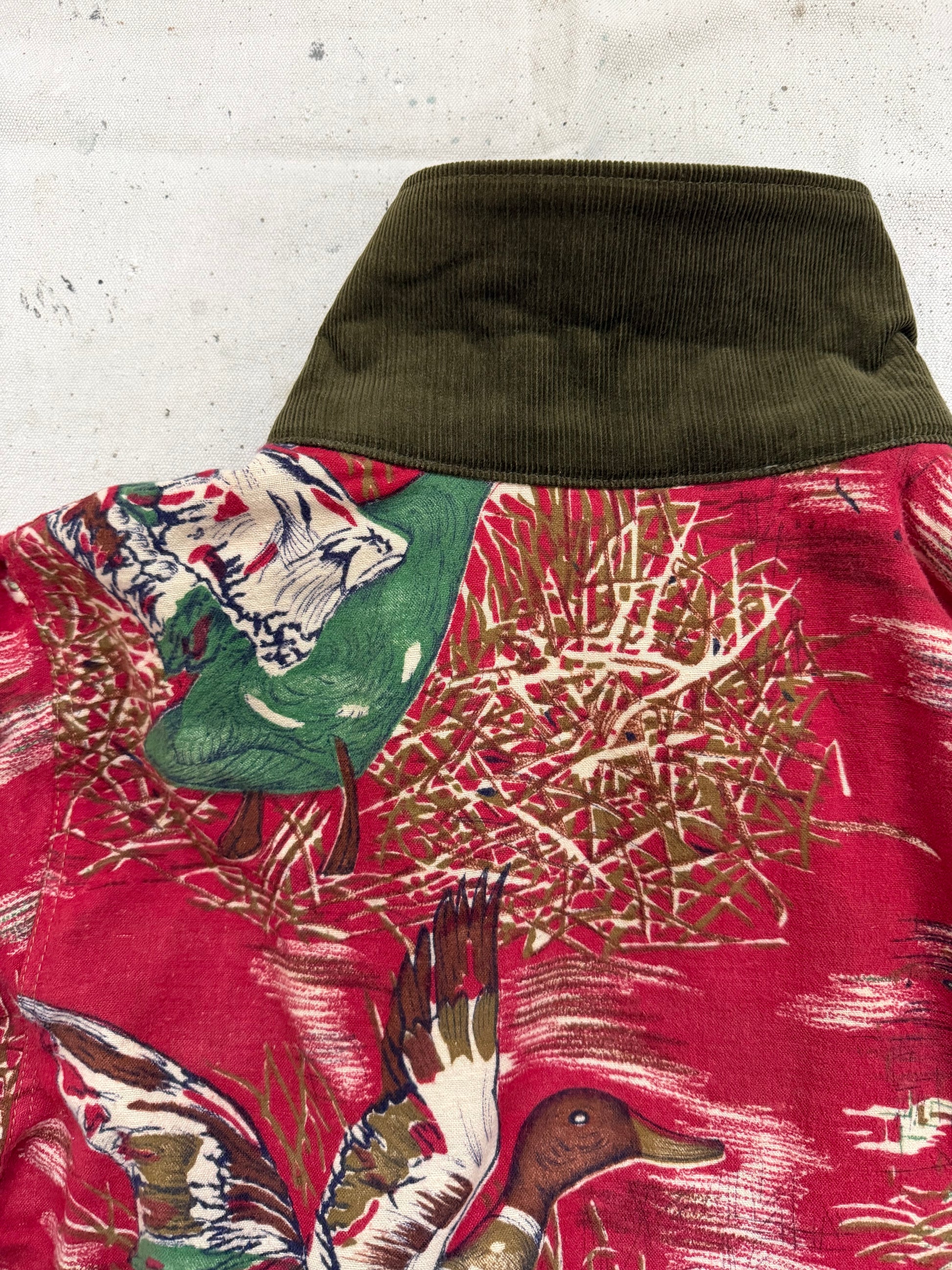 Handmade, one of a kind jacket made out of a 1970s sleeping bag that I deconstructed. Soft, 100% cotton brushed flannel with an incredible mallard duck scene. Lined with a lightweight cotton that was once the outer fabric of the sleeping bag. Beautiful maroon, green, and brown colors.