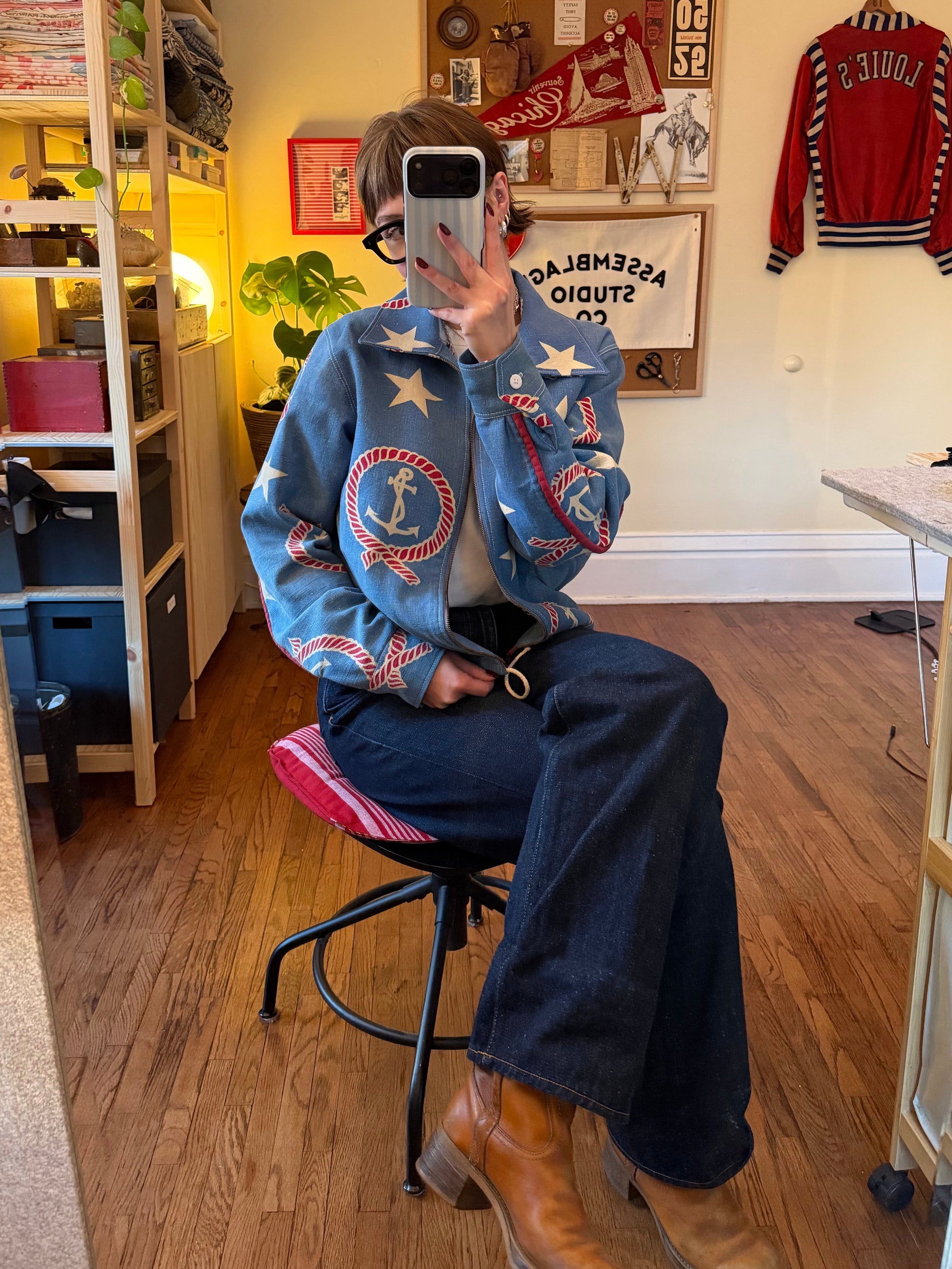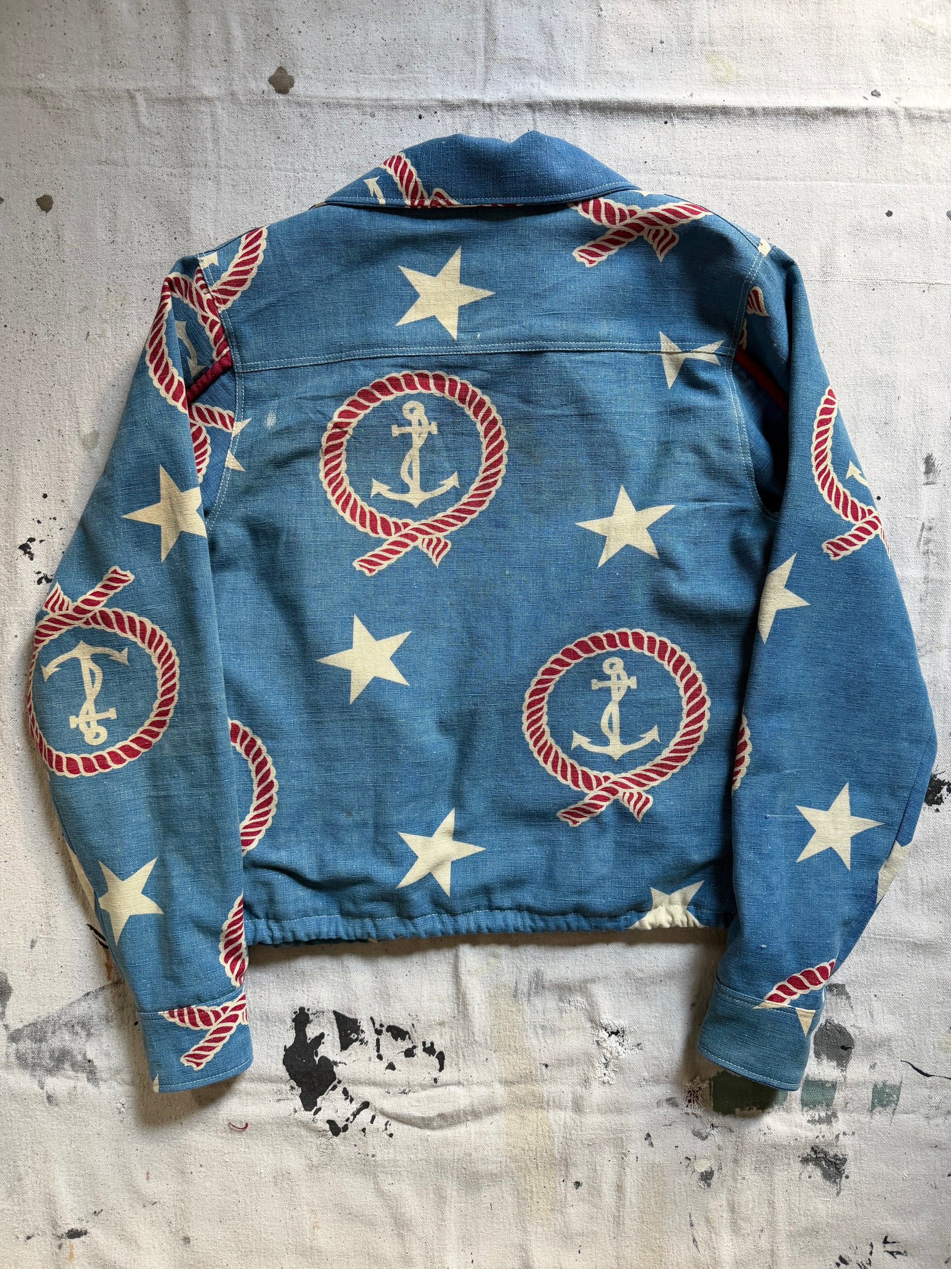 Handmade, one of a kind jacket made out of vintage nautical fabric that was once a bedspread! It is from the 1950s. Is a mid-lightweight cotton and is lined with a striped cotton.