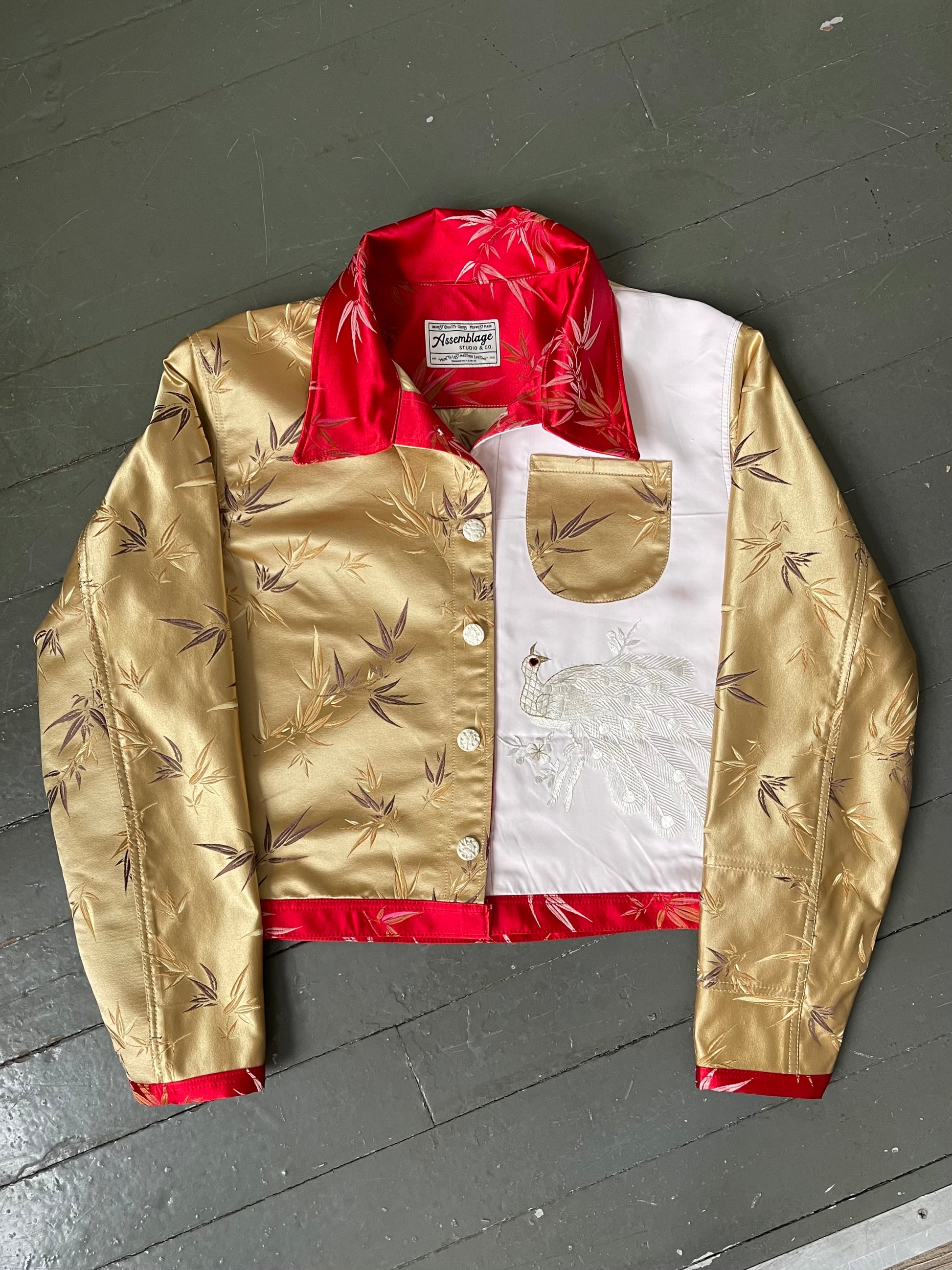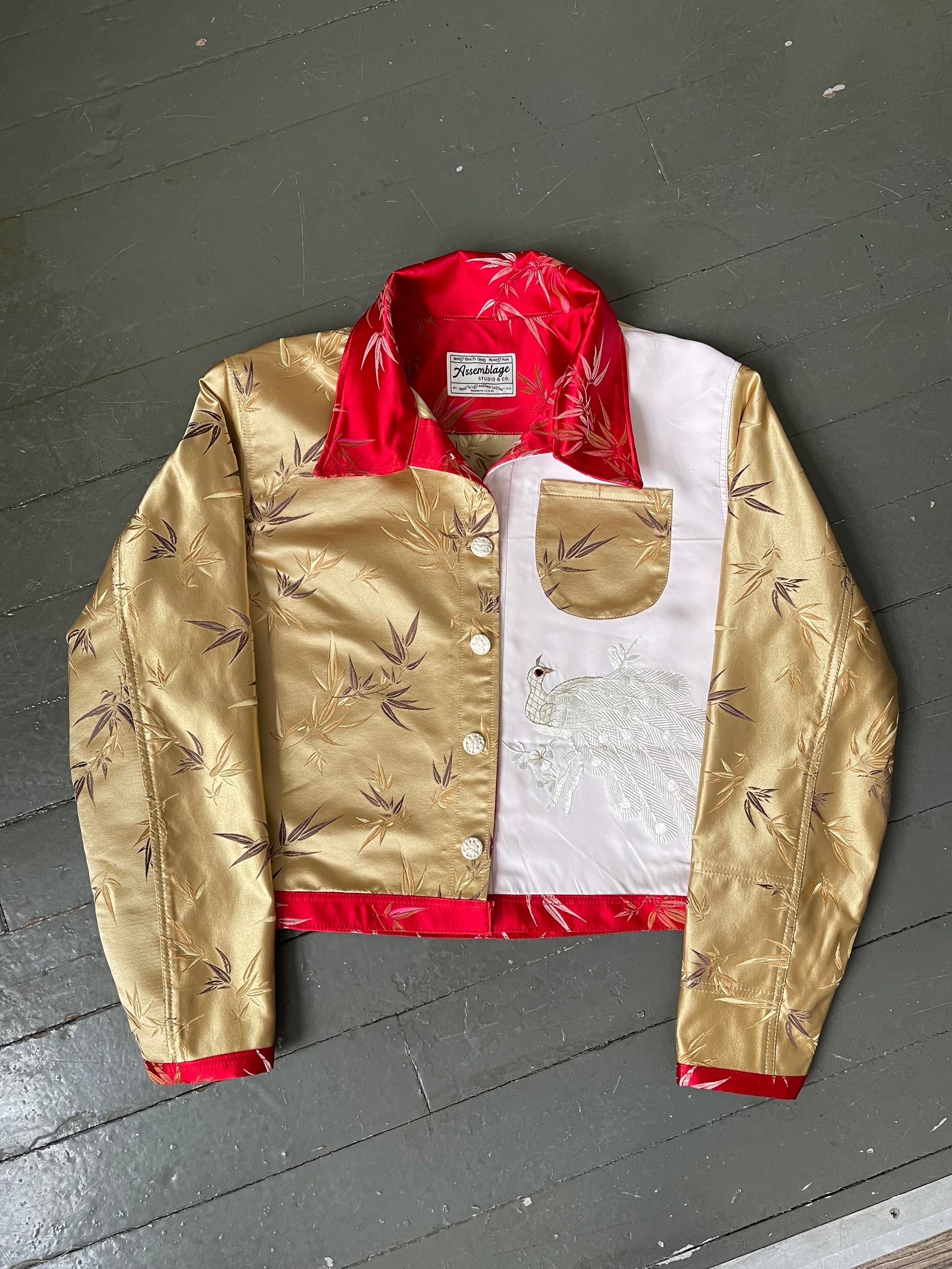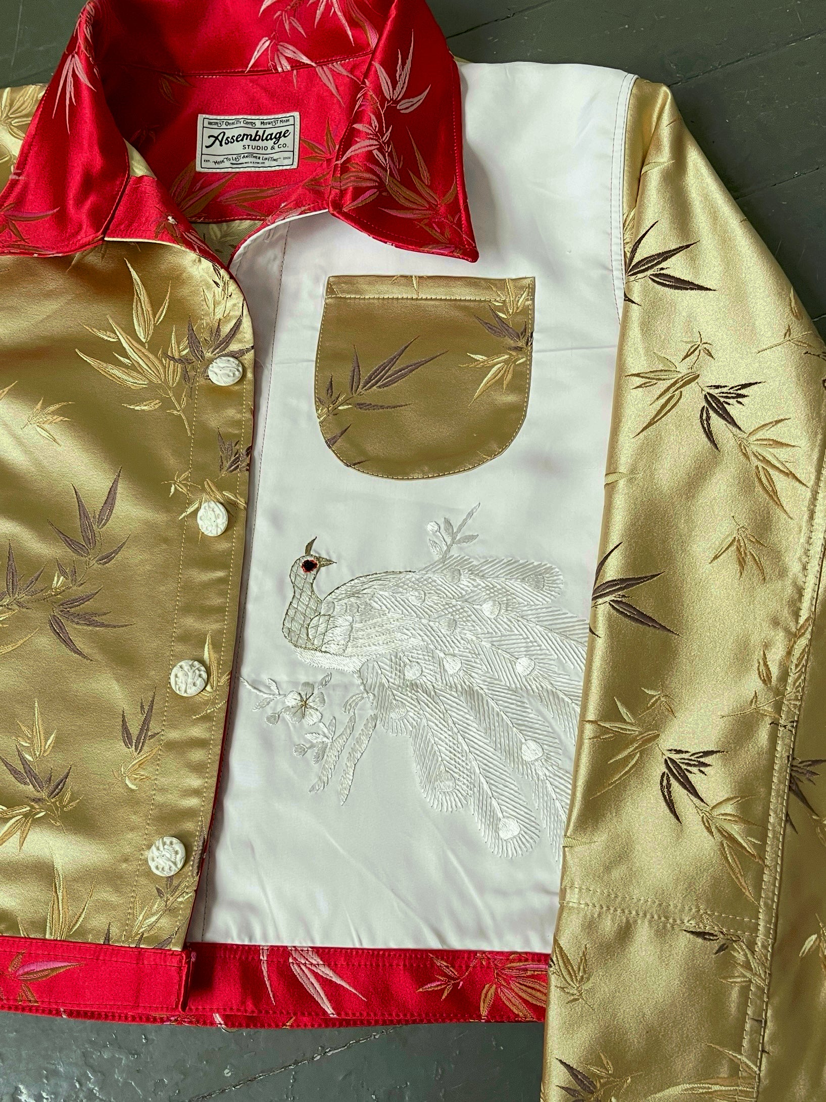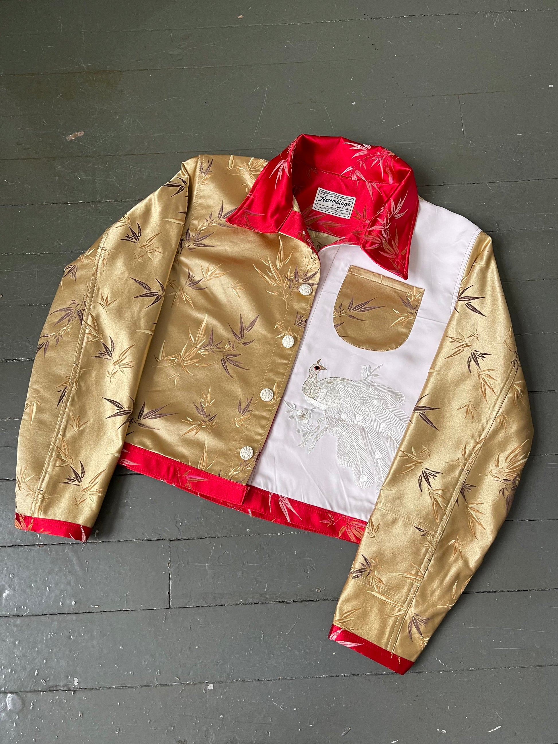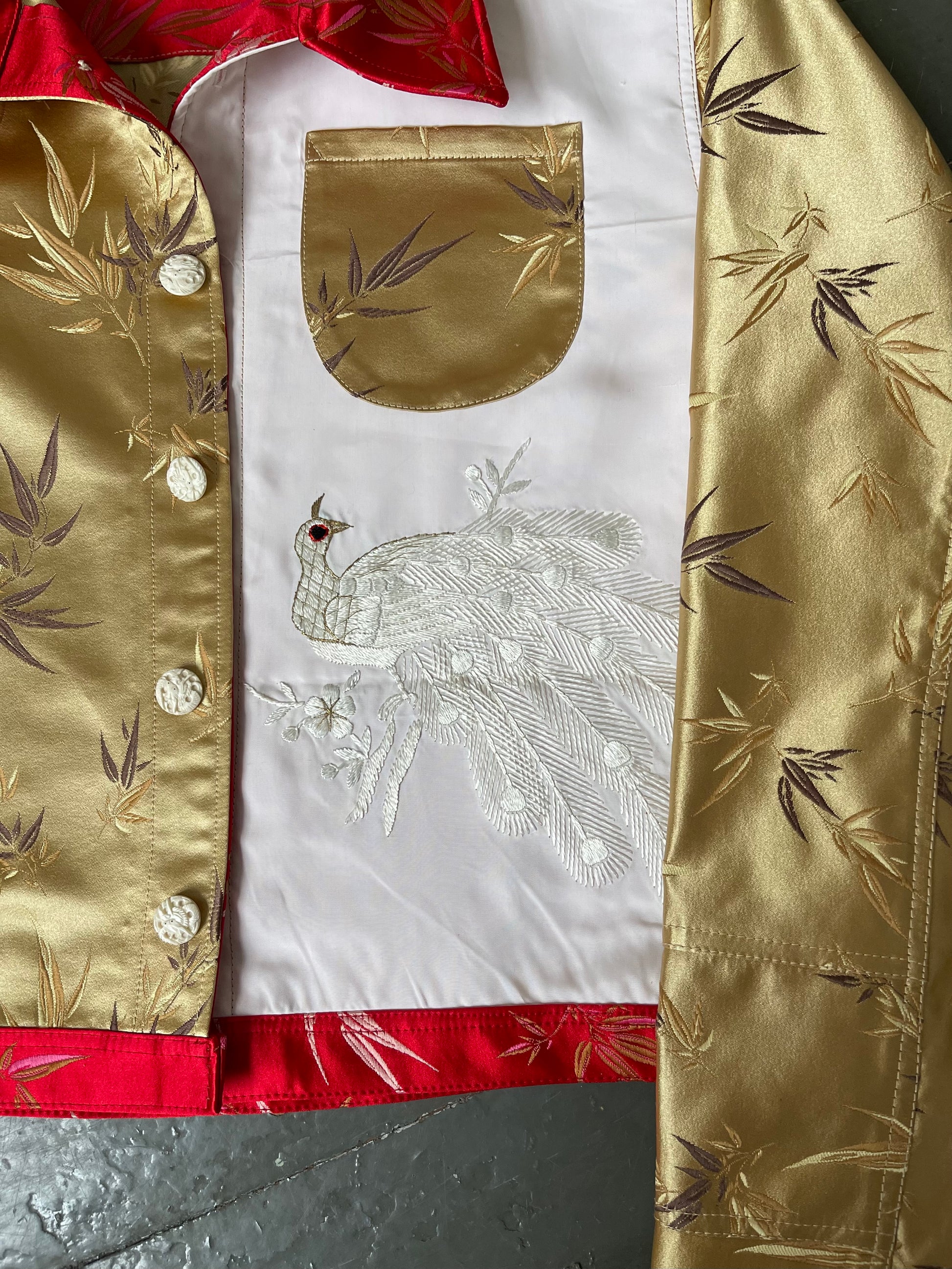 Made from vintage satin jacquard fabric in gold and red. Super smooth with a gorgeous shine in the light. The white portion was made from a 1950s rayon scarf from Japan, with an incredible silk peacock embroidery.