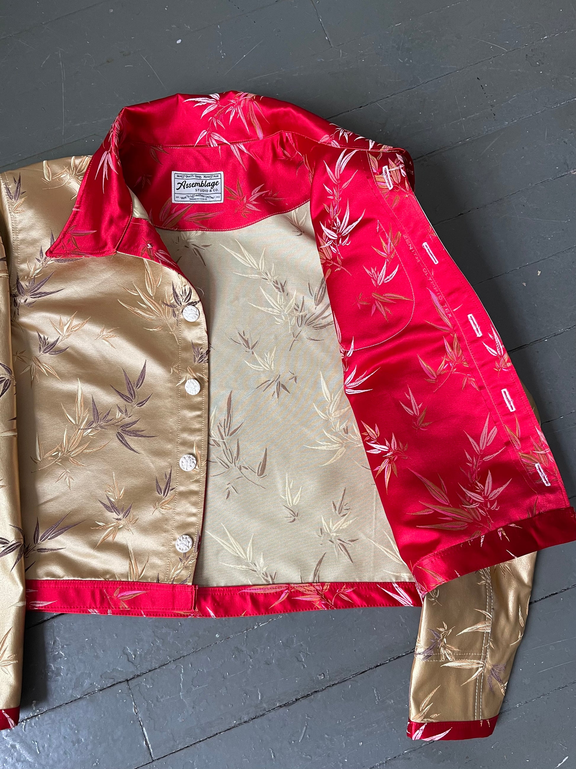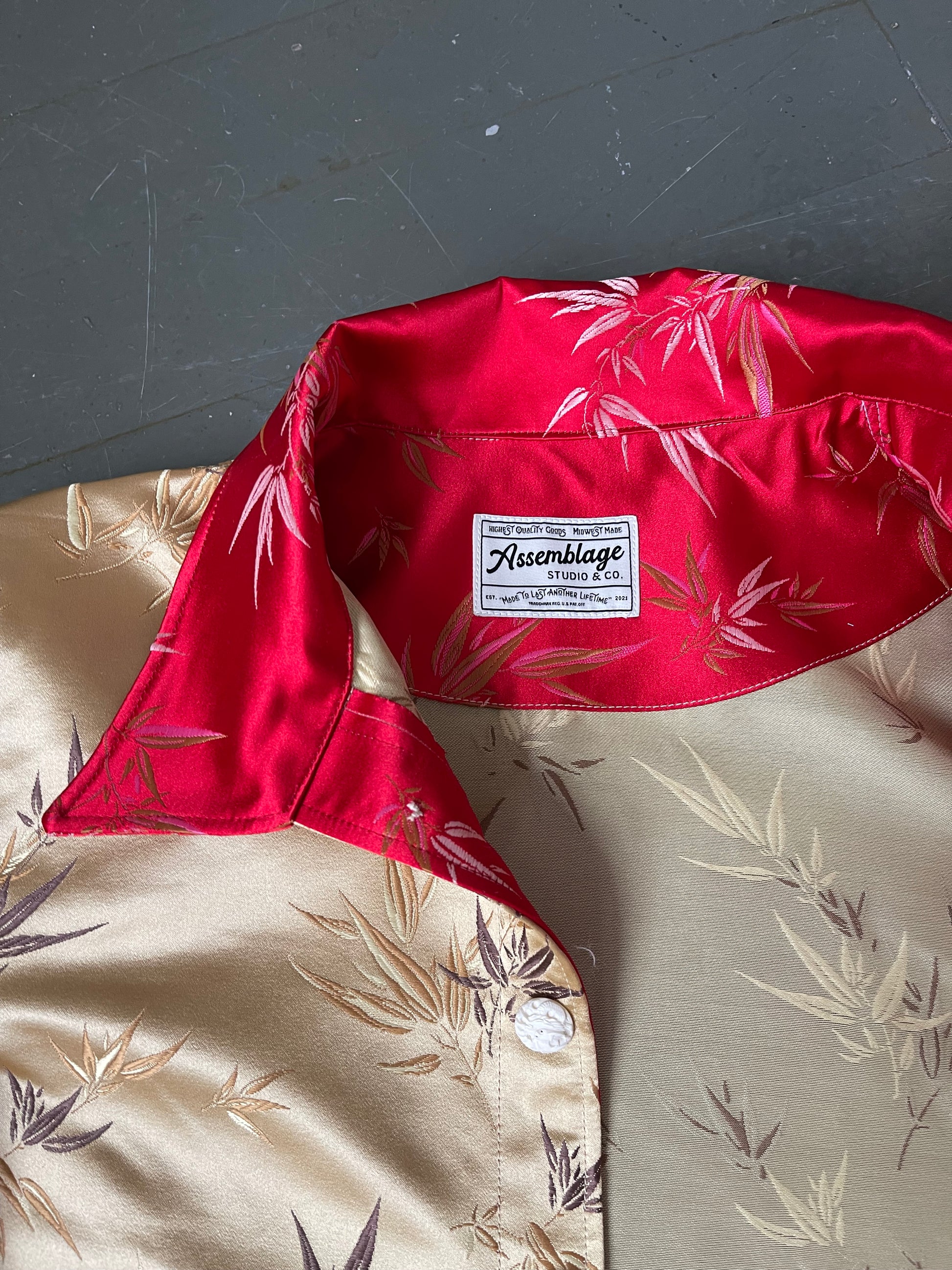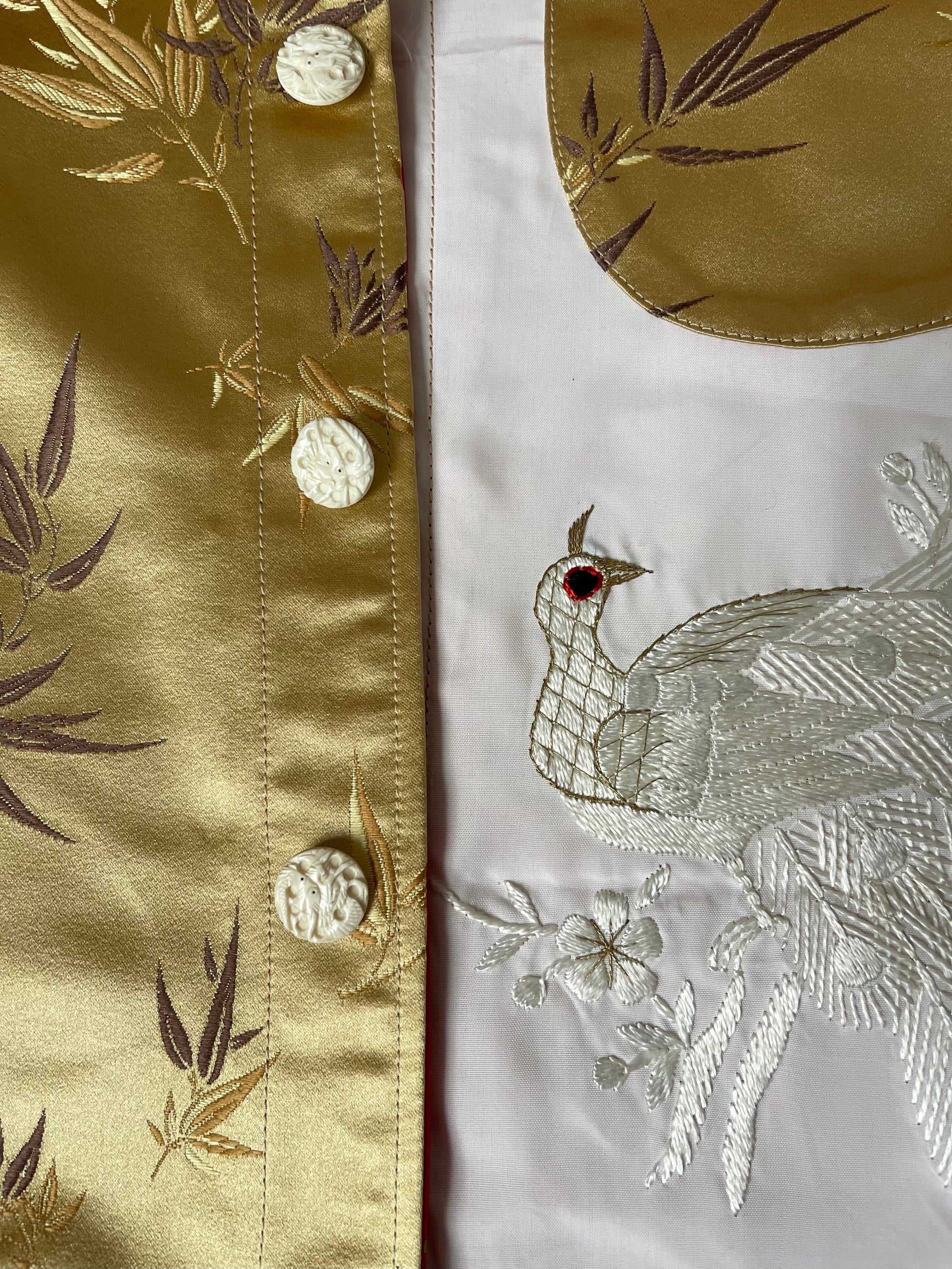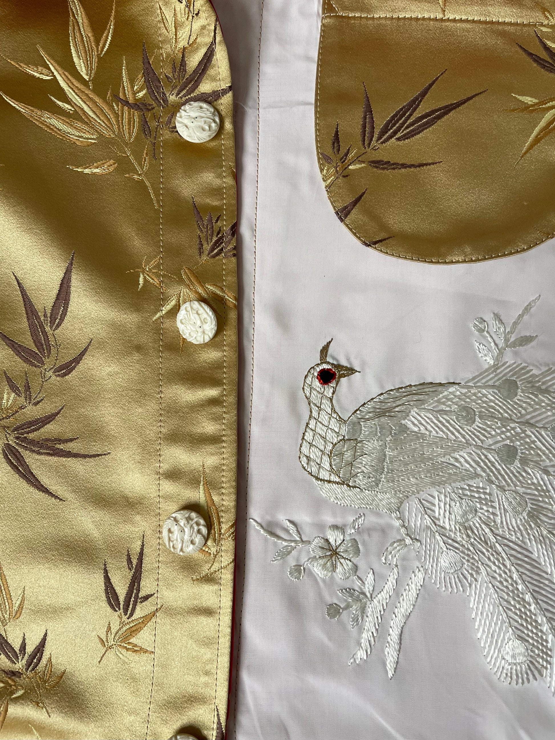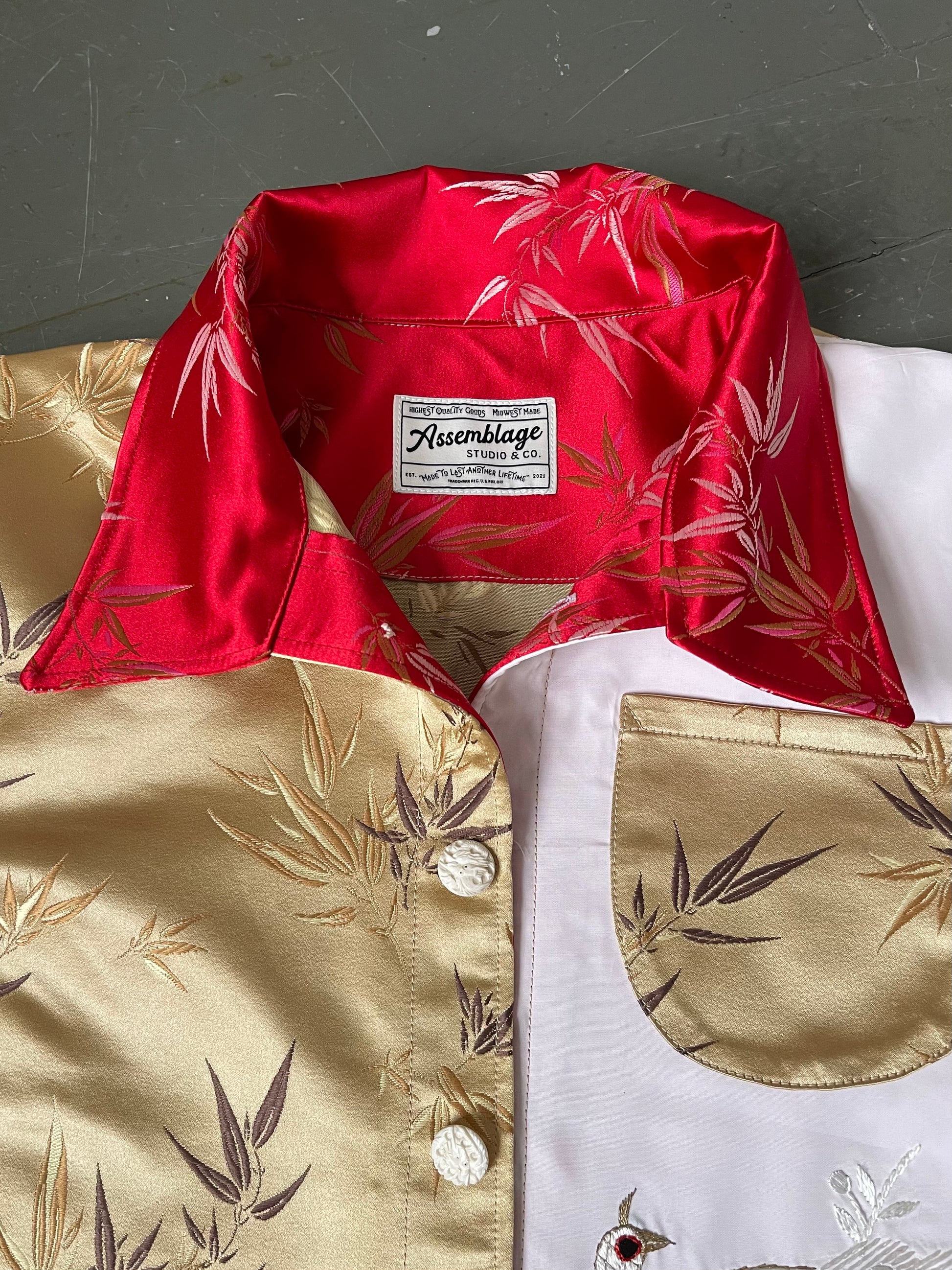 Made from vintage satin jacquard fabric in gold and red. Super smooth with a gorgeous shine in the light. The white portion was made from a 1950s rayon scarf from Japan, with an incredible silk peacock embroidery.