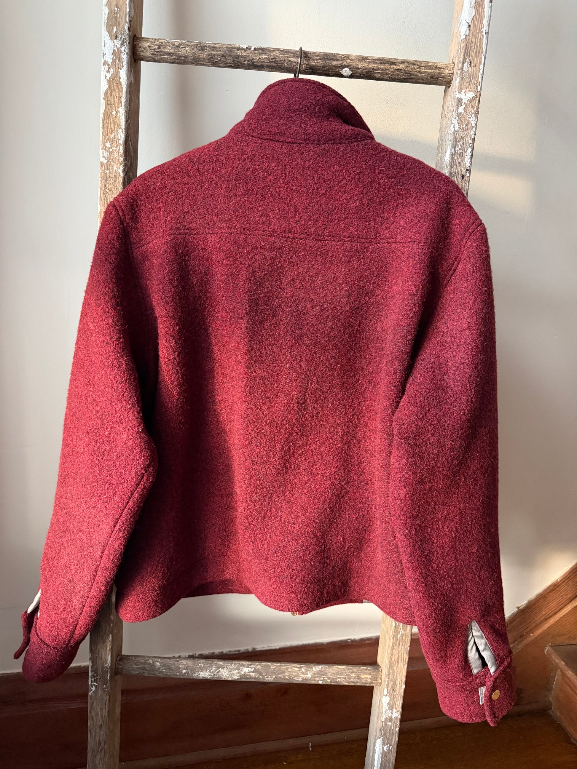 Handmade, one of a kind jacket made out of a vintage 100% wool blanket. It is lined with a cotton blend twill. Antique felt letter patch and striped detail. Maroon and gray with a brass zipper and snaps.
