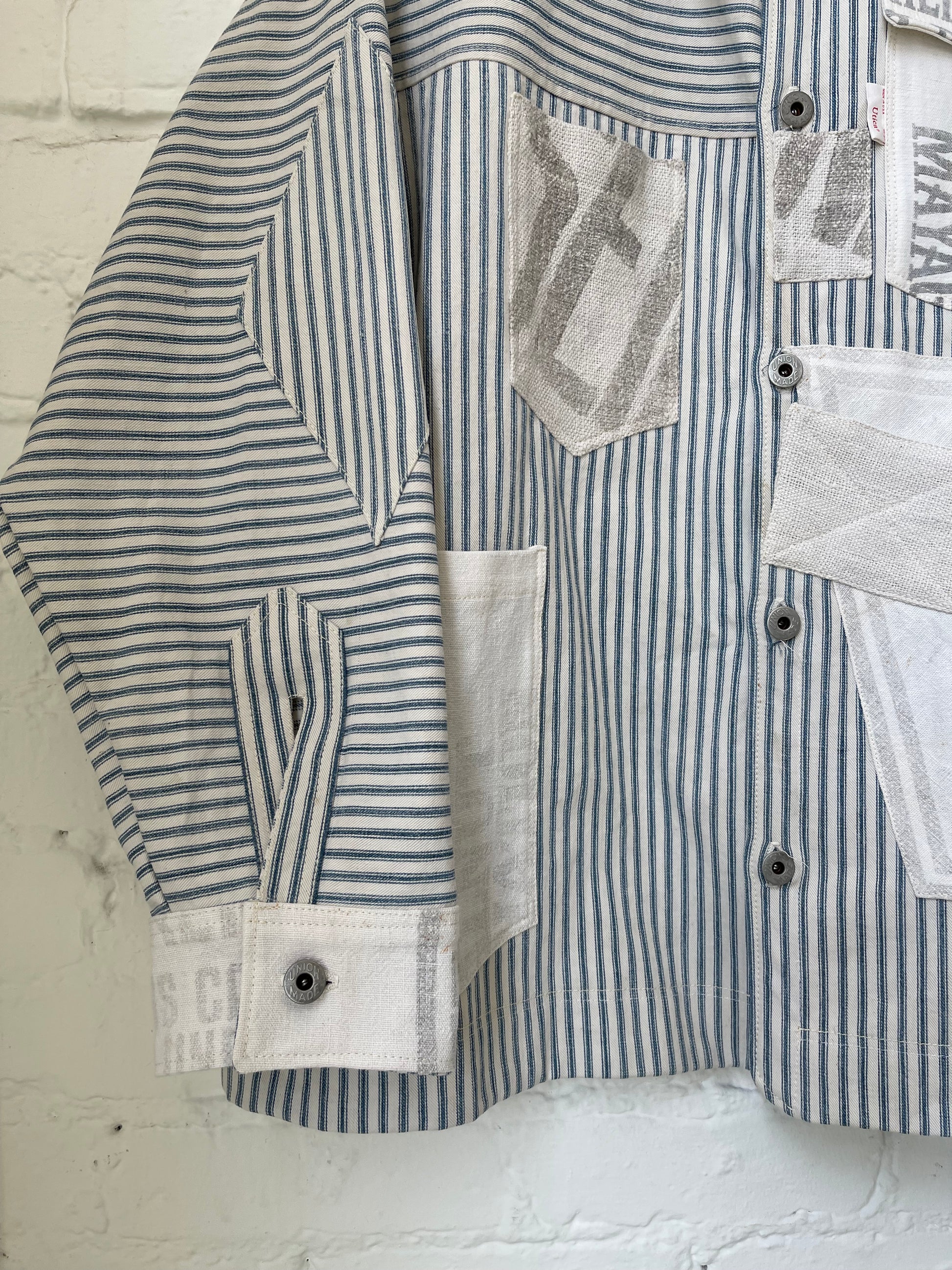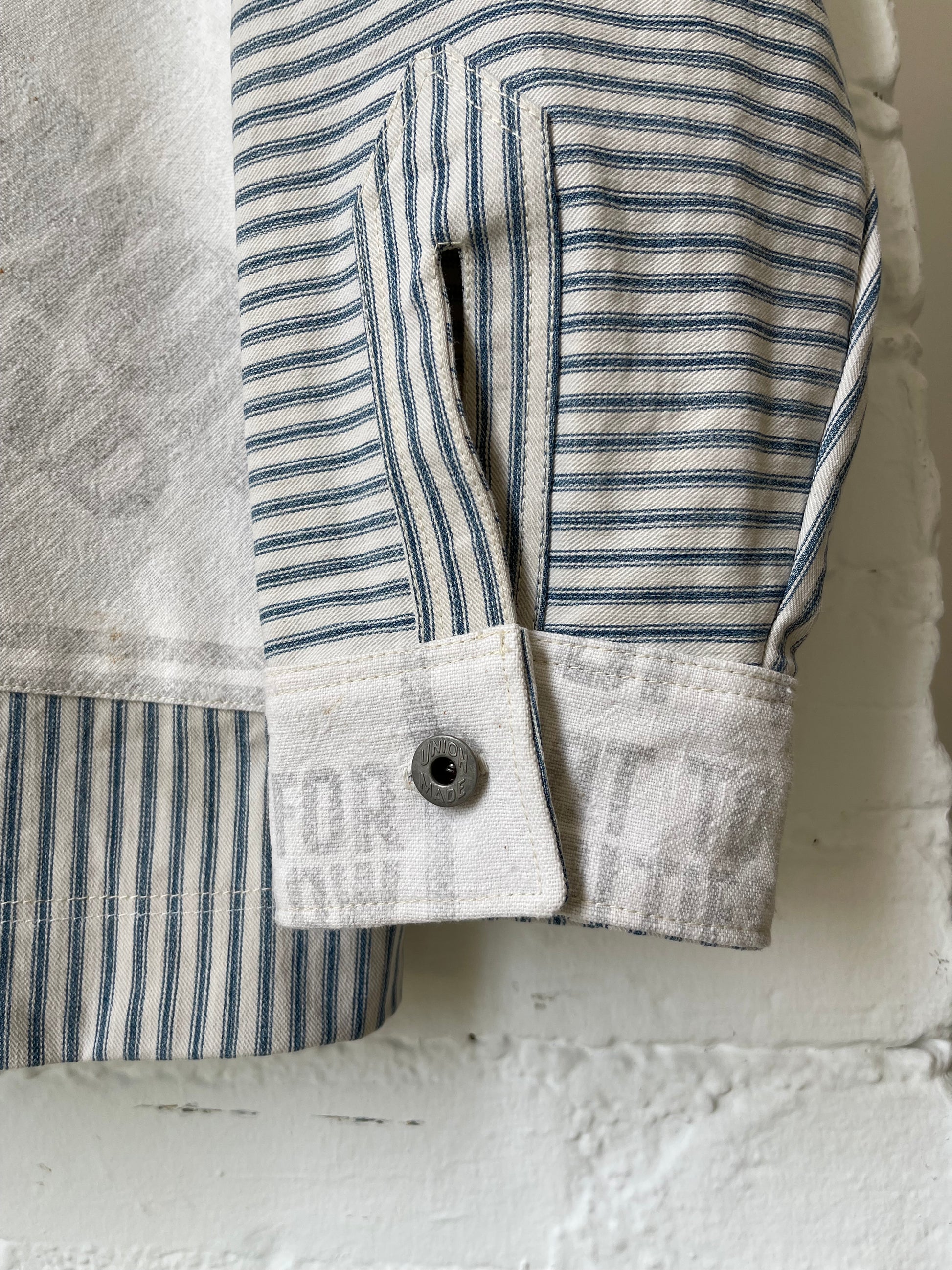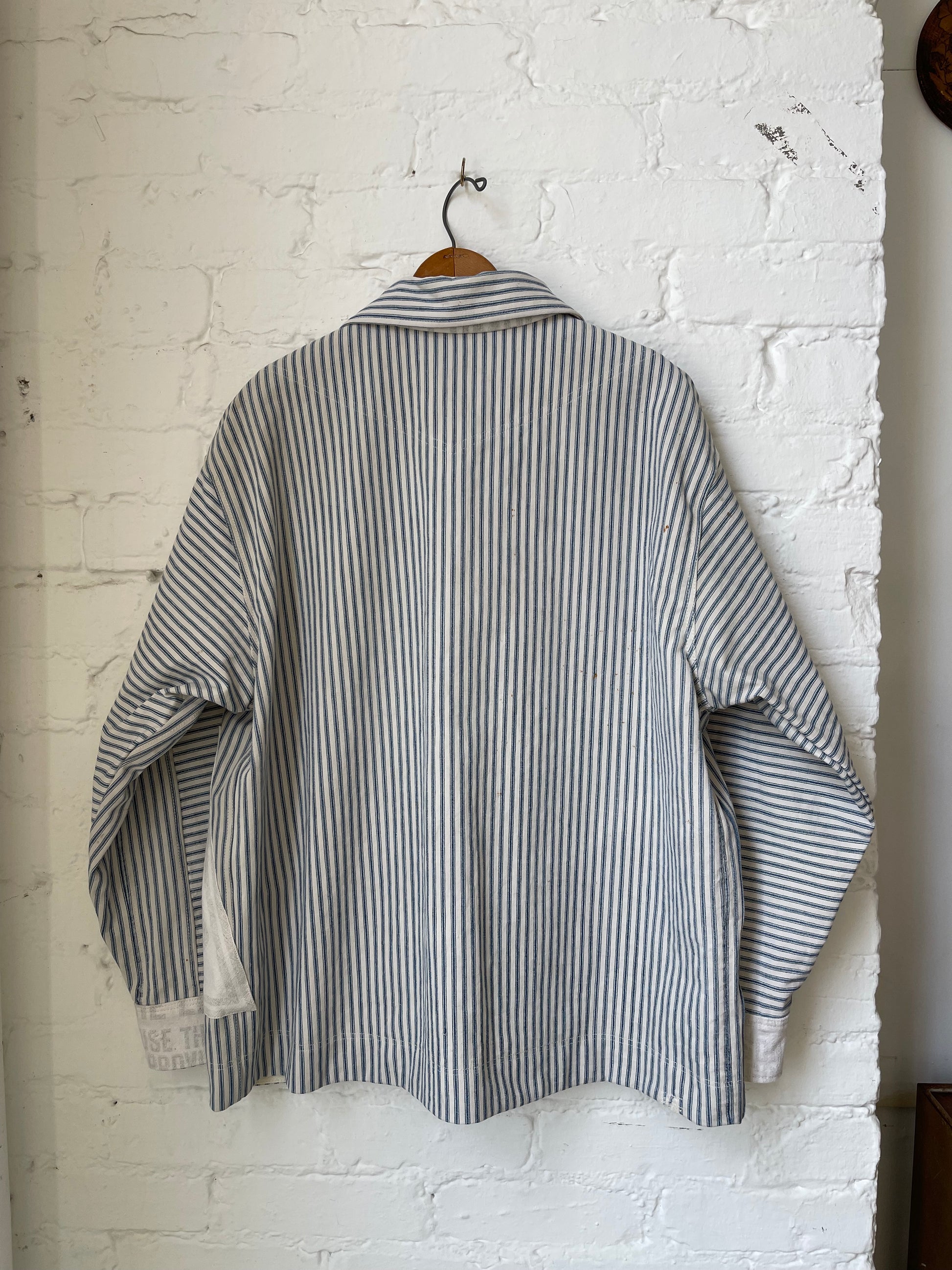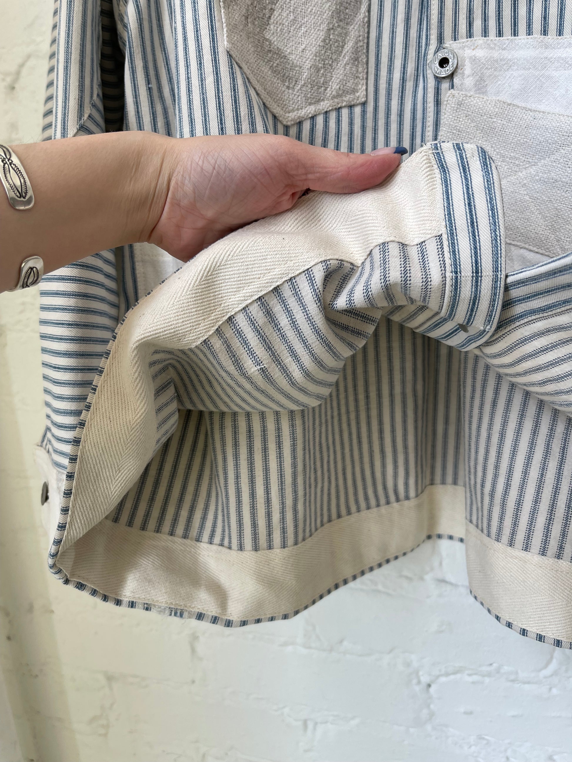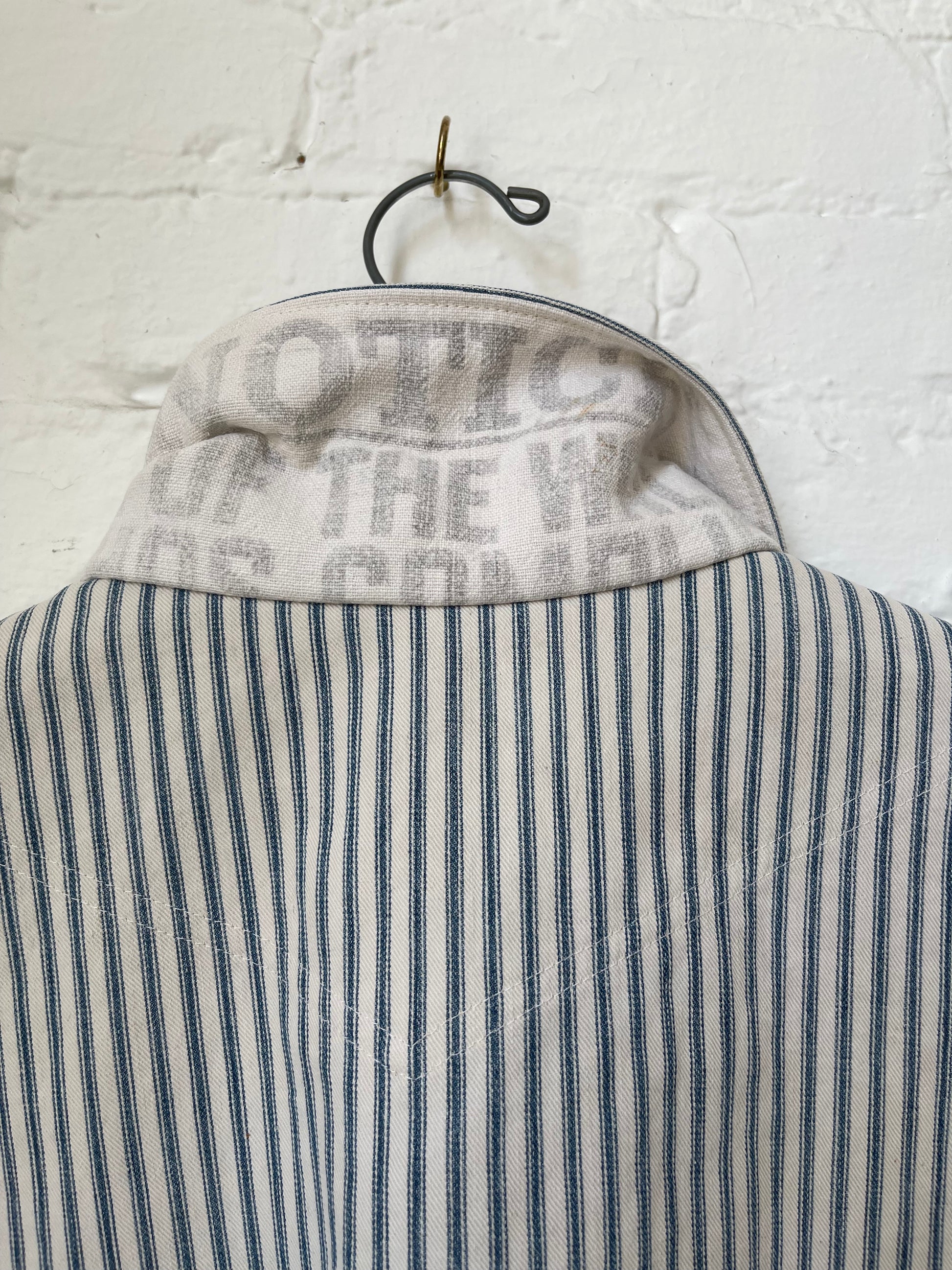 Handmade, one of a kind engineer coat made from antique ticking fabric that had been made into a mattress cover. I kept all of the original irregular panels as they were, which is why the stripes are in multiple directions. The pockets were made from another antique mattress cover, this one made from feedsacks.
