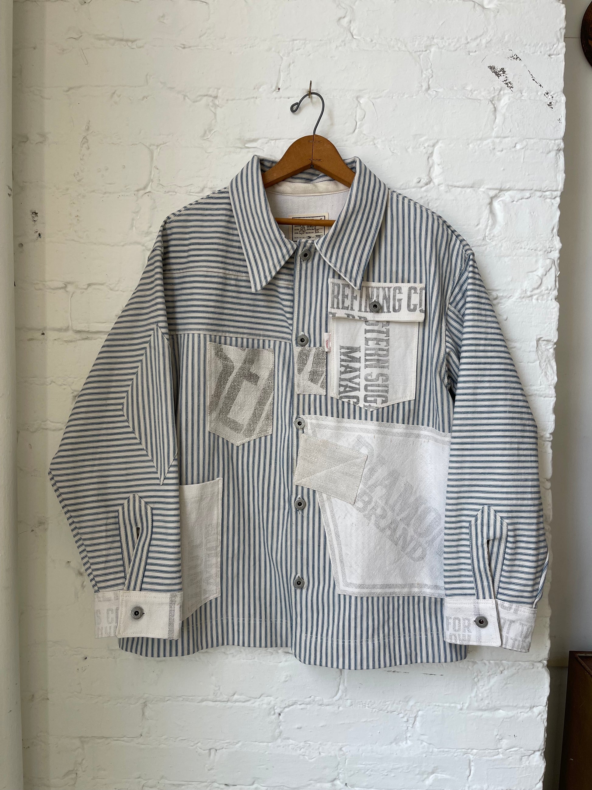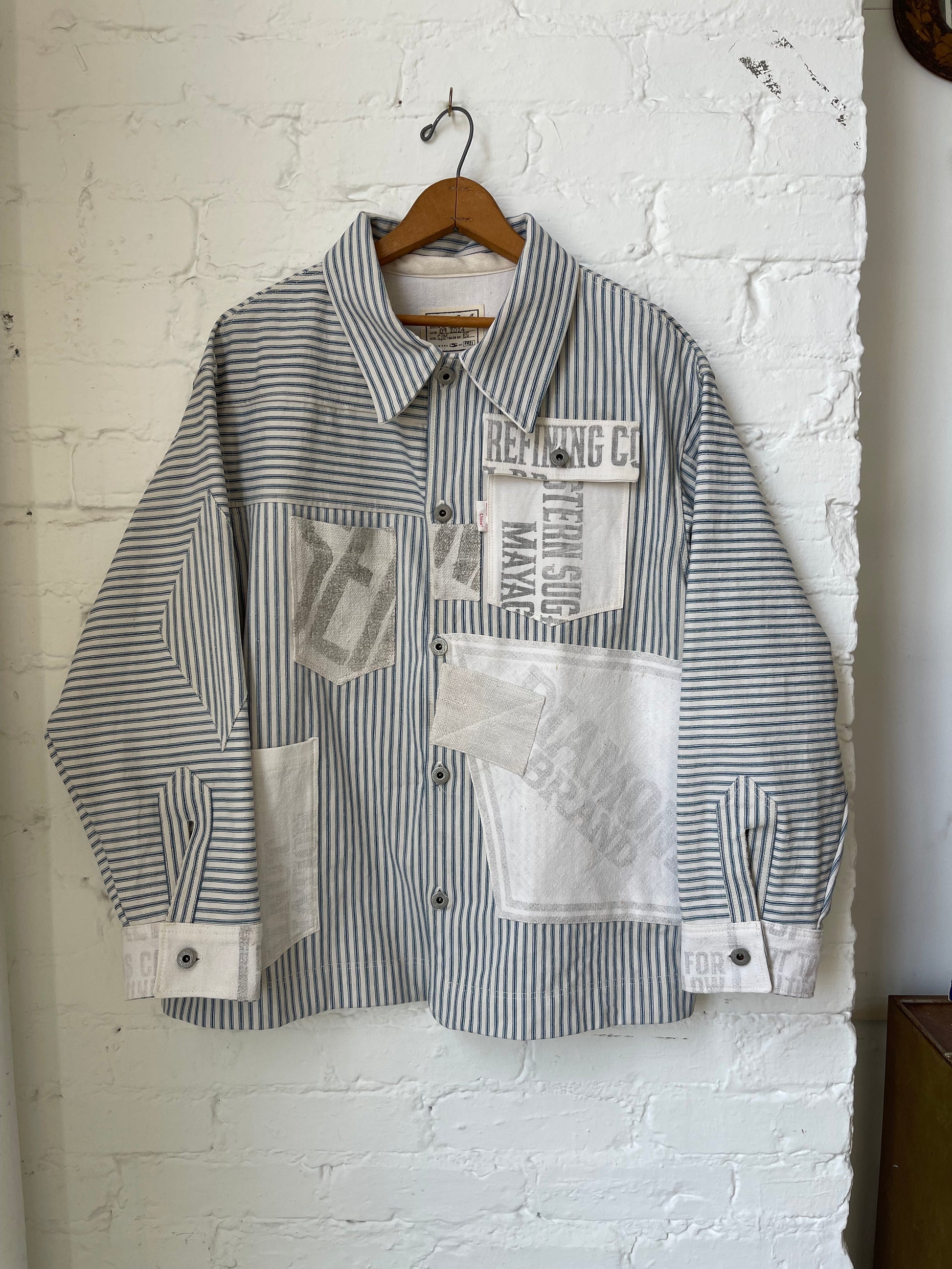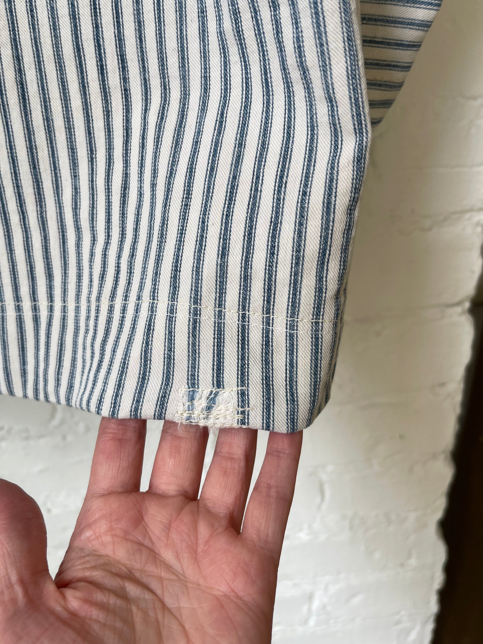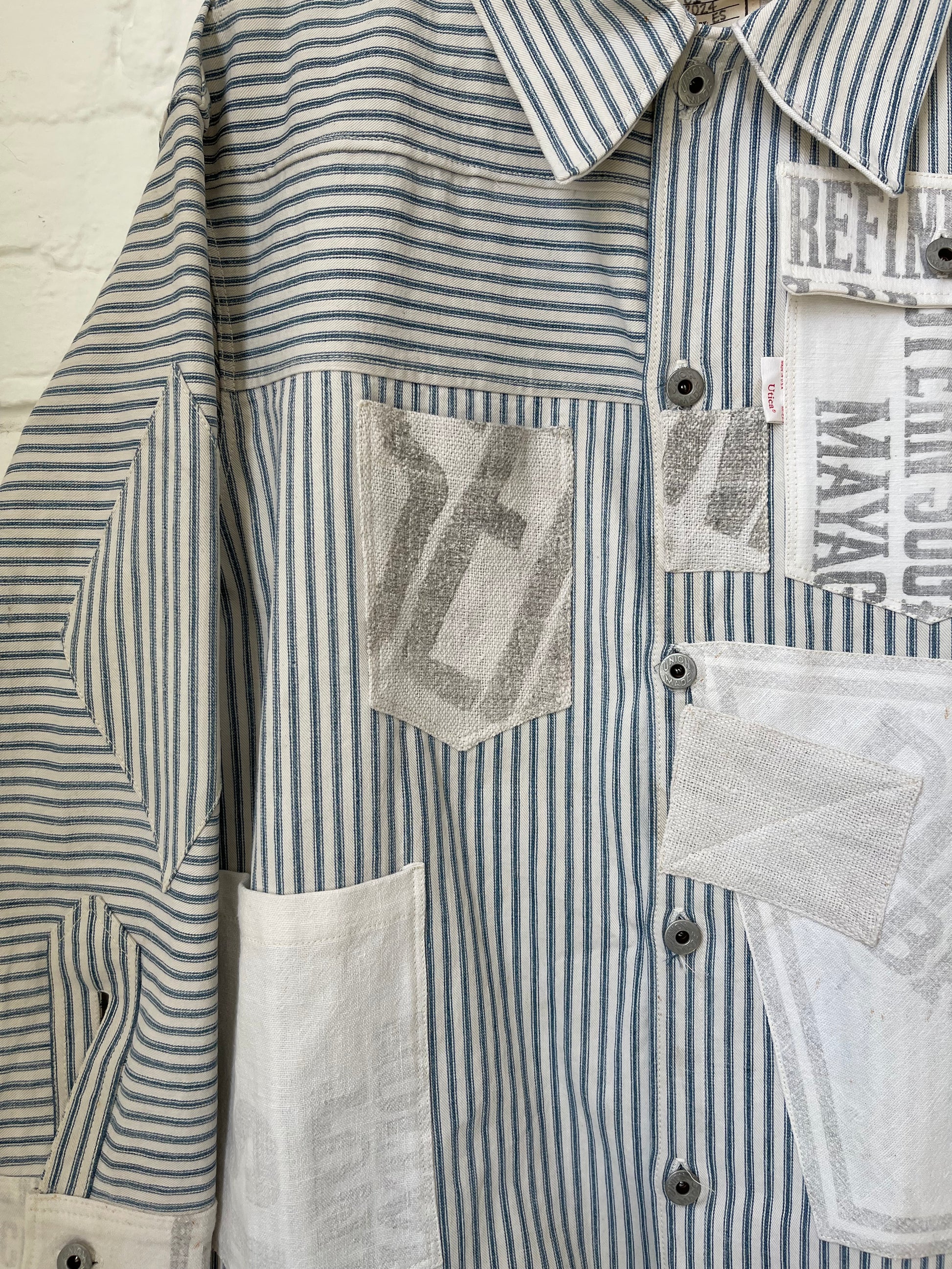 Handmade, one of a kind engineer coat made from antique ticking fabric that had been made into a mattress cover. I kept all of the original irregular panels as they were, which is why the stripes are in multiple directions. The pockets were made from another antique mattress cover, this one made from feedsacks.