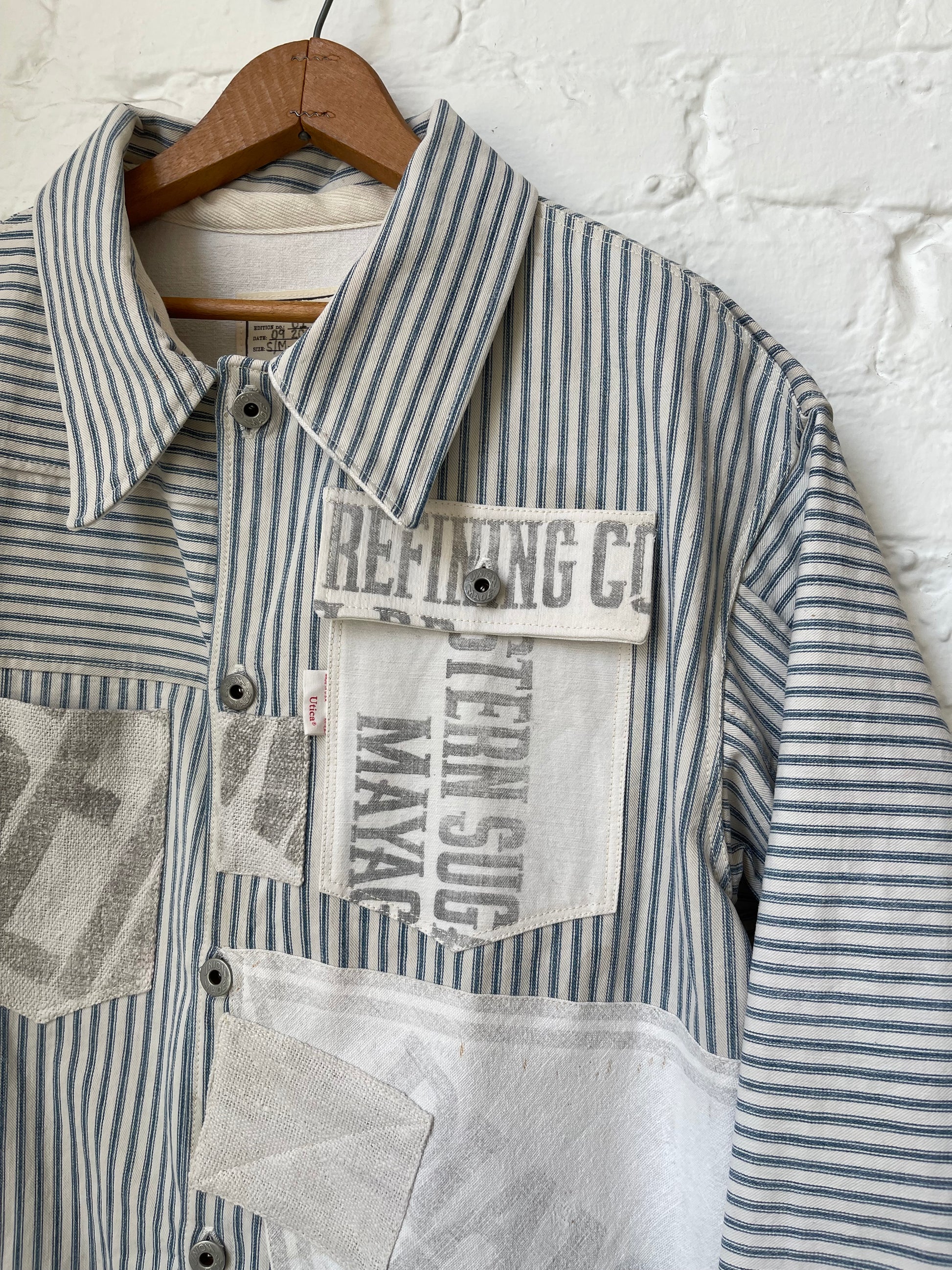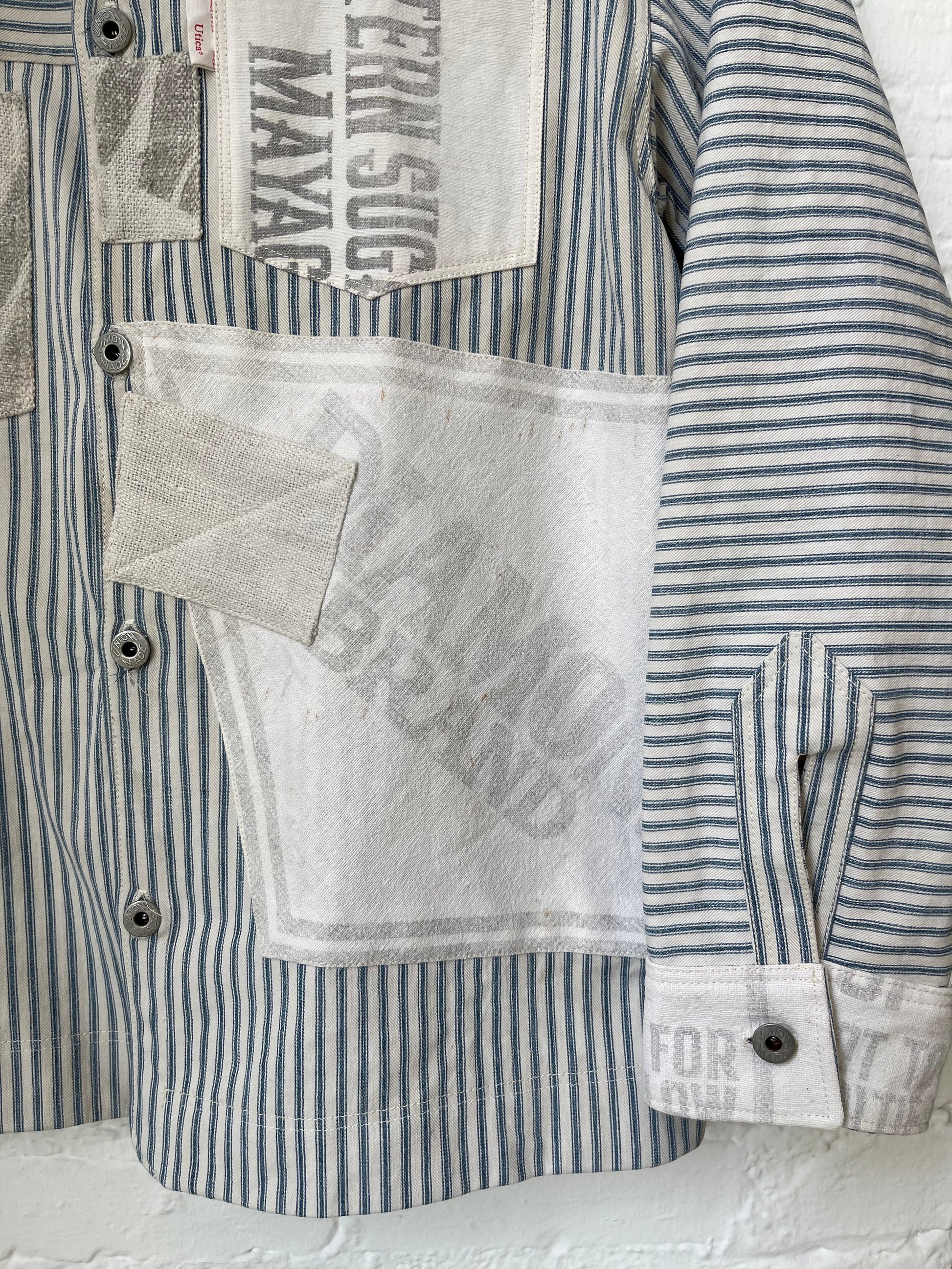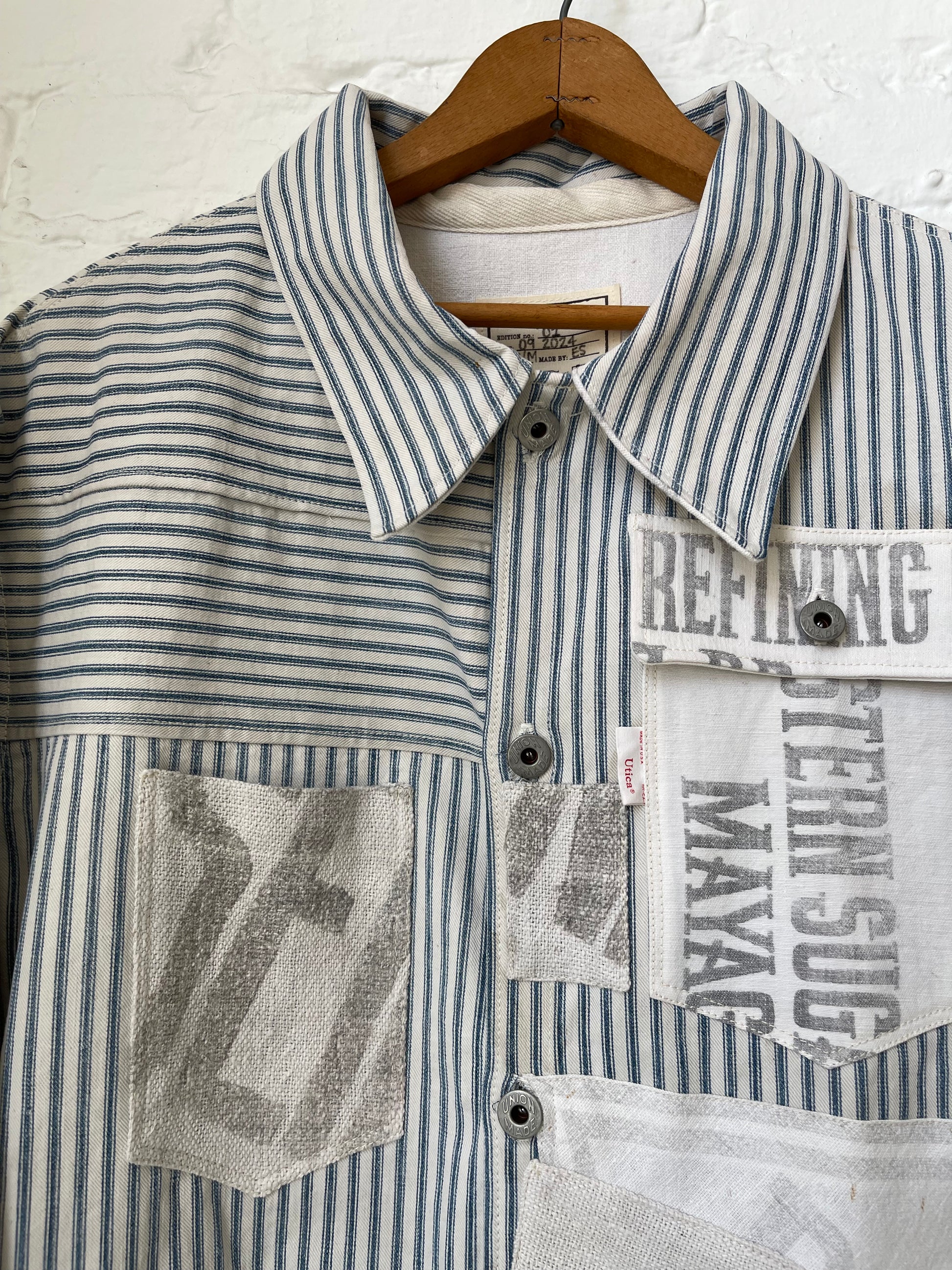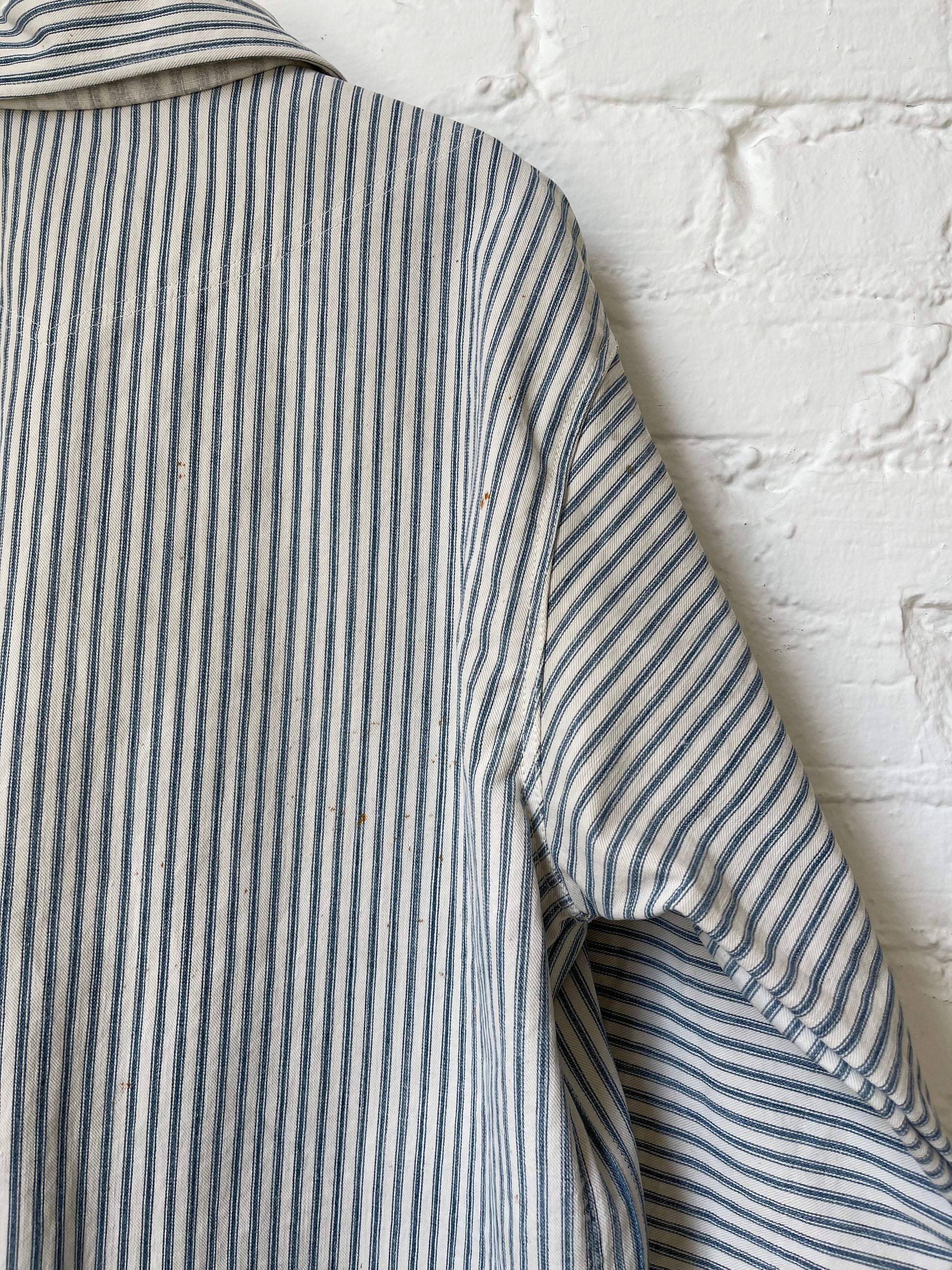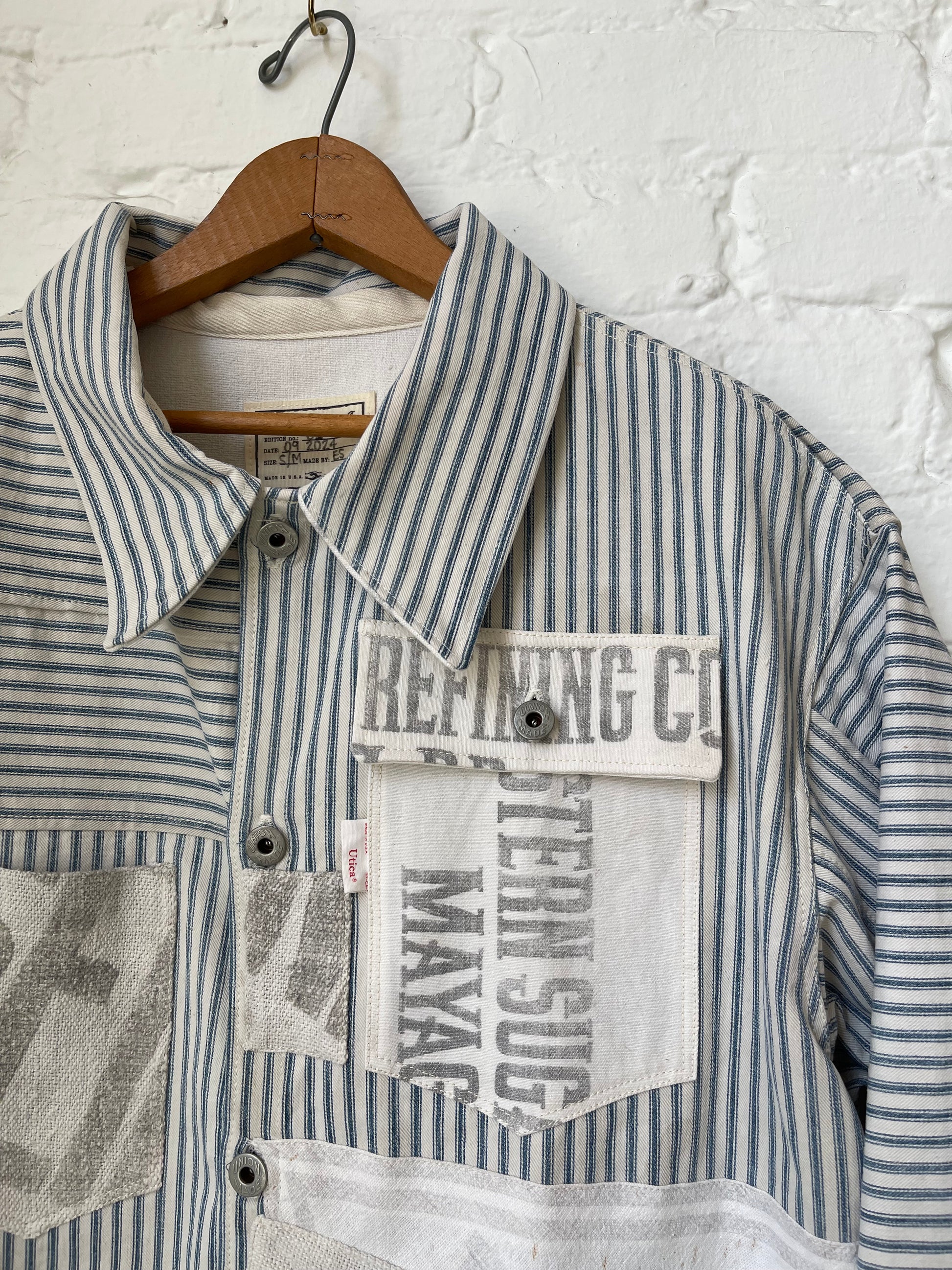 Handmade, one of a kind engineer coat made from antique ticking fabric that had been made into a mattress cover. I kept all of the original irregular panels as they were, which is why the stripes are in multiple directions. The pockets were made from another antique mattress cover, this one made from feedsacks.