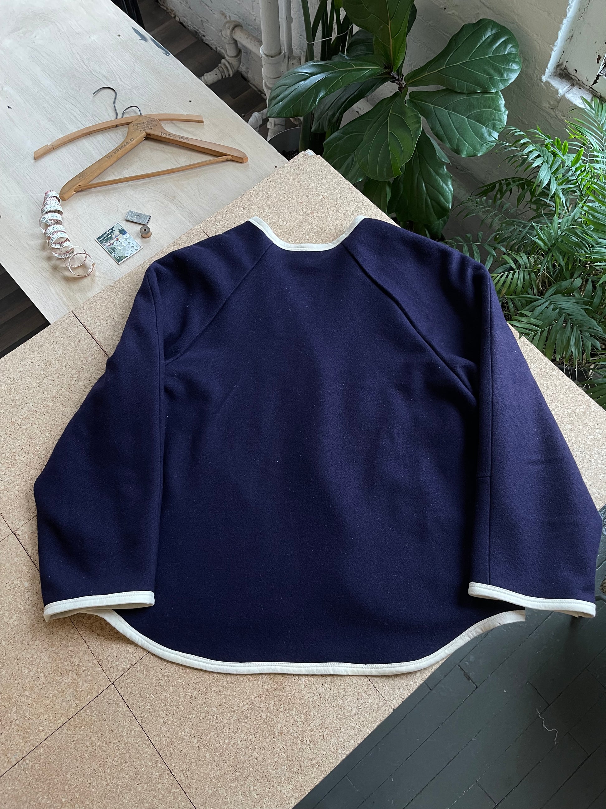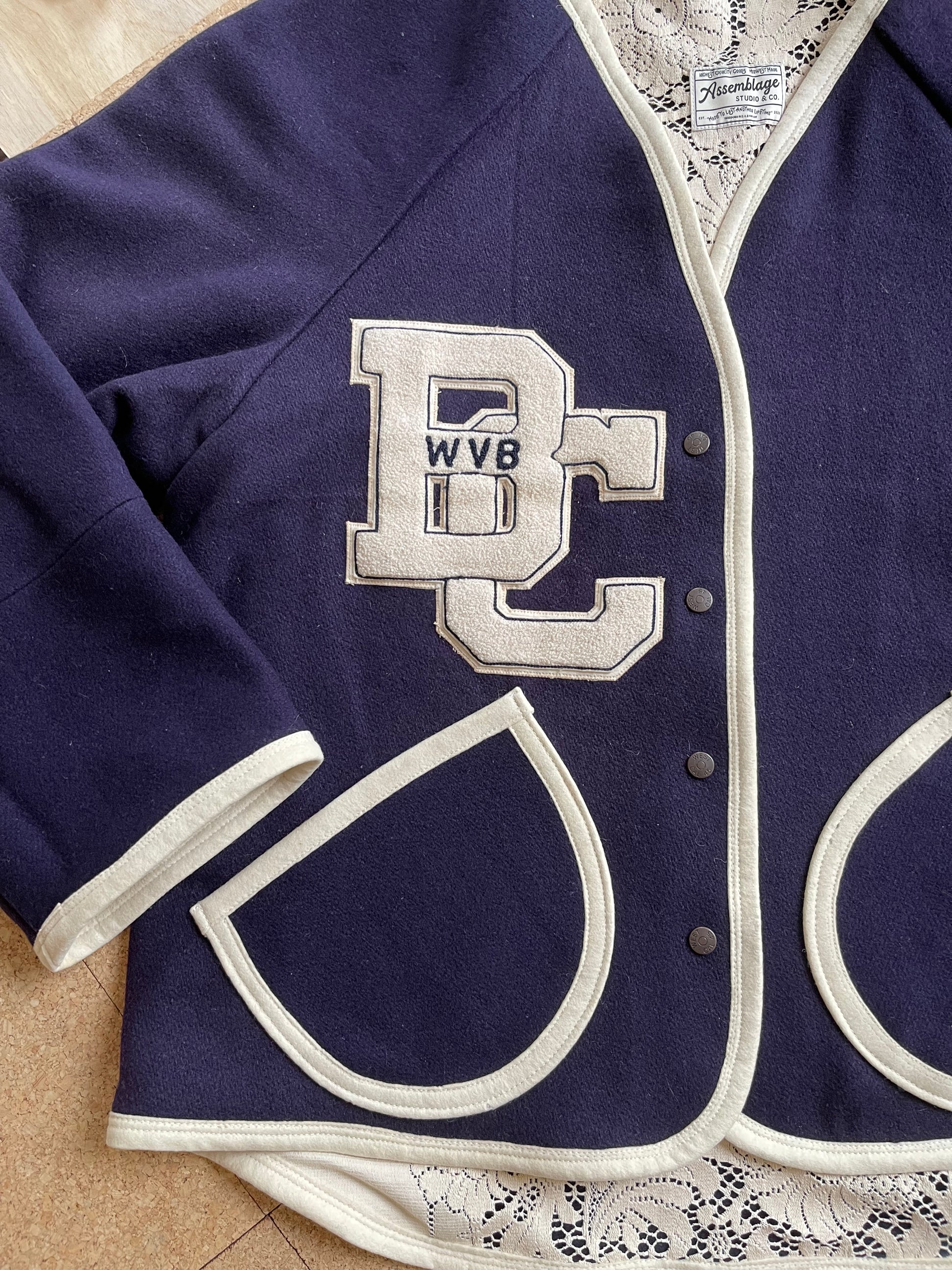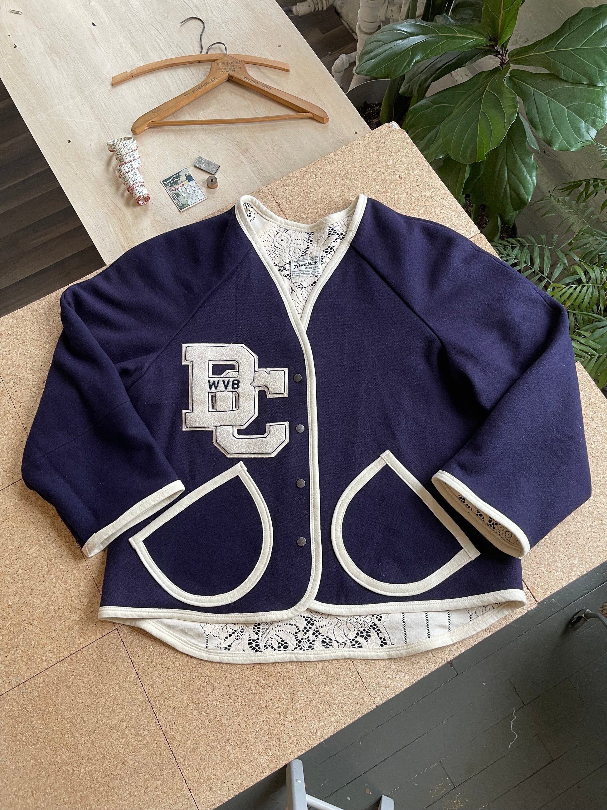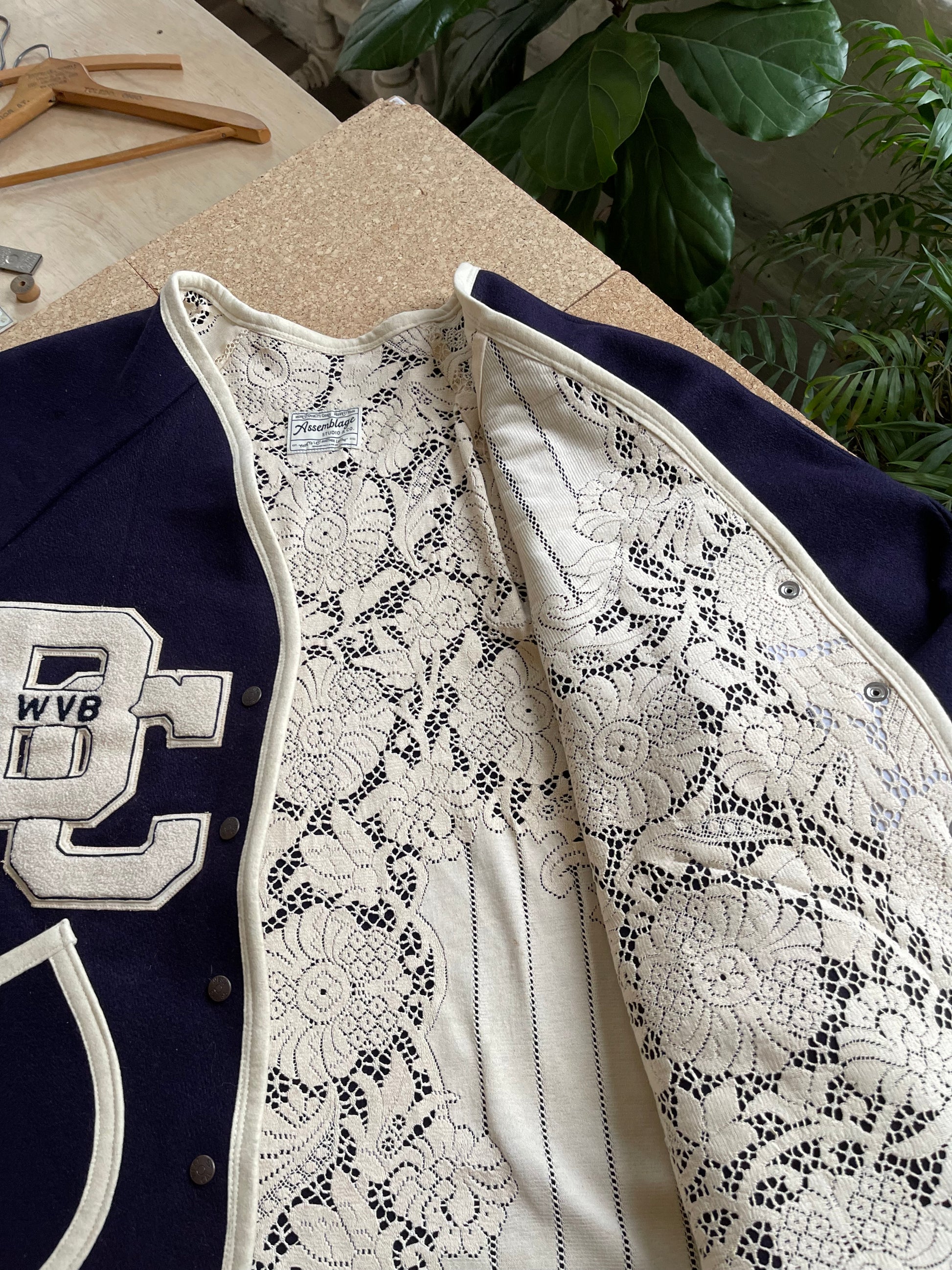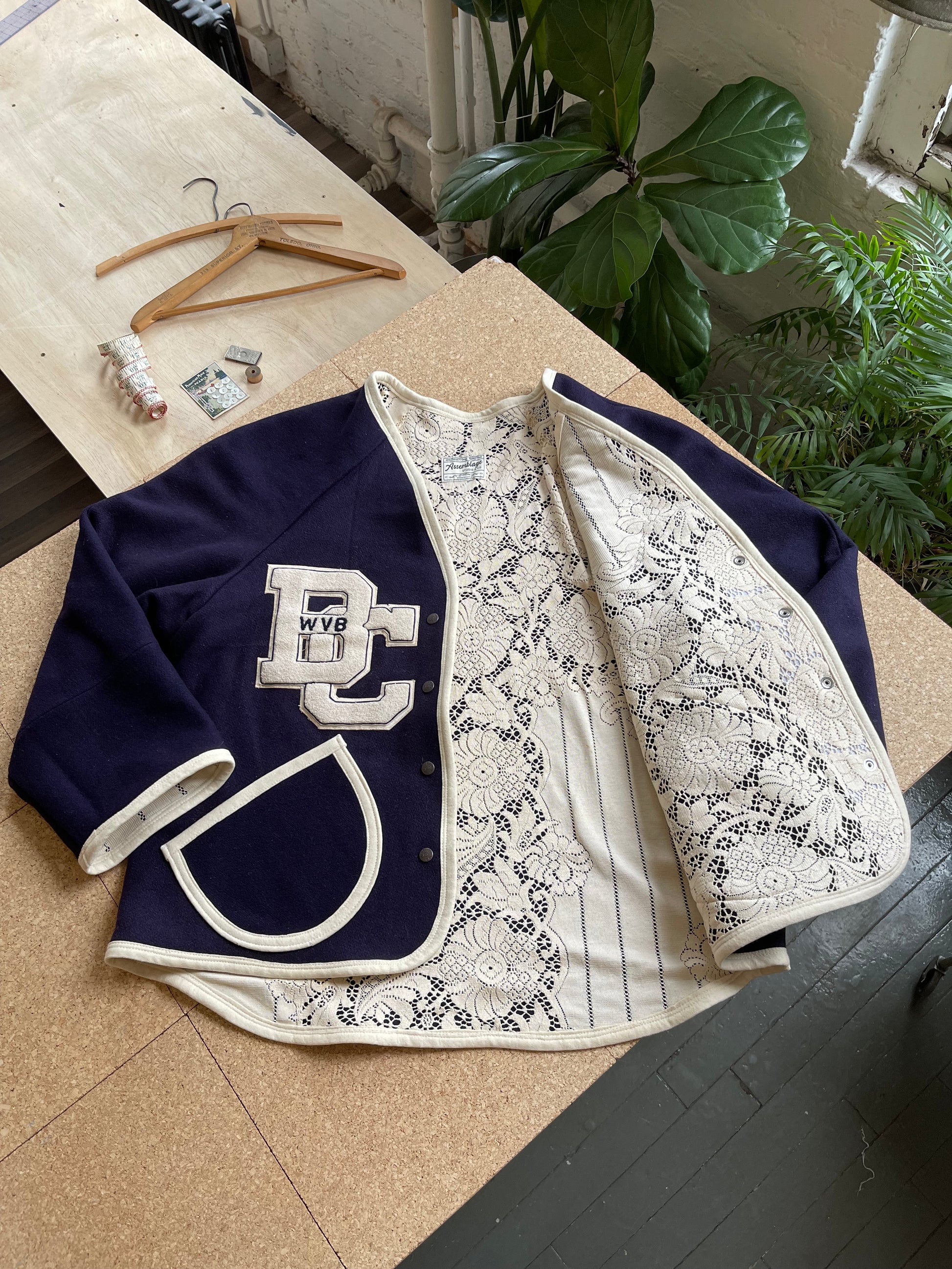 Handmade, one of a kind cardigan style jacket. Made from a vintage navy blue wool stadium blanket from the 1940s-50s. The lining is made out of a vintage quaker lace tablecloth with gorgeous floral motifs.